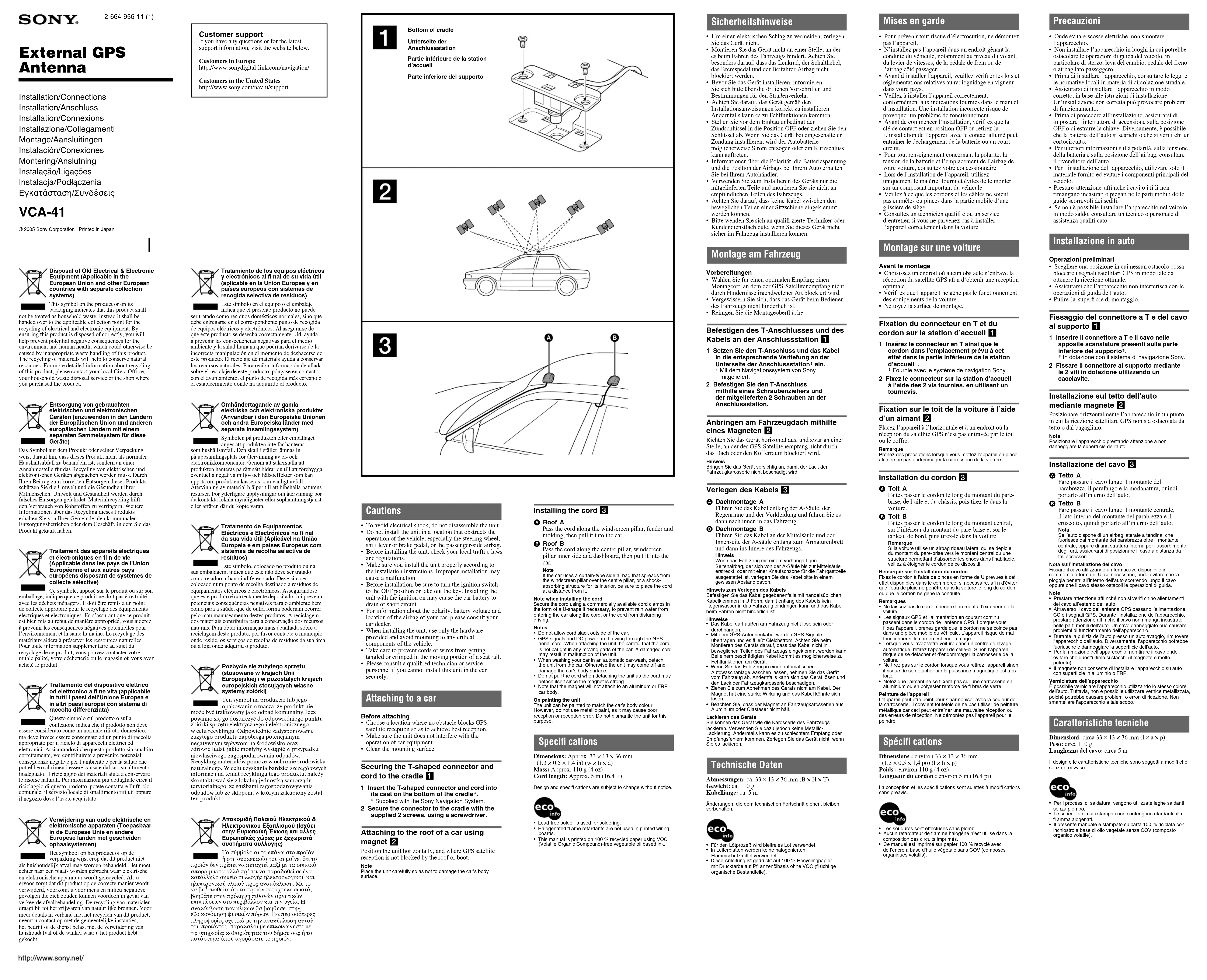 - Um einen elektrischen Schlag zu vermeiden, zerlegen Sie das Gerät nicht.• Montieren Sie das Gerät nicht an einer Stelle, an der es beim Fahren des Fahrzeugs hindert. Achten Sie besonders darauf, dass das Lenkrad, der Schalthebel, das Bremspedal und der Beifahrer-Airbag nicht blockiert werden.• Bevor Sie das Gerät installieren, informieren Sie sich bitte über die örtlichen Vorschriften und Bestimmungen für den Straßenverkehr.• Achten Sie darauf, das Gerät gemäß den Installationsanweisungen korrekt zu installieren. Andernfalls kann es zu Fehlfunktionen kommen.• Stellen Sie vor dem Einbau unbedingt den Zündschlüssel in die Position OFF oder ziehen Sie den Schlüssel ab. Wenn Sie das Gerät bei eingeschalteter Zündung installieren, wird der Autobatterie möglicherweise Strom entzogen oder ein Kurzschluss kann auftreten.• Informationen über die Polarität, die Batteriespannung und die Position der Airbags bei Ihrem Auto erhalten Sie bei Ihrem Autohändler.• Verwenden Sie zum Installieren des Geräts nur die mitgelieferten Teile und montieren Sie sie nicht an empfi ndlichen Teilen des Fahrzeugs.• Achten Sie darauf, dass keine Kabel zwischen den beweglichen Teilen einer Sitzschiene eingeklemmt werden können.• Bitte wenden Sie sich an qualifi zierte Techniker oder Kundendienstfachleute, wenn Sie dieses Gerät nicht sicher im Fahrzeug installieren können. Montage am Fahrzeug Vorbereitungen• Wählen Sie für einen optimalen Empfang einen Montageort, an dem der GPS-Satellitenempfang nicht durch Hindernisse irgendwelcher Art blockiert wird.• Vergewissern Sie sich, dass das Gerät beim Bedienen des Fahrzeugs nicht hinderlich ist.• Reinigen Sie die Montageoberfl äche. Befestigen des T-Anschlusses und des Kabels an der Anschlussstation 1 1 Setzen Sie den T-Anschluss und das Kabel in die entsprechende Vertiefung an der Unterseite der Anschlussstation* ein.* Mit dem Navigationssystem von Sony mitgeliefert.2 Befestigen Sie den T-Anschluss mithilfe eines Schraubenziehers und der mitgelieferten 2 Schrauben an der Anschlussstation. Anbringen am Fahrzeugdach mithilfe eines Magneten 2 Richten Sie das Gerät horizontal aus, und zwar an einer Stelle, an der der GPS-Satellitenempfang nicht durch das Dach oder den Kofferraum blockiert wird.HinweisBringen Sie das Gerät vorsichtig an, damit der Lack der Fahrzeugkarosserie nicht beschädigt wird. Verlegen des Kabels 3 Dachmontage AFühren Sie das Kabel entlang der A-Säule, der Regenrinne und der Verkleidung und führen Sie es dann nach innen in das Fahrzeug. Dachmontage BFühren Sie das Kabel an der Mittelsäule und der Innenseite der A-Säule entlang zum Armaturenbrett und dann ins Innere des Fahrzeugs.HinweisWenn das Fahrzeug mit einem vorhangartigen Seitenairbag, der sich von der A-Säule bis zur Mittelsäule erstreckt, oder mit einer Knautschzone für die Fahrgastzelle ausgestattet ist, verlegen Sie das Kabel bitte in einem gewissen Abstand davon.Hinweis zum Verlegen des KabelsBefestigen Sie das Kabel gegebenenfalls mit handelsüblichen Kabelklemmen in U-Form, damit entlang des Kabels kein Regenwasser in das Fahrzeug eindringen kann und das Kabel beim Fahren nicht hinderlich ist.Hinweise• Das Kabel darf außen am Fahrzeug nicht lose sein oder durchhängen.• Mit dem GPS-Antennenkabel werden GPS-Signale übertragen und es fl ießt Gleichstrom. Achten Sie beim Montieren des Geräts darauf, dass das Kabel nicht in beweglichen Teilen des Fahrzeugs eingeklemmt werden kann. Bei einem beschädigten Kabel kommt es möglicherweise zu Fehlfunktionen am Gerät.• Wenn Sie das Fahrzeug in einer automatischen Autowaschanlage waschen lassen, nehmen Sie das Gerät vom Fahrzeug ab. Andernfalls kann sich das Gerät lösen und den Lack der Fahrzeugkarosserie beschädigen.• Ziehen Sie zum Abnehmen des Geräts nicht am Kabel. Der Magnet hat eine starke Wirkung und das Kabel könnte sich lösen.• Beachten Sie, dass der Magnet an Fahrzeugkarosserien aus Aluminium oder Glasfaser nicht hält.Lackieren des GerätsSie können das Gerät wie die Karosserie des Fahrzeugs lackieren. Verwenden Sie dazu jedoch keine Metallic-Lackierung. Andernfalls kann es zu schlechtem Empfang oder Empfangsfehlern kommen. Zerlegen Sie das Gerät nicht, wenn Sie es lackieren. Technische Daten Abmessungen: ca. 33 × 13 × 36 mm (B × H × T)Gewicht: ca. 110 gKabellänge: ca. 5 mÄnderungen, die dem technischen Fortschritt dienen, bleiben vorbehalten.• Für den Lötprozeß wird bleifreies Lot verwendet.• In Leiterplatten werden keine halogenierten Flammschutzmittel verwendet.• Diese Anleitung ist gedruckt auf 100 % Recyclingpapier mit Druckfarbe auf Pfl anzenölbasis ohne VOC (fl üchtige organische Bestandteile). Precauzioni