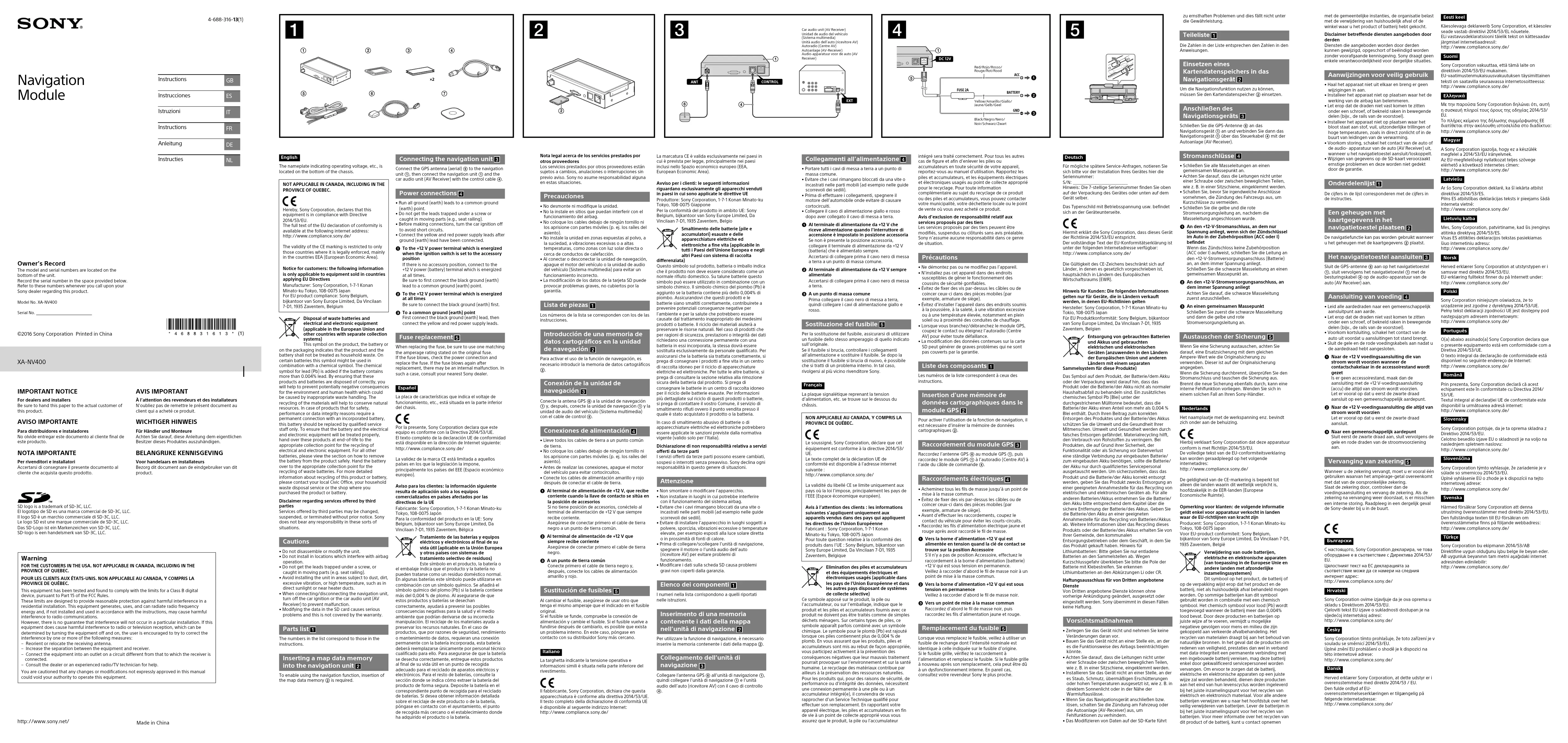L’ora dell’orologio non è corretta.qÈ possibile che l’antenna GPS non sia collegata correttamente. – Accertarsi che l’antenna GPS sia collegata saldamente.qÈ possibile che la posizione dell’antenna GPS non sia appropriata. – Cambiare la posizione dell’antenna GPS.qL’impostazione del fuso orario potrebbe non essere corretta. – Verificare che l’impostazione del fuso orario nel menu di impostazione corrisponda all’area in cui ci si trova. Toccare [Menu] [ (impostazione)] [Sistema] [Ora].La memoria contenente i dati della mappa non è aggiornata.qI dati della mappa aggiornati sono disponibili sul sito di assistenza.La guida vocale della funzione di navigazione non si sente.qIl volume dell’unità di navigazione e dell’unità audio dell’auto (ricevitore AV) potrebbe essere troppo basso. – Aumentare moderatamente il volume dell’unità di navigazione e dell’unità audio dell’auto (ricevitore AV). Il volume dell’unità audio dell’auto (ricevitore AV) può essere regolato soltanto mentre è attiva la guida vocale. Sito di assistenza In caso di domande o per visualizzare le informazioni più aggiornate sul presente prodotto, visitare il sito web seguente:Per i clienti negli Stati Uniti/in Canada:http://esupport.sony.com/Per i clienti in Europa:http://www.sony.eu/supportPer i clienti in Asia Pacifica:http://www.sony-asia.com/section/supporthttp://www.sony-asia.com/caraudio/http://www.sony.com/caraudioFrançais Installation du module GPS