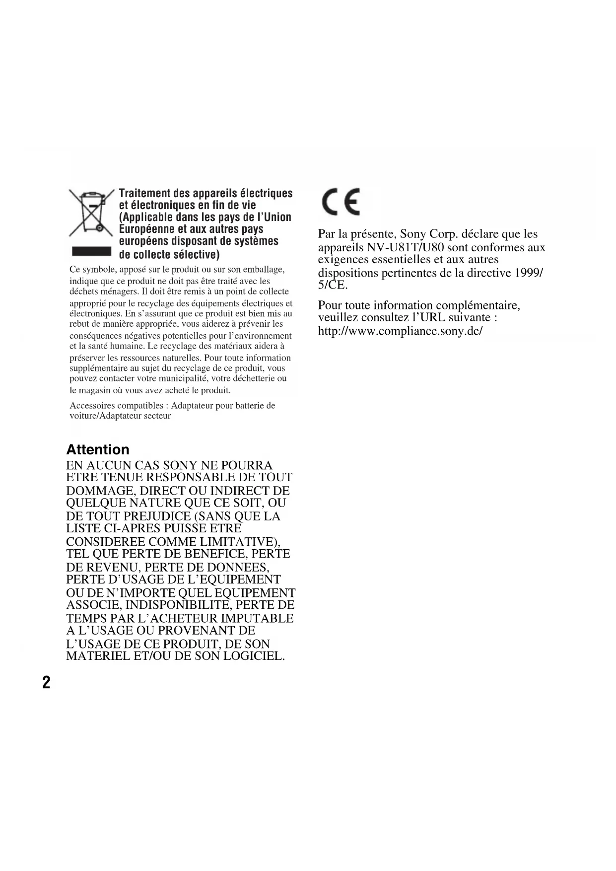 L’USAGE DE CE PRODUIT, DE SON MATERIEL ET/OU DE SON LOGICIEL. Par la présente, Sony Corp. déclare que les appareils NV-U81T/U80 sont conformes aux exigences essentielles et aux autres dispositions pertinentes de la directive 1999/ 5/CE. Pour toute information complémentaire, veuillez consultez l’URL suivante : http://www.compliance.sony.de/ Traitement des appareils électriques et électroniques en fin de vie (Applicable dans les pays de l’Union Européenne et aux autres pays européens disposant de systèmes de collecte sélective) Ce symbole, apposé sur le produit ou sur son emballage, indique que ce produit ne doit pas être traité avec les déchets ménagers. Il doit être remis à un point de collecte approprié pour le recyclage des équipements électriques et électroniques. En s’assurant que ce produit est bien mis au rebut de manière appropriée, vous aiderez à prévenir les conséquences négatives potentielles pour l’environnement et la santé humaine. Le recyclage des matériaux aidera à préserver les ressources naturelles. Pour toute information supplémentaire au sujet du recyclage de ce produit, vous pouvez contacter votre municipalité, votre déchetterie ou le magasin où vous avez acheté le produit. Accessoires compatibles : Adaptateur pour batterie de voiture/Adaptateur secteurTable des matières