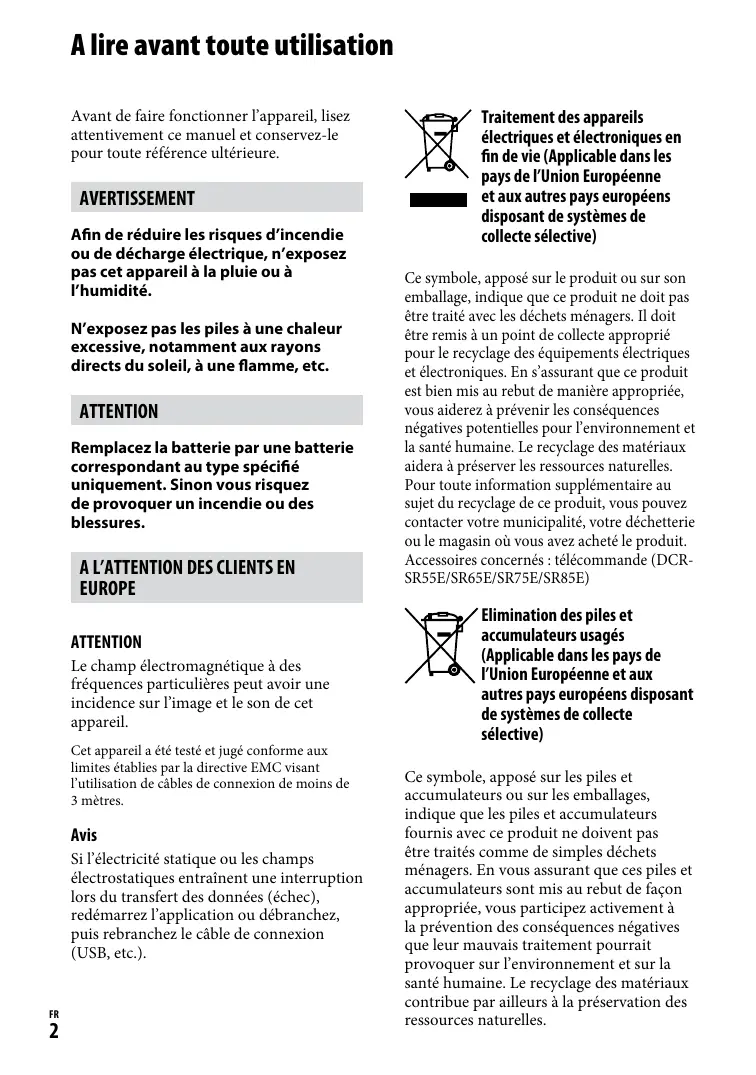 Traitement des appareils électriques et électroniques en fin de vie (Applicable dans les pays de l’Union Européenne et aux autres pays européens disposant de systèmes de collecte sélective) Ce symbole, apposé sur le produit ou sur son emballage, indique que ce produit ne doit pas être traité avec les déchets ménagers. Il doit être remis à un point de collecte approprié pour le recyclage des équipements électriques et électroniques. En s’assurant que ce produit est bien mis au rebut de manière appropriée, vous aiderez à prévenir les conséquences négatives potentielles pour l’environnement et la santé humaine. Le recyclage des matériaux aidera à préserver les ressources naturelles. Pour toute information supplémentaire au sujet du recyclage de ce produit, vous pouvez contacter votre municipalité, votre déchetterie ou le magasin où vous avez acheté le produit. Accessoires concernés : télécommande (DCRSR55E/SR65E/SR75E/SR85E) Elimination des piles et accumulateurs usagés (Applicable dans les pays de l’Union Européenne et aux autres pays européens disposant de systèmes de collecte sélective) Ce symbole, apposé sur les piles et accumulateurs ou sur les emballages, indique que les piles et accumulateurs fournis avec ce produit ne doivent pas être traités comme de simples déchets ménagers. En vous assurant que ces piles et accumulateurs sont mis au rebut de façon appropriée, vous participez activement à la prévention des conséquences négatives que leur mauvais traitement pourrait provoquer sur l’environnement et sur la santé humaine. Le recyclage des matériaux contribue par ailleurs à la préservation des ressources naturelles. Pour les produits qui pour des raisons de sécurité, de performance ou d’intégrité de données nécessitent une connexion permanente à une pile ou à un accumulateur, il conviendra de vous rapprocher d’un service technique qualifié pour effectuer son remplacement. En rapportant votre appareil électrique en fin de vie à un point de collecte approprié vous vous assurez que la pile ou l’accumulateur incorporé sera traitée correctement. Pour tous les autres cas de figure et afin d’enlever les piles ou accumulateurs en toute sécurité de votre appareil, reportezvous au manuel d’utilisation. Rapporter les piles ou accumulateurs usagés au point de collecte approprié pour le recyclage. Pour toute information complémentaire au sujet du recyclage de ce produit ou des piles et accumulateurs, vous pouvez contacter votre municipalité, votre déchetterie locale ou le point de vente où vous avez acheté ce produit. Avis aux consommateurs des pays appliquant les Directives UE La fabricant de ce produit est Sony Corporation, 1-7-1 Konan Minatoku Tokyo, 108-0075 Japon. Le représentant agréé pour la compatibilité électromagnétique et la sécurité du produit est Sony Deutschland GmbH, Hedelfinger Strasse 61, 70327 Stuttgart, allemagne. Pour toute question relative à la garantie ou aux réparations, reportezvous à ladresse que vous trouverez dans les documents ci-joints, relatifs à la garantie et aux réparations.