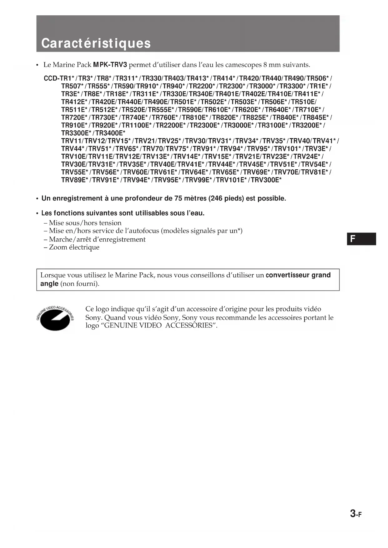 - Les fonctions suivantes sont utilisables sous l’eau. – Mise sous/hors tension – Mise en/hors service de l’autofocus (modèles signalés par un*) – Marche/arrêt d’enregistrement – Zoom électrique Lorsque vous utilisez le Marine Pack, nous vous conseillons d’utiliser un convertisseur grand angle (non fourni). Ce logo indique qu’il s’agit d’un accessoire d’origine pour les produits vidéo Sony. Quand vous vidéo Sony, Sony vous recommande les accessoires portant le logo “GENUINE VIDEO ACCESSORIES”.4-F Précautions A propos du camescope Veiller à ne pas exposer le camescope aux embruns marins et à ne pas le mouiller.
