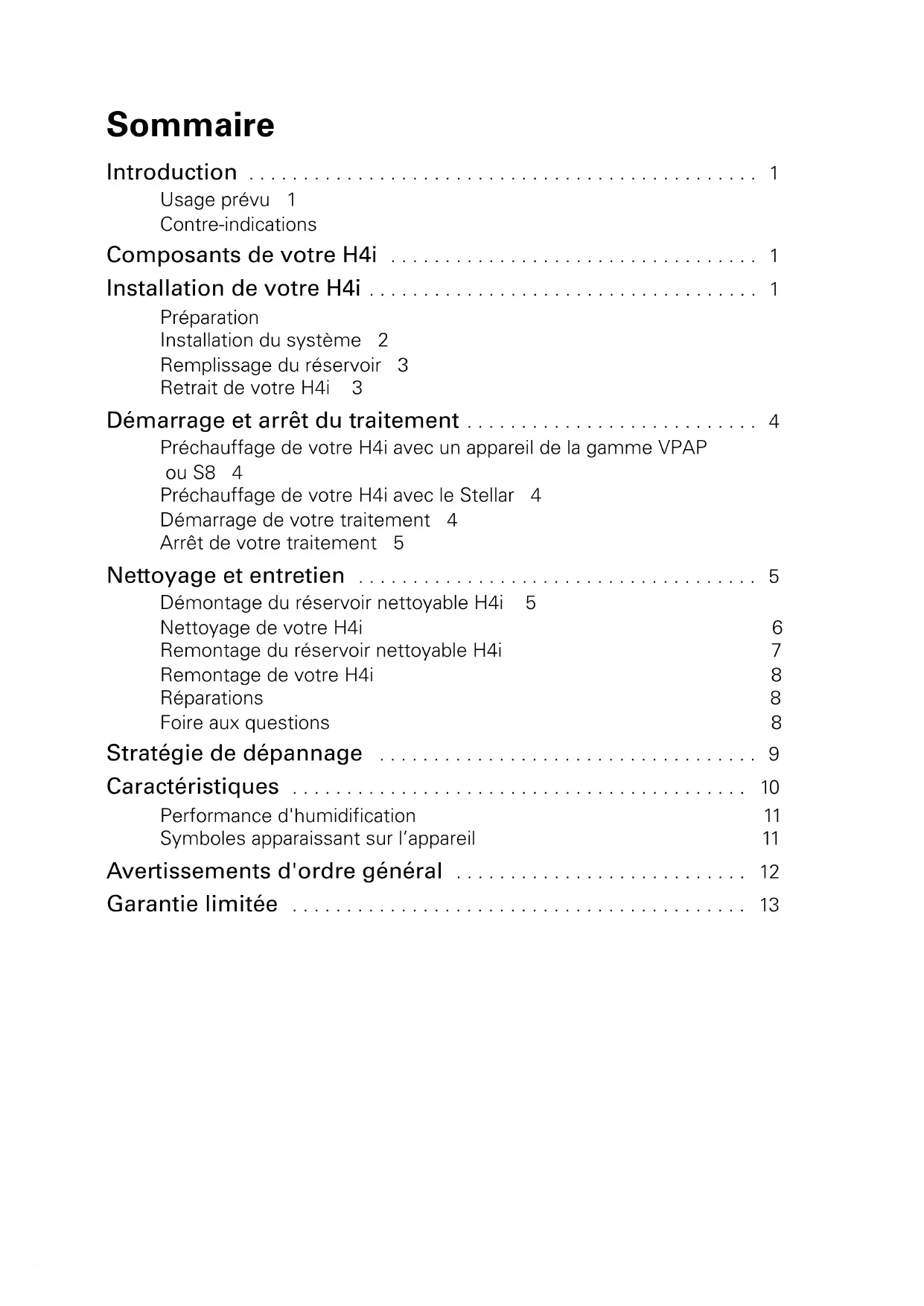 - Prendre toutes les précautions applicables lors de l'utilisation d'oxygène supplémentaire. 248672 H4i User Guide Eur1.book Page 12 Friday, February 1, 2013 10:57 AM13Garantie limitée Français Garantie limitée ResMed Pty Ltd (ci-après « ResMed ») garantit votre produit ResMed contre tout défaut de matériaux et de m ain-d’œuvre pour la période spécifiée ci-après à compter de la date d’achat. Seul le client initial est couvert par la présente garantie. Elle n'est pas cessible. En cas de défaillance du produit dans des conditions normales d’utilisation, ResMed, à son entière discrétion, répare ou remplace le produit défectueux ou toute pièce. Cette garantie limitée ne couvre pas : a) tout dommage résultant d'une utilisation incorrecte, d'un usage abusif ou d'une modification ou transformation opérée sur le produit ; b) les réparations effectuées par tout service de réparation sans l'autorisation expresse de ResMed ; c) tout dommage ou contamination causé par de la fumée de cigarette, de pipe, de cigare ou autre ; d) tout dommage causé par de l’eau renversée sur ou dans un dispositif électronique. La garantie est annulée pour les produits vendus ou revendus dans un pays autre que celui où ils ont été achetés à l'origine. Les réclamations au titre de la garantie pour les produits défectueux doivent être présentées au lieu d'achat par le client initial. Cette garantie remplace toute autre garantie expresse ou implicite, y compris toute garantie implicite de qualité marchande ou d’adéquation à un usage particulier. Certains pays ou états n’autorisent pas les limitations de durée pour les garanties implicites ; il est donc possible que la limitation susmentionnée ne s’applique pas à votre cas. Produit Durée de la garantie