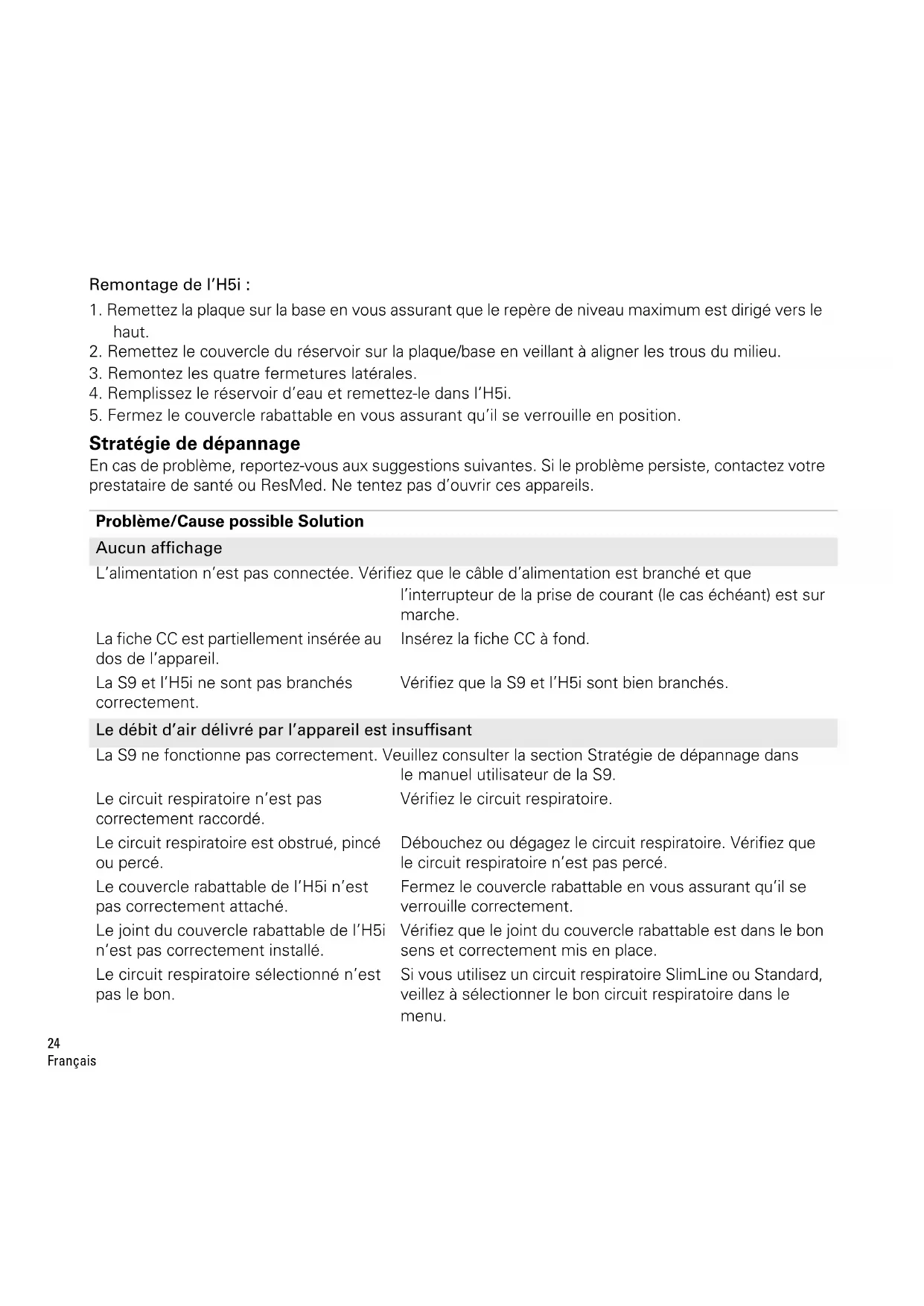 Stratégie de dépannage En cas de problème, reportez-vous aux suggestions suivantes. Si le problème persiste, contactez votre prestataire de santé ou ResMed. Ne tentez pas d’ouvrir ces appareils. Problème/Cause possible Solution Aucun affichage L’alimentation n’est pas connectée. Vérifiez que le câble d’alimentation est branché et que l’interrupteur de la prise de courant (le cas échéant) est sur marche. La fiche CC est partiellement insérée au dos de l’appareil. Insérez la fiche CC à fond. La S9 et l’H5i ne sont pas branchés correctement. Vérifiez que la S9 et l’H5i sont bien branchés. Le débit d’air délivré par l’appareil est insuffisant La S9 ne fonctionne pas correctement. Veuillez consulter la section Stratégie de dépannage dans le manuel utilisateur de la S9. Le circuit respiratoire n’est pas correctement raccordé. Vérifiez le circuit respiratoire. Le circuit respiratoire est obstrué, pincé ou percé. Débouchez ou dégagez le circuit respiratoire. Vérifiez que le circuit respiratoire n’est pas percé. Le couvercle rabattable de l’H5i n’est pas correctement attaché. Fermez le couvercle rabattable en vous assurant qu’il se verrouille correctement. Le joint du couvercle rabattable de l’H5i n’est pas correctement installé. Vérifiez que le joint du couvercle rabattable est dans le bon sens et correctement mis en place. Le circuit respiratoire sélectionné n’est pas le bon. Si vous utilisez un circuit respiratoire SlimLine ou Standard, veillez à sélectionner le bon circuit respiratoire dans le menu.Français
