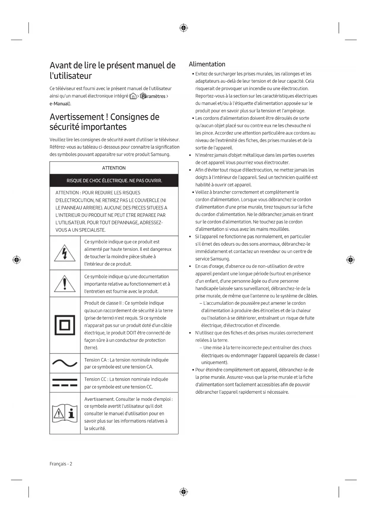 - Le montant des frais d'administration vous sera communiqué avant la visite du technicien. Samsung ne saurait être tenu responsable en cas d'endommagement du produit suite à une réparation effectuée par un fournisseur de services non agréé ou encore par le client lui-même. Samsung décline toute responsabilité en cas d'endommagement du produit, de blessures ou autre problème de sécurité résultant d'une ouverture du produit par un tiers en mépris des consignes de réparation et d'entretien. Toute dommage causé lors d'une tentative de réparation par un tiers autre qu'un prestataire agréé par SAMSUNG ne saurait être couvert par la garantie. Rendez-vous sur samsung.com/support pour plus d’informations surles adaptateurs électriques et les télécommandes en conformité avec la Directive Européenne ErP – Energy related Products Français - 6* Les schémas et illustrations contenus dans ce manuel d'utilisation sont fournis uniquement à titre de référence. L'aspect réel du produit peut être différent. La conception et les spécifications du produit sont susceptibles d'être modifiées sans préavis. Réduction de la consommation d'énergie Lorsque vous éteignez le téléviseur, il passe en mode veille. En mode veille, le téléviseur continue à consommer une petite quantité de courant. Pour réduire la consommation d'énergie, débranchez le cordon d'alimentation lorsque vous prévoyez de ne pas utiliser le téléviseur pendant une période prolongée. Licences The terms HDMI and HDMI High-Definition Multimedia Interface, and the HDMI Logo are trademarks or registered trademarks of HDMI Licensing LLC in the United States and other countries. Par la présente, Samsung déclare que cet équipement radio est conforme à la Directive 2014/53/UE et aux exigences réglementaires pertinentes du Royaume-Uni. Le texte complet de la déclaration de conformité est disponible ici: http://www.samsung.com, sélectionnez Assistance et entrez le nom du modèle. Cet équipement peut fonctionner dans tous les pays de l'UE et au Royaume-Uni. Puissance de transmission Wi-Fi max.: 100mW à 2,4GHz–2,4835GHz Instructions de mise au rebut de ce produit (déchets d'équipements électriques et électroniques) (Applicable dans les pays pratiquant la collecte sélective de déchets) Ce symbole présent sur le produit, ses accessoires ou sa documentation indique que ni le produit, ni ses accessoires électroniques usagés (chargeur, casque audio, câble USB, etc.) ne peuvent être jetés avec les autres déchets ménagers. La mise au rebut incontrôlée des déchets présentant des risques pour l'environnement et la santé publique, veuillez séparer vos produits et accessoires usagés des autres déchets. Vous favoriserez ainsi le recyclage de la matière qui les compose dans le cadre d'un développement durable. Les particuliers sont invités à contacter le magasin leur ayant vendu le produit ou à se renseigner auprès des autorités locales pour connaître les procédures et les points de collecte de ces produits en vue de leur recyclage. Les utilisateurs professionnels doivent contacter leur fournisseur et consulter les conditions générales du contrat d'achat. Ce produit et ses accessoires ne peuvent être jetés avec les autres déchets professionnels et commerciaux. Elimination des piles de ce produit (Applicable dans les pays pratiquant la collecte sélective de déchets) Le symbole présent sur le manuel, l'emballage ou les piles indique que celles-ci ne doivent pas être éliminées en fin de vie avec les autres déchets ménagers. Le cas échéant, les symboles chimiques Hg, Cd ou Pb signifient que la pile contient du mercure, du cadmium ou du plomb à des niveaux supérieurs aux niveaux de référence indiqués dans la directive CE 2006/66. Si les piles ne sont pas correctement éliminées, ces substances peuvent causer des dommages à la santé humaine ou l'environnement. Afin de protéger les ressources naturelles et de favoriser la réutilisation du matériel, veillez à séparer les piles des autres types de déchets et à les recycler via votre système local de collecte gratuite des piles et accumulateurs. Français - 7 FrançaisAntes de leer este manual del usuario El televisor se suministra con este Manual del usuario y un e-Manual integrado ( > Configuración > e-Manual). ¡Advertencia! Instrucciones importantes de seguridad Lea las instrucciones de seguridad antes de utilizar el televisor. Consulte la tabla a continuación para obtener una explicación de los símbolos que pueden aparecer en su producto Samsung. PRECAUCIÓN PELIGRO DE DESCARGA ELÉCTRICA. NO ABRIR. PRECAUCIÓN: PARA REDUCIR EL PELIGRO DE DESCARGA ELÉCTRICA, NO RETIRE LA CUBIERTA. NO HAY PIEZAS EN EL INTERIOR QUE PUEDA REPARAR EL USUARIO.