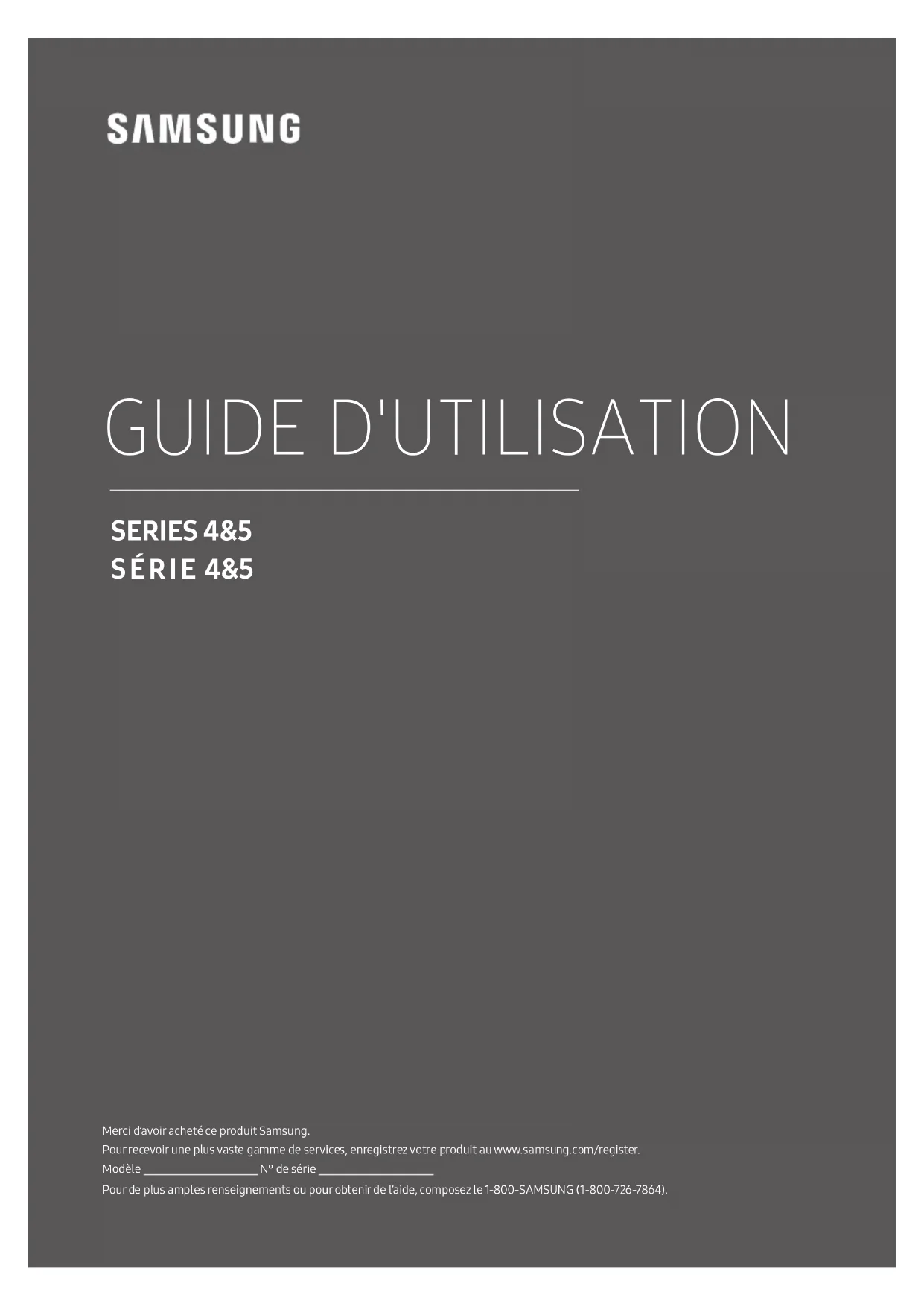 garantie limitée de Samsung; les images rémanentes en sont également exclues. Français - 22Cette page est laissée intentionnellement en blanc.Cette page est laissée intentionnellement en blanc.Cette page est laissée intentionnellement en blanc.Comment contacter Samsung dans le monde Si vous avez des suggestions ou des questions concernant les produits Samsung, veuillez contacter le Service Consommateurs Samsung. Country Customer Care Center Web Site Address CANADA 1-800-SAMSUNG (726-7864) www.samsung.com/ca/ support (English) www.samsung.com/ca_fr/ support (French) Samsung Electronics Canada Inc. 2050 Derry Road West Mississauga, Ontario L5N 0B9 Canada U.S.A 1-800-SAMSUNG (726-7864) www.samsung.com/us/ support Samsung Electronics America, Inc. 85 Challenger Road © 2018 Samsung Electronics Co., Ltd. All rights reserved. Contact SAMSUNG WORLD WIDE If you have any questions or comments relating to Samsung products, please contact the SAMSUNG customer care cente 90101-08241