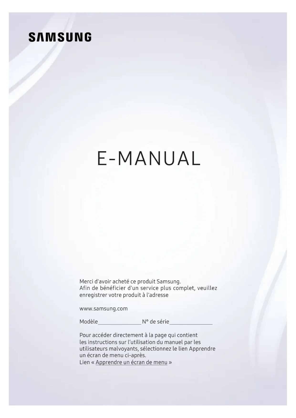 E-MANUAL Merci d'avoir acheté ce produit Samsung. Afin de bénéficier d'un service plus complet, veuillez enregistrer votre produit à l'adresse www.samsung.com Modèle N° de série Pour accéder directement à la page qui contient les instructions sur l’utilisation du manuel par les utilisateurs malvoyants, sélectionnez le lien Apprendre un écran de menu ci-après. Lien «Apprendre un écran de menu»Contenu Guides de démarrage Connectez le Samsung Smart Remote au téléviseur. L'utilisation du Smart Hub Utilisation de l'interaction vocale 4 Exécution de l'interaction vocale 6 À lire avant d'utiliser l’interaction vocale Mise à jour du logiciel du téléviseur 7 Mise à niveau du logiciel du téléviseur vers la dernière version 7 Mise à jour automatique du téléviseur Obtention d’aide 8 Obtention d’aide via la gestion à distance 9 Recherche des coordonnées du service 9 Demande de service Connexions Guide de connexion Raccordement d'une antenne (Antenne) Connexion à Internet 12 Connexion à votre réseau Internet 14 Redémarrage de votre réseau Résolution des problèmes de connectivité Internet 14 Résolution des problèmes de connectivité Internet câblée 15 Résolution des problèmes de connectivité Internet sans fil Connexion de périphériques vidéo 16 Connexion à l'aide d'un câble HDMI 17 Connexion avec un câble composant (modèles dotés d'un connecteur COMPONENT IN / AV IN uniquement) 18 Connexion avec un câble composite (modèles dotés d'un connecteur COMPONENT IN / AV IN uniquement) Connexions d'entrée et de sortie audio 19 Connexion avec un câble HDMI (ARC) 19 Connexion à l'aide d'un câble audio numérique (optique) 19 Connexion au moyen d'un réseau sans fil 20 Connexion des périphériques Bluetooth Connexion à un ordinateur 20 Connexion via le port HDMI ― Partage d'écran (HDMI) Connexion d'un périphérique mobile 21 Affichage de l’écran d’un périphérique mobile sur votre téléviseur (partage d’écran) 21 Partage de contenu via l’application Smart View 22 Gestion d'un périphérique mobile Basculement entre les différents périphériques externes connectés au téléviseur 22 Changement de signal d'entrée 23 Modification du nom et de l’icône d’un périphérique externe 24 Utilisation des autres fonctions Remarques sur la connexion 24 Remarque sur la connexion HDMI 25 Remarque sur la connexion des périphériques audio 26 Remarque sur la connexion des ordinateurs 26 Remarque sur la connexion des périphériques mobiles Télécommande et périphériques À propos de Samsung Smart Remote À propos de Samsung Smart Remote (THE FRAME) Connexion à la Samsung Smart Remote Commande des périphériques externes à l'aide de la Samsung Smart Remote - Utilisation de la télécommande universelle Utilisation de la fonction Anynet+ (HDMI-CEC) 32 Connexion d'un périphérique externe via Anynet+ et utilisation des menus correspondants IICommande du téléviseur à l'aide d'un clavier 33 Connexion d'un clavier USB 33 Connexion d'un clavier Bluetooth 33 Utilisation du clavier Saisie de texte à l’aide du clavier QWERTY à l’écran 35 Utilisation des autres fonctions 35 Saisie de texte avec le micro de la télécommande et le clavier QWERTY à l'écran Fonctions Smart Smart Hub 37 Affichage de Home Screen 40 Lancement automatique de Smart Hub 40 Lancement automatique de la dernière application utilisée 40 Test des connexions Smart Hub 40 Réinitialisation de Smart Hub Utilisation d'un compte Samsung 41 Création et gestion de votre compte Samsung 42 Ouverture d'un compte Samsung Utilisation du service Mes Applications 44 Installation et exécution d'une application 45 Gestion des applications achetées ou installées Utilisation de e-Manual 47 Lancement du manuel électronique 47 Utilisation des boutons du manuel électronique Utilisation de Internet Lecture des images/vidéos/fichiers musicaux 49 Lecture de contenu multimédia Utilisation de l'interaction vocale 50 Exécution de l'interaction vocale 51 À lire avant d'utiliser l’interaction vocale Visionnement du téléviseur Affichage des informations sur les diffusions numériques en bref 53 Utilisation du guide Enregistrement de programmes 55 Enregistrement de programmes 56 Gestion de la liste des enregistrements planifiés 56 Visionnage de programmes enregistrés Configuration d'un visionnage planifié 57 Configuration du visionnage des programmes d'une chaîne 58 Modification d'un visionnage programmé 58 Définition de l’heure du visionnage planifié Utilisation de la fonction Timeshift 59 Boutons et fonctions disponibles lors de l'enregistrement d'un programme ou avec Timeshift Utilisation de Liste des chaînes Modification de chaînes 61 Suppression de chaînes enregistrées 61 Modification de chaînes enregistrées Création d'une liste de chaînes favorites personnalisée 62 Enregistrement des chaînes dans la liste de chaînes favorites 62 Affichage et sélection des chaînes dans les listes de chaînes favorites uniquement Modification d'une Favourites List (Liste des Favoris) 63 Ajout de chaînes à une liste de favoris 63 Suppression des chaînes d'une liste de chaînes favorites 63 Réorganisation d'une liste de chaînes favorites 63 Modification du nom d'une liste de chaînes favorites II IIIFonctions de prise en charge du visionnage de programmes télévisés 64 Changement de signal de diffusion 64 Recherche des chaînes disponibles 65 Limitation de l’affichage de chaînes spécifiques 65 Sélection des options de diffusion de l’audio 65 L'utilisation du Contrôle Parental 65 Configuration des paramètres de diffusion avancés 66 Lecture de texte numérique 66 Sélection de la langue audio de diffusion 67 Réglage manuel des signaux de diffusion 67 Réglage précis des diffusions analogiques 68 Transfert de la liste des chaînes 68 Suppression du profil de l'opérateur du module CAM 68 Définition du système satellite 68 Modification de la langue