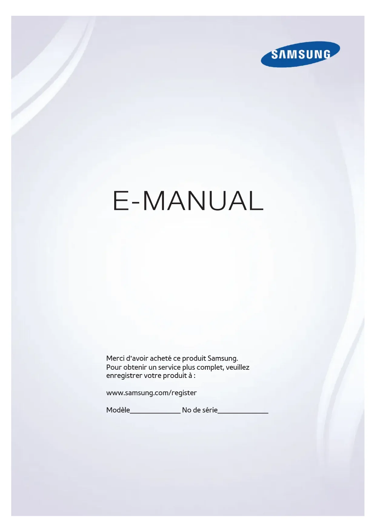 E-MANUAL Merci d’avoir acheté ce produit Samsung. Pour obtenir un service plus complet, veuillez enregistrer votre produit à : www.samsung.com/register Modèle_____________ No de série_____________Contenu Guides rapides Utilisation du mode Smart Hub 1 Connexion à Internet 1 Configuration du mode Smart Hub 1 Utilisation du mode Smart Hub Commander votre téléviseur à l'aide de votre voix 2 Configuration du mode Reconnaissance vocale 2 Commande du téléviseur avec votre voix Commander votre téléviseur à l'aide de gestes 3 Configuration du mode Commande gestuelle 3 Commande du téléviseur avec des gestes Utilisation de la fonction Samsung Smart Control 4 Faire fonctionner le téléviseur à l'aide de la touche POINTER 5 Configuration de la télécommande Samsung Smart Control 5 Exécution du pairage entre le téléviseur et Samsung Smart Control Améliorer l'expérience de visionnement d'événements sportifs 6 Activer le mode Sport Afficher plus d'un écran Connexions Connexion d'une antenne Connexion à Internet 9 Établir une connexion à Internet câblée 10 Établir une connexion à Internet sans fil Résolution de problèmes de connectivité à Internet 12 Résolution de problèmes de connectivité câblée à Internet 13 Résolution de problèmes de connectivité sans fil à Internet Connexion d'appareils vidéo 14 Connexion à l'aide d'un câble HDMI 15 Connexion à l'aide d'un câble pour composante 16 Connexion à l'aide d'un câble pour composite (A/V) Connexions d'entrée et de sortie audio 17 Connexion avec un câble HDMI (ARC) 18 Connexion à l'aide d'un câble audio numérique (optique) 18 Connexion à l'aide d'un câble audio stéréo Connexion à un ordinateur 19 Connexion au moyen du port HDMI 20 Connexion à l'aide d'un câble HDMI-DVI 20 Établir une connexion en utilisant votre réseau domestique Connexion d'un appareil mobile 21 Connexion à l'aide d'un câble MHL-HDMI 22 Utilisation du mode Recopie d’écran 23 Connexion à un appareil mobile sans routeur sans fil (Wi-Fi Direct). 24 Connecter un appareil mobile par le biais de Samsung Smart View 2.0 Appariement d'un ordinateur portable au téléviseur (recopie d'écran portable sans fil) Commuter entre des appareils externes connectés au téléviseur Information en ce qui concerne les connexions 26 Information en ce qui concerne la connexion HDMI 27 Établir une connexion à un appareil audio 27 Information en ce qui concerne la connexion à un ordinateur 27 Information en ce qui concerne la connexion à des appareils mobiles 28 Remarques de connexion relativement au processus de recopie d'écran portable sans fil IITélécommande et appareils périphériques Au sujet de la télécommande Samsung Smart Control Utilisation de la télécommande Samsung Smart Control 31 Faire fonctionner le téléviseur à l'aide de la touche POINTER 31 Commander le téléviseur à l'aide des touches directionnelles et de la touche Enter 32 Affichage et utilisation de la télécommande à l'écran 33 Exécution du pairage entre le téléviseur et Samsung Smart Control Commande des appareils externes avec la télécommande – Utilisation de la télécommande universelle 34 Configuration de la télécommande universelle Commander le téléviseur à l'aide d'un clavier 35 Branchement d'un clavier 36 Utilisation du clavier Commander le téléviseur à l'aide d'une souris 37 Branchement d'une souris 37 Utilisation d'une souris Branchement d'une console de jeux Bluetooth Saisir du texte à l'aide du clavier QWERTY à l'écran 38 Utilisation de fonctions supplémentaires Fonctions Smart Afficher plus d'un écran à l'aide du mode Écran à plusieurs sources 39 Utilisation du mode Multi-Link Screen Smart Hub 41 Retirer ou marquer un élément dans le groupe Récent 41 Lancement automatique de Smart Hub 41 Essai des connexion Smart Hub 42 Utilisation du tutoriel Smart Hub 42 Réinitialiser Smart Hub Utilisation du mode Smart Hub par l'intermédiaire d'un Compte Samsung 43 Création d'un compte Samsung 44 Se connecter à un compte Samsung 44 Lier votre compte Samsung à des comptes de services externes 45 Ajouter des renseignements à un compte Samsung, ou les modifier 45 Supprimer un compte Samsung du téléviseur Utilisation du service GAMES 46 Gérer les jeux à partir du menu contextuel Options 46 Affichage de l'écran Information détaillée 47 Installer et exécuter un jeu 47 Gestion des jeux téléchargés ou achetés Utilisation du service APPS 49 Gérer les applications à partir du menu contextuel Options 49 Affichage de l'écran Information détaillée 50 Installer une application 50 Activer les mises à jour automatiques des applications 51 Supprimer l'application du téléviseur 51 Verrouiller et déverrouiller des applications 51 Mise à jour des applications 51 Réorganiser les applications 51 Évaluation des applications achetées 51 Utiliser les fonctions des autres applications Utilisation de la fonction e-Manual 52 Lancement du guide électronique 52 Utilisation des touches dans le guide électronique Utilisation du navigateur Web 53 Préférences de navigation Utilisation du service MON CONTENU 54 Instructions à lire avant la lecture de tout contenu média 55 Lire du contenu multimédia sur un ordinateur ou un appareil mobile 55 Lecture du contenu média enregistré sur un dispositif USB 56 Touches et fonctions disponibles pendant le visionnement de photos 57 Touches et fonctions disponibles pendant le visionnement de vidéos 59 Touches et fonctions disponibles pendant la lecture de fichiers de musique 60 Fonctions dans l'écran de la liste des contenus média II IIIUtilisation du service NewsON 61 Utilisation du contenu NewsON Utilisation du service Soccer 62 Configuration de l'écran de service Soccer pour afficher vos équipes favorites 62 Utilisation de fonctions supplémentaires 63 Voir des vidéos de soccer Commander votre téléviseur à l'aide de votre voix 65 Lisez les instructions ci-après avant d'ut