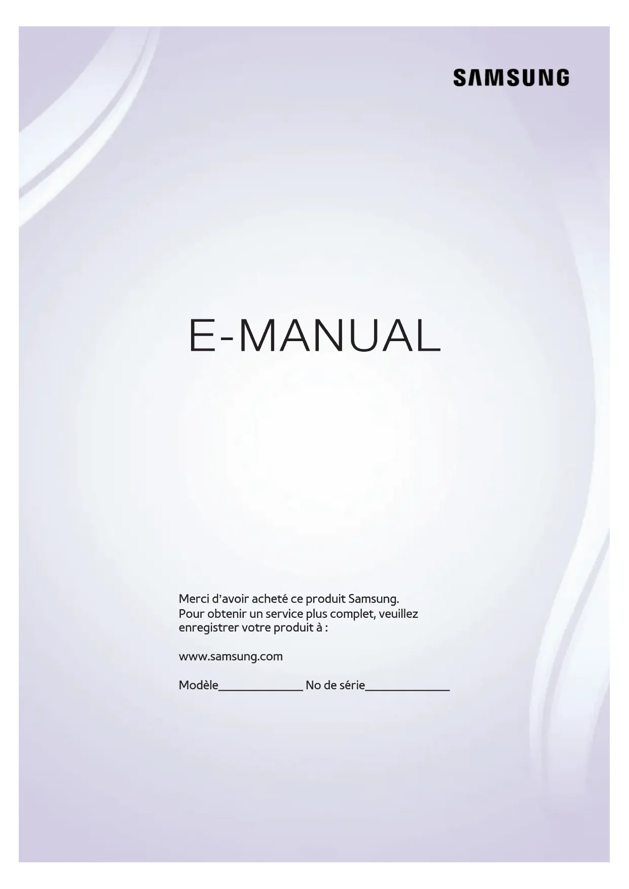E-MANUAL Merci d’avoir acheté ce produit Samsung. Pour obtenir un service plus complet, veuillez enregistrer votre produit à : www.samsung.com Modèle_____________ No de série_____________Contenu Guide rapide Utilisation de la fonction Smart Hub Utilisation de la fonction Commande vocale Utilisation de la fonction Commande gestuelle Utilisation de la fonction Samsung Smart Control Utilisation de la fonction Multi-Link Screen Branchement d'une antenne et d'appareils externes Branchement de l'antenne Connexion d'appareils vidéo 9 Branchement HDMI 10 Branchement d'une composante 11 Connexion composite (A/V) Connexions d'entrée et de sortie audio 12 Branchement HDMI (ARC) 13 Branchement audio numérique (optique) 14 Branchement d'une sortie audio Connexion à un ordinateur 16 Connexion au moyen du port HDMI 17 Connexion à l'aide d'un câble DVI-HDMI 18 Connexion au moyen de Samsung Link 18 Connexion par DLNA en utilisant votre réseau domestique 19 Se connecter grâce à Samsung Smart View 2.0 Connexion à un appareil mobile 20 Connexion à l'aide d'un câble MHL-HDMI 21 Mise en miroir de l'écran 23 Connecter des appareils mobiles sans utiliser de routeur sans fil (Wi-Fi Direct) 23 Connexion au moyen de Samsung Link 24 Connexion par DLNA en utilisant votre réseau domestique 24 Se connecter grâce à Samsung Smart View 2.0 24 Préciser le nom du téléviseur sur un réseau Passage d'une source vidéo à une autre 25 Autres fonctions disponibles lorsque vous affichez la Liste source 25 La fonction de télécommande universelle Utilisation de la télécommande et des périphériques Installation des piles dans la télécommande Samsung Smart Control 26 Fenêtre d'alarme indiquant le niveau faible des piles Pairage de la télécommande Samsung Smart Touch Control 27 Reconnexion de la télécommande Samsung Smart Touch Control Utilisation de la télécommande Samsung Smart Control 28 Fonctions des touches 31 Utiliser le téléviseur au moyen du déplacement de la télécommande Samsung Smart Control 32 Utilisation du pavé tactile et des touches directionnelles 34 Affichage et utilisation de la télécommande à l'écran Commande des appareils externes avec la télécommande – Utilisation de la télécommande universelle 36 Connexion du câble de rallonge IR 37 Configuration de la télécommande universelle 38 Fonctions de la télécommande universelle Commander le téléviseur à l'aide d'un clavier 39 Branchement d'un clavier 40 Utilisation du clavier Commander le téléviseur à l'aide d'une souris 41 Branchement d'une souris 42 Utilisation de la souris Saisir du texte à l'aide du clavier QWERTY à l'écran 43 Utilisation de fonctions supplémentaires IIConnexion Internet Connexion à Internet câblée 44 Utilisation de câbles LAN CAT 7 45 Connexion automatique à un réseau Internet câblé 46 Connexion manuelle à un réseau Internet câblé Connexion à Internet sans fil 48 Connexion automatique à un réseau Internet sans fil 49 Connexion manuelle à un réseau Internet sans fil 50 Connexion à un réseau Internet sans fil avec WPS Résolution de problèmes de connectivité à Internet 51 Résolution de problèmes de connectivité câblée à Internet 52 Résolution de problèmes de connectivité sans fil à Internet Vérification de l'état de la connexion réseau Fonctions Smart Utilisation des fonctions Écran multiple dans un seul écran (Multi-Link Screen) 54 Lancement de la fonction Écran à plusieurs sources 54 Utilisation de la fonction Multi-Link Screen Smart Hub 56 Essai des connexion Smart Hub 57 Ouvrir l'Premier Écran 58 Passage à l'écran Panneau 58 Utilisation de la fonction Didacticiel Smart Hub 58 Réinitialiser Smart Hub Utiliser Smart Hub à l'aide d'un compte Samsung 59 Création d'un compte Samsung 61 Se connecter à un compte Samsung 62 Lier votre compte Samsung à des comptes de services externes 63 Ajouter des renseignements à un compte Samsung, ou les modifier 63 Supprimer un compte Samsung du téléviseur Utilisation du panneau SAMSUNG APPS 65 Utiliser les fonctions prises en charge des applications téléchargées à l'aide du menu contextuel 66 Utiliser les fonctions prises en charge des applications recommandées à l'aide du menu contextuel 66 Installer une application Utilisation de la fonction e-Manual 68 Lancement du guide électronique 69 Accès au menu à partir du guide électronique 69 Chargement des pages de référence 69 Mise à jour du guide électronique en fonction de la version la plus récente Utilisation du mode Web Browser 70 Méthodes de navigation 70 Fonction de défilement avec le navigateur Web 70 Aperçu de la barre d'état et de commande 72 Préférences de navigation 74 Déplacer une application à l'écran des applications. 74 Supprimer une application du téléviseur 75 Classement ou évaluation d'une application 75 Mise à jour des applications 76 Utiliser les fonctions des autres applications Utiliser le panneau Multimédia (lire des photos, des vidéos et de la musique) 78 Lecture du contenu média enregistré sur une clé USB 79 Lire du contenu multimédia enregistré sur un ordinateur ou un appareil mobile 82 Touches et fonctions disponibles pendant le visionnement de photos 83 Touches et fonctions disponibles pendant le visionnement de vidéos 85 Touches et fonctions disponibles pendant la lecture de fichiers musicaux 86 Fonctions dans l'écran de la liste des contenus média Utilisation du panneau NewsON 87 Nouvelles 87 Météo Utilisation du panneau SOCCER 89 Sélection de votre équipe favorite Contrôler votre téléviseur à l'aide de votre voix (Commande vocale) 90 Utilisation de la Commande vocale impérative 92 Utilisation de la commande vocale interactive II IIICommande du téléviseur à l'aide de gestes (Commande gestuelle) 94 Test de luminosité ambiante au moyen de la télécaméra 95 Activation de la commande gestuelle 97 Disposition de l'écran de la commande gestuelle Utilisation de la fonction d