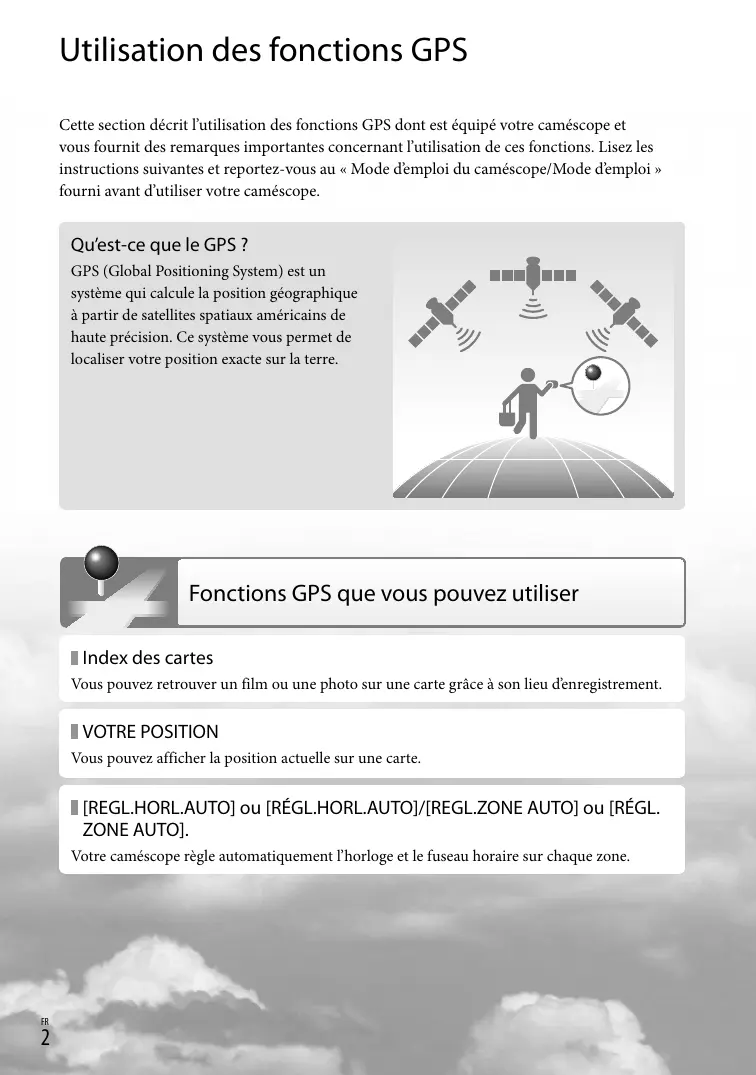 Utilisation des fonctions GPS FR Uso de las funciones de GPS Utilisation des fonctions GPS Cette section décrit l’utilisation des fonctions GPS dont est équipé votre caméscope et vous fournit des remarques importantes concernant l’utilisation de ces fonctions. Lisez les instructions suivantes et reportez-vous au « Mode d’emploi du caméscope/Mode d’emploi » fourni avant d’utiliser votre caméscope.