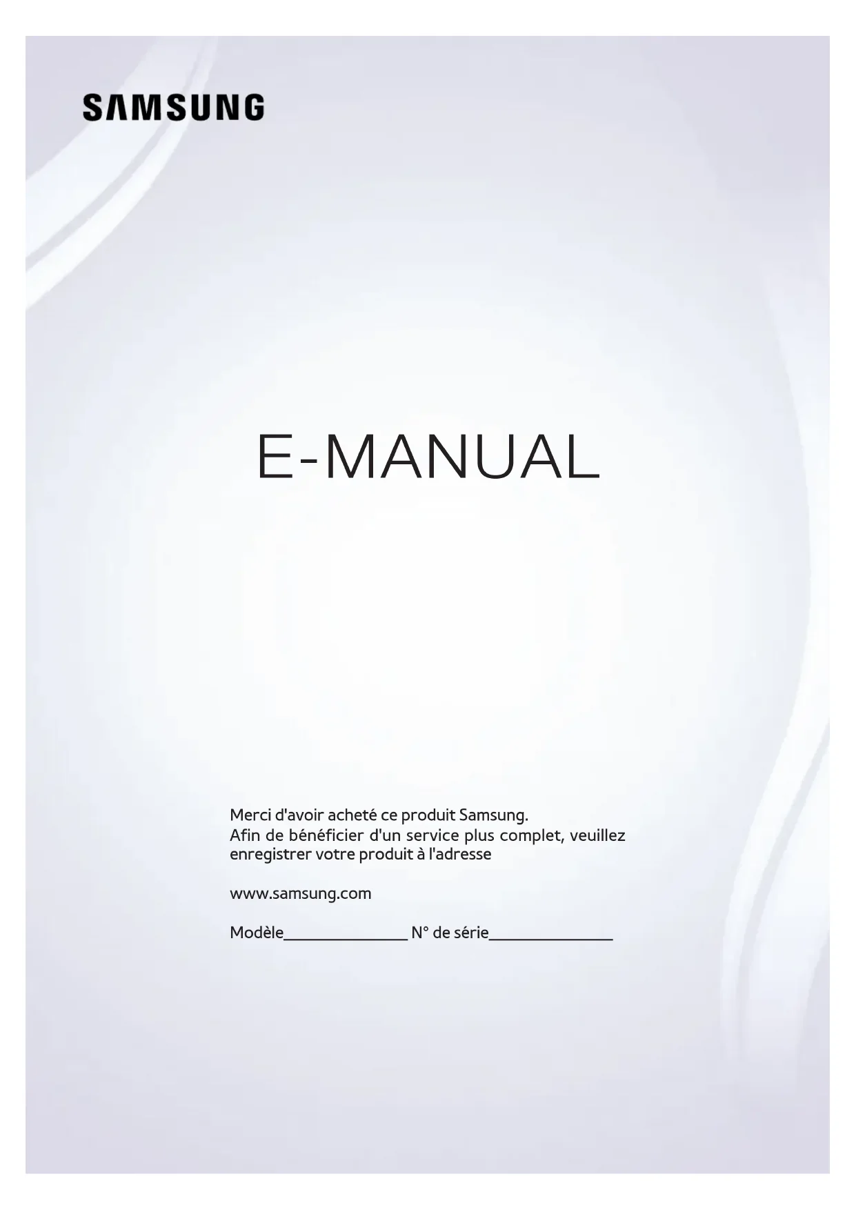 E-MANUAL Merci d'avoir acheté ce produit Samsung. Afin de bénéficier d'un service plus complet, veuillez enregistrer votre produit à l'adresse www.samsung.com Modèle______________ N° de série______________Contenu Guides de démarrage Utilisation de Smart Hub 1 Connexion à Internet 1 Configuration de Smart Hub 1 Utilisation de Smart Hub Commande vocale du téléviseur 2 Configuration de Reconnaissance vocale 3 Commande vocale du téléviseur Commande par mouvement du téléviseur 4 Configuration de Commande par mouv. 5 Contrôle du téléviseur à l'aide de gestes Utilisation du Samsung Smart Control 6 Utilisation du téléviseur avec le bouton POINTER 7 Configuration du Samsung Smart Control 7 Pairage du téléviseur au Samsung Smart Control Amélioration de l'expérience visuelle des événements sportifs 8 Activation de la fonction Mode Sport Modification des chaînes 9 Activation de la fonction Modifier la chaîne 9 Réorganisation ou suppression de chaînes Lecture de plusieurs écrans Connexions Raccordement d'une antenne (Antenne) Connexion à Internet 12 Mise en place d'une connexion câblée à Internet 13 Mise en place d'une connexion sans fil à Internet Connexion à un réseau au moyen d'un dongle mobile Résolution des problèmes de connectivité Internet 16 Résolution des problèmes de connectivité Internet câblée 17 Résolution des problèmes de connectivité Internet sans fil Connexion de périphériques vidéo 18 Connexion à l'aide d'un câble HDMI 19 Connexion à l'aide d'un câble composant 19 Connexion à l'aide d'un câble composite (A/V) Connexions d'entrée et de sortie audio 20 Connexion à l'aide d'un câble HDMI (ARC) 21 Connexion à l'aide d'un câble audio numérique (optique) 21 Connexion à l'aide d'un câble audio stéréo Connexion à un ordinateur 22 Connexion via le port HDMI 23 Connexion à l'aide d'un câble HDMI vers DVI 23 Connexion via votre réseau domestique Connexion d'un périphérique mobile 24 Connexion à l'aide d'un câble MHL vers HDMI 25 Utilisation de Réplication de l'écran 26 Connexion de périphériques mobiles sans routeur sans fil (Wi-Fi Direct) 26 Connexion d'un périphérique mobile via Samsung Smart View Pairage d'un ordinateur portable et du téléviseur - Mise en miroir de PC sans fil (ou KINO TV) Modification du signal d'entrée avec des périphériques externes Remarques sur la connexion 29 Remarque sur la connexion HDMI 30 Remarque sur la connexion des périphériques audio 30 Remarque sur la connexion des ordinateurs 31 Remarque sur la connexion des périphériques mobiles 31 Remarques concernant la connexion pour la mise en miroir de PC sans fil (ou KINO TV) Télécommande et périphériques À propos du Samsung Smart Control Utilisation du Samsung Smart Control 34 Utilisation du téléviseur avec le bouton POINTER 34 Utilisation du téléviseur avec les touches de direction et le bouton Entrer 35 Affichage et utilisation de la télécommande visuelle 37 Pairage du téléviseur au Samsung Smart Control IICommande des périphériques externes à l'aide de la télécommande du téléviseur - Utilisation de la télécommande universelle 37 Réglage de la télécommande universelle Commande du téléviseur à l'aide d'un clavier 38 Connexion d'un clavier 39 Utilisation du clavier Commande du téléviseur à l'aide d'une souris 40 Connexion d'une souris USB 40 Utilisation d'une souris Saisie de texte à l'aide du clavier QWERTY à l'écran 41 Utilisation des autres fonctions Fonctions Smart Affichage de plusieurs écrans ou fonctions avec Multi-Link Screen 42 Utilisation de Multi-Link Screen Smart Hub 44 Supprimer ou épingler un élément dans le groupe Récente 44 Lancement automatique de Smart Hub 44 Test des connexions Smart Hub 45 Utilisation du didacticiel Smart Hub 45 Réinitialisation de Smart Hub Utilisation de Smart Hub avec un Compte Samsung 46 Création d'un compte Samsung 47 Ouverture d'un compte Samsung 47 Association de votre compte Samsung à vos comptes de services externes 48 Modification et ajout d'informations à un compte Samsung 48 Suppression d'un compte Samsung du téléviseur Utilisation du service Mes Applications 49 Gestion des applications téléchargées avec le menu contextuel Options 50 Installation d'une application 50 Suppression d'une application du téléviseur 51 Déplacement des applications 51 Verrouillage et déverrouillage des applications 51 Mise à jour des applications 51 Réorganisation des applications 51 Notation des applications achetées 51 Utilisation des autres caractéristiques et fonctions de l'application Utilisation de l'e-Manual 52 Lancement du manuel électronique 52 Utilisation des boutons du manuel électronique Utilisation du navigateur Web. 53 Préférences de navigation Utilisation du service MON CONTENU 54 À lire avant de lire du contenu multimédia 55 Lecture de contenu multimédia sur un ordinateur ou un périphérique mobile 55 Lecture de contenu multimédia enregistré sur un périphérique USB 56 Boutons et fonctions disponibles pendant le visionnage de photos 58 Boutons et fonctions disponibles pendant le visionnage de vidéos 60 Boutons et fonctions disponibles pendant la lecture de musique 61 Écoute de musique en qualité HD 61 Fonctions de l'écran de liste de contenu multimédia Utilisation du service NewsON 62 Actualités 62 Météo Commande vocale du téléviseur 64 À lire avant d'utiliser la fonction de reconnaissance vocale 64 Apprentissage des principes de base de la reconnaissance vocale 66 Utilisation de la reconnaissance vocale impérative 66 Utilisation de la reconnaissance vocale interactive à une courte distance 66 Utilisation de la reconnaissance vocale longue distance 67 Utilisation du didacticiel de reconnaissance vocale Contrôle du téléviseur à l'aide de gestes (Commande par mouv.) 68 Test de la luminosité ambiante à l'aide de la caméra du téléviseur 69 Activation de la commande par mouvement 72 Modification de la pr
