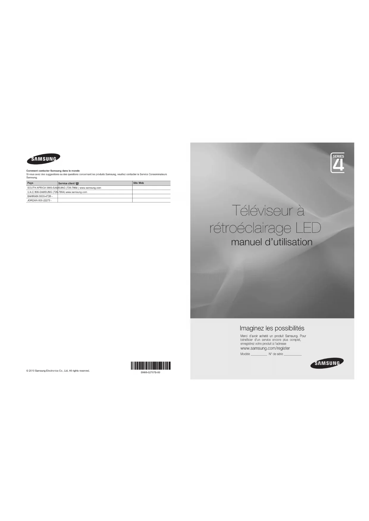 © 2010 Samsung Electronics Co., Ltd. All rights reserved.BN68-02767B-00 Téléviseur à rétroéclairage LED manuel d’utilisation Imaginez les possibilités Merci d’avoir acheté un produit Samsung. Pour bénéficier d’un service encore plus complet, enregistrez votre produit à l’adresse www.samsung.com/register Modèle ___________ N° de série ____________ Comment contacter Samsung dans le monde Si vous avez des suggestions ou des questions concernant les produits Samsung, veuillez contacter le Service Consommateurs Samsung. Pays Service client Site WebSOUTH AFRICA 0860-SAMSUNG (726-7864 ) www.samsung.comU.A.E 800-SAMSUNG (726-7864) www.samsung.comBAHRAIN 8000-4726 -JORDAN 800-22273 - [UC4000]BN68-02767B-00Fre.indb 1 2010-03-03 오후 7:02:042 Français Les figures et illustrations contenues dans ce mode d'emploi sont fournies pour référence uniquement. Elles peuvent différer de l'aspect réel du produit. La conception et les spécifications du produit sont susceptibles d'être modifiées sans préavis. Avertissement d'image fixe Evitez d'afficher sur l'écran des images fixes (telles que des photos au format JPEG) ou des éléments d'images fixes (tels que des logos de programmes TV, un format d'image 4:3 ou panoramique, des bandeaux d'actualités ou d'informations boursières au bas de l'écran, etc.). L'affichage permanent d'images fixes risque, en effet, d'entraîner l'apparition d'images fantôme à l'écran, ce qui peut se traduire par une dégradation de la qualité d'image. Pour atténuer les risques, suivez scrupuleusement les recommandations suivantes: