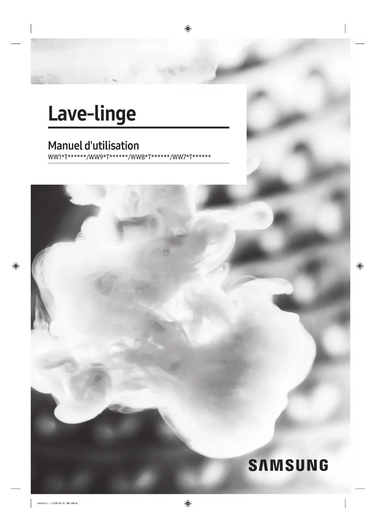 Lave-linge Manuel d'utilisation WW1*T******/WW9*T******/WW8*T******/WW7*T****** Untitled-5 1 2020-08-28 3:08:46Français Français2 Sommaire Consignes de sécurité 4 Ce que vous devez savoir concernant les consignes de sécurité 4 Symboles de sécurité importants 4 Consignes de sécurité importantes 5 Avertissements importants concernant l'installation 6 Mises en garde concernant l'installation 8 Avertissements importants concernant l'utilisation 8 Mises en garde concernant l'utilisation 9 Avertissements importants concernant le nettoyage 12 Instructions concernant les déchets DEEE 13 Installation 14 Ce qui est inclus 14 Conditions d'installation 16 Installation étape par étape 18 Avant de démarrer 28 Configuration initiale 28 Instructions de lavage 29 Recommandation en matière de lessive 32 Instructions relatives au tiroir à lessive 33 Opérations 36 Panneau de commande 36 Lancement d'un cycle 38 Présentation des cycles 39 Fonctions supplémentaires 42 Fonctions système 44 Fonctions spéciales 46 SmartThings 49 Déclaration de logiciel open source 50 Untitled-5 2 2020-08-28 3:08:46Français Français 3 Maintenance 51 Nettoyage tambour+ 51 Vidange d'urgence 52 Nettoyage 53 Dégel de votre lave-linge 57 Mesures en cas de non-utilisation prolongée 57 Dépannage 58 Contrôles 58 Codes d'information 62 Caractéristiques techniques 65 Tableau des symboles d'entretien des tissus 65 Protection de l'environnement 65 Garantie pour les pièces détachées 66 Fiche de caractéristiques techniques 66 Coordonnées de contact 69