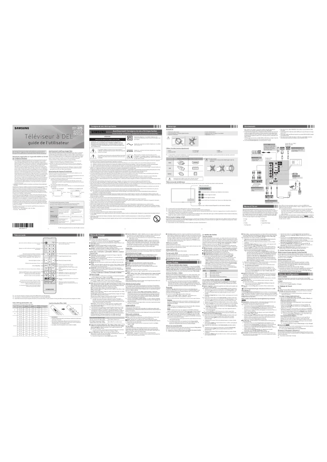 Insertion des piles (Piles: AAA) ✎ REMARQUE Utilisez la télécommande à une distance maximale du téléviseur Une lumière intense peut affecter le bon fonctionnement de la télécommande. Évitez de l'utiliser près d'une source lumineuse La couleur et la forme peuvent varier selon le modèle.Comment contacter Samsung dans le mondeSi vous avez des suggestions ou des questions concernant les produits Samsung, veuillez contacter le Service Consommateurs Samsung. Pays CANADA U.S.A AddressSamsung Electronics Canada Samsung Electronics Centre de service à la clientèle Site Webwww.samsung.com/ca/support (English)www.samsung.com/ca_fr/support (French)www.samsung.com/us/support Consignes de sécurité importantes Avertissement! Consignes de sécurité importantes (Avant d'utiliser le téléviseur, veuillez lire les instructions de sécurité.) ATTENTION connexion de sécurité de mise à la terre (à la masse) n'est pas requise.RISQUE DE DÉCHARGE ÉLECTRIQUE. NE PAS OUVRIR.N'ENLEVEZ PAS LE COUVERCLE (OU LE PANNEAU ARRIÈRE). AUCUNE PIÈCE POUVANT ÊTRE RÉPARÉE PAR L'UTILISATEUR NE SE TROUVE À L'INTÉRIEUR. VEUILLEZ VOUS ADRESSER À UN TECHNICIEN AGRÉÉ POUR TOUTE RÉPARATION.est la tension CA.Ce symbole indique la présence d'une haute tension à l'intérieur. Tout contact avec une pièce interne de l'appareil présente un danger.Tension CC : La tension nominale indiquée par ce symbole est la tension CC.Ce symbole vous informe qu'une documentation importante relative au fonctionnement et à l'entretien est fournie avec le produit.d'utilisation : Ce symbole indique à l'utilisateur qu'il doit consulter le guide d'utilisation pour avoir de l'information au sujet de la sécurité. surchauffe, ces fentes et ouvertures ne doivent être ni obstruées ni couvertes. ✎ L’appareil ne doit pas être placé dans un environnement clos tel qu’une bibliothèque ou une armoire encastrée, sauf si une ventilation adéquate est prévue. ✎ L’appareil ne doit pas être placé à proximité ou au-dessus d’un radiateur ou d’une grille d'air de chauffage, ni dans un endroit exposé à la lumière directe du soleil. ✎ Aucun récipient contenant de l’eau (vases, etc.) ne doit être placé sur l’appareil, car cela présente un risque d’incendie ou de décharge électrique. L’appareil ne doit pas être exposé à la pluie ni placé à proximité d'une source d'eau, par exemple une baignoire, un lavabo, un évier, un bac de lavage, un sous-sol humide, une piscine, etc. Si l’appareil est mouillé par accident, débranchez-le et appelez immédiatement un revendeur agréé. Cet appareil fonctionne avec des piles. Dans un souci de préservation de l’environnement, la réglementation locale prévoit peut-être des mesures particulières pour la mise au rebut des piles. Veuillez communiquer avec les autorités compétentes pour vous renseigner sur la mise au rebut ou le recyclage des piles.