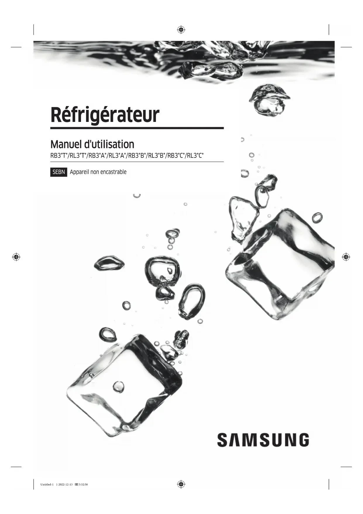 Réfrigérateur Manuel d'utilisation RB3*T*/RL3*T*/RB3*A*/RL3*A*/RB3*B*/RL3*B*/RB3*C*/RL3*C* SEBN Appareil non encastrable Untitled-1 1 2022-12-13 3:32:58Français2 Sommaire Sommaire Consignes de sécurité 4 Ce que vous devez savoir concernant les consignes de sécurité 4 Consignes et symboles de sécurité importants : 7 Mesures importantes de sécurité 8 Symboles d'avertissement importants concernant le transport et le lieu d'installation de l'appareil 12 Avertissements importants concernant l'installation 13 Consignes d'installation 17 Avertissements importants concernant l'utilisation 18 Consignes d'utilisation 24 Consignes de nettoyage 28 Avertissements importants concernant la mise au rebut 30 Conseils complémentaires pour une utilisation appropriée 31 Instructions concernant la règlementation DEEE 33 Installation 34 Présentation rapide du réfrigérateur 34 Installation étape par étape 35 Opérations 41 Panneau de commandes (modèles applicables uniquement) 41 SmartThings (modèles applicables uniquement) 47 Fonctions spéciales 50 Maintenance 54 Inversion de la position de la poignée de la porte (pour les modèles équipés de poignées barres) 54 Inversion de la porte (modèles applicables uniquement) 55 Utilisation et entretien 69 Nettoyage 71 Remplacement 72 Installation en duo (modèles applicables uniquement) 73 Dépannage 80 Généralités 80 Entendez-vous des sons anormaux provenant du réfrigérateur ? 82 SmartThings (modèles applicables uniquement) 84