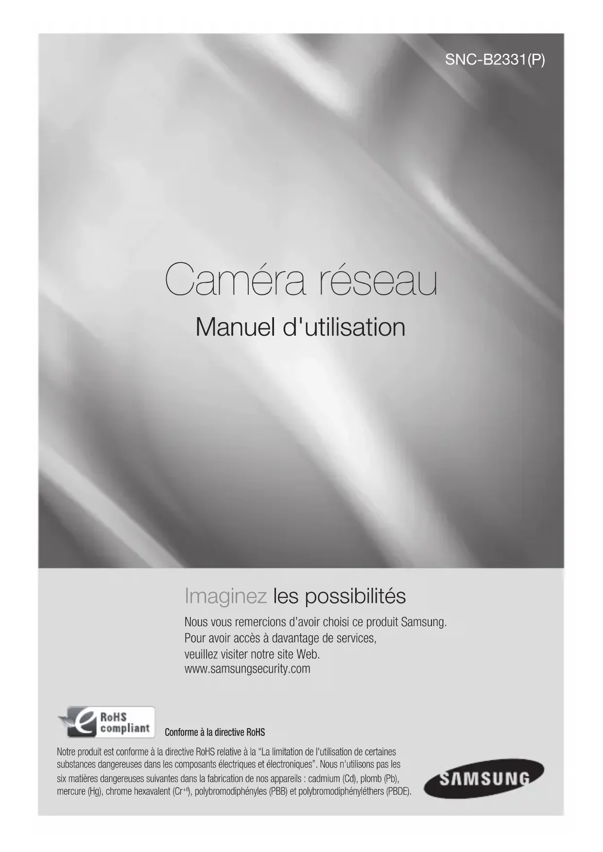 SNC-B2331(P) Imaginez les possibilités Nous vous remercions d’avoir choisi ce produit Samsung. Pour avoir accès à davantage de services, veuillez visiter notre site Web. www.samsungsecurity.com Manuel d'utilisation Caméra réseau Conforme à la directive RoHSNotre produit est conforme à la directive RoHS relative à la “La limitation de l'utilisation de certaines substances dangereuses dans les composants électriques et électroniques”. Nous n'utilisons pas les six matières dangereuses suivantes dans la fabrication de nos appareils : cadmium (Cd), plomb (Pb), mercure (Hg), chrome hexavalent (Cr ), polybromodiphényles (PBB) et polybromodiphényléthers (PBDE).2_ présentation présentation ATTENTION RISQUE DE ECHOC ELECTRIQUE NE PAS OUVRIR ATTENTION: POUR REDUIRE LES RISQUES DE CHOCS ELECTRIQUES, NE RETIREZ PAS LE COUVERCLE (OU LA PARTIE ARRIERE) LES PIECES INTERIEURES NE SONT PAS ACCESSIBLES A L’UTILISATEUR. FAITES APPEL AU PERSONNEL DE MAINTENANCE QUALIFIE. Ce symbole indique la présence, dans cette unité, d’une tension élevée et avise des risques de décharge électrique existants. Ce symbole indique la présence, dans cette unité, d’une tension élevée et avise des risques de décharge électrique existants. ATTENTION Afi n de réduire le risque d’incendie ou de décharge électrique, n’exposez pas cet appareil à la pluie ni à l’humidité. La caméra ne doit être connectée qu’aux réseaux PoE sans routage à l’usine extérieure. AVERTISSEMENT Utiliser uniquement l’adaptateur standard spécifi é dans la fi che technique. L’utilisation de tout autre adaptateur peu causer un incendie, un choc électrique ou endommager le produit. La connexion incorrecte de la source d’alimentation ou le remplacement incorrect de la batterie peut provoquer une explosion, un incendie, un choc électrique ou endommager le produit. Ne pas brancher plus d’une caméra à un adaptateur. Dépasser la capacité peut générer une chaleur anormale ou un incendie. Brancher le cordon d’alimentation sécuritairement à la prise secteur. Une mauvaise connexion peu provoquer un incendie. Lors de l’installation de la caméra, la fi xer solidement et sécuritairement. La chute d’une caméra peut causer des blessures corporelles. Ne pas placer d’objets conducteurs (comme des tournevis, pièces de monnaie, objets métalliques, etc.) ou de contenant remplis d’eau sur la caméra. Cela peut causer des blessures corporelles provoquer par un incendie, un choc électrique ou la chute d’ objets.