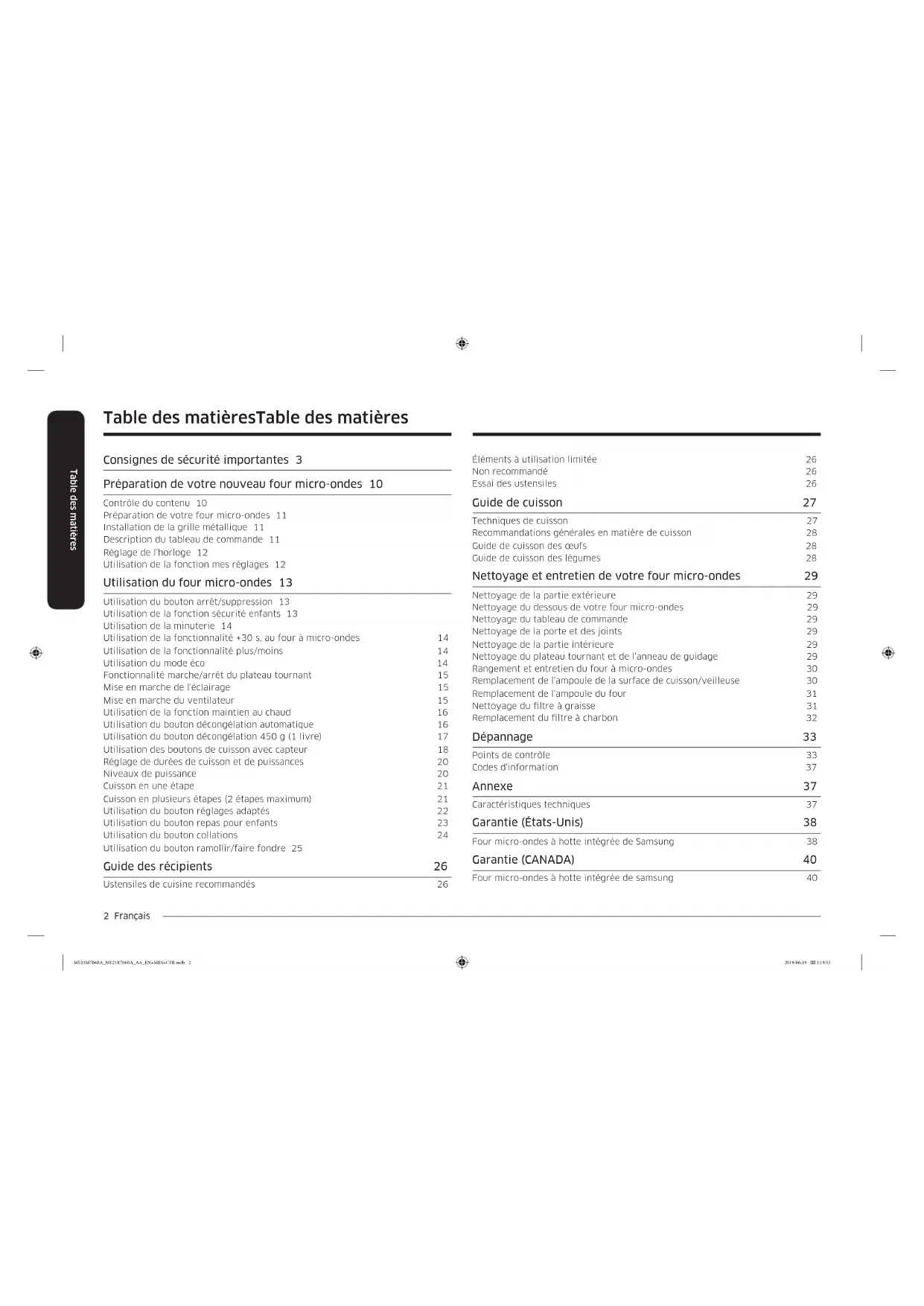 Caractéristiques techniques 37 Garantie (États-Unis) 38 Four micro-ondes à hotte intégrée de Samsung 38 Garantie (CANADA) 40 Four micro-ondes à hotte intégrée de samsung 40 ME21M706BA_ME21R706BA_AA_EN+MES+CFR.indb 2 2019-06-19 3:19:33Français 3 Consignes de sécurité importantes