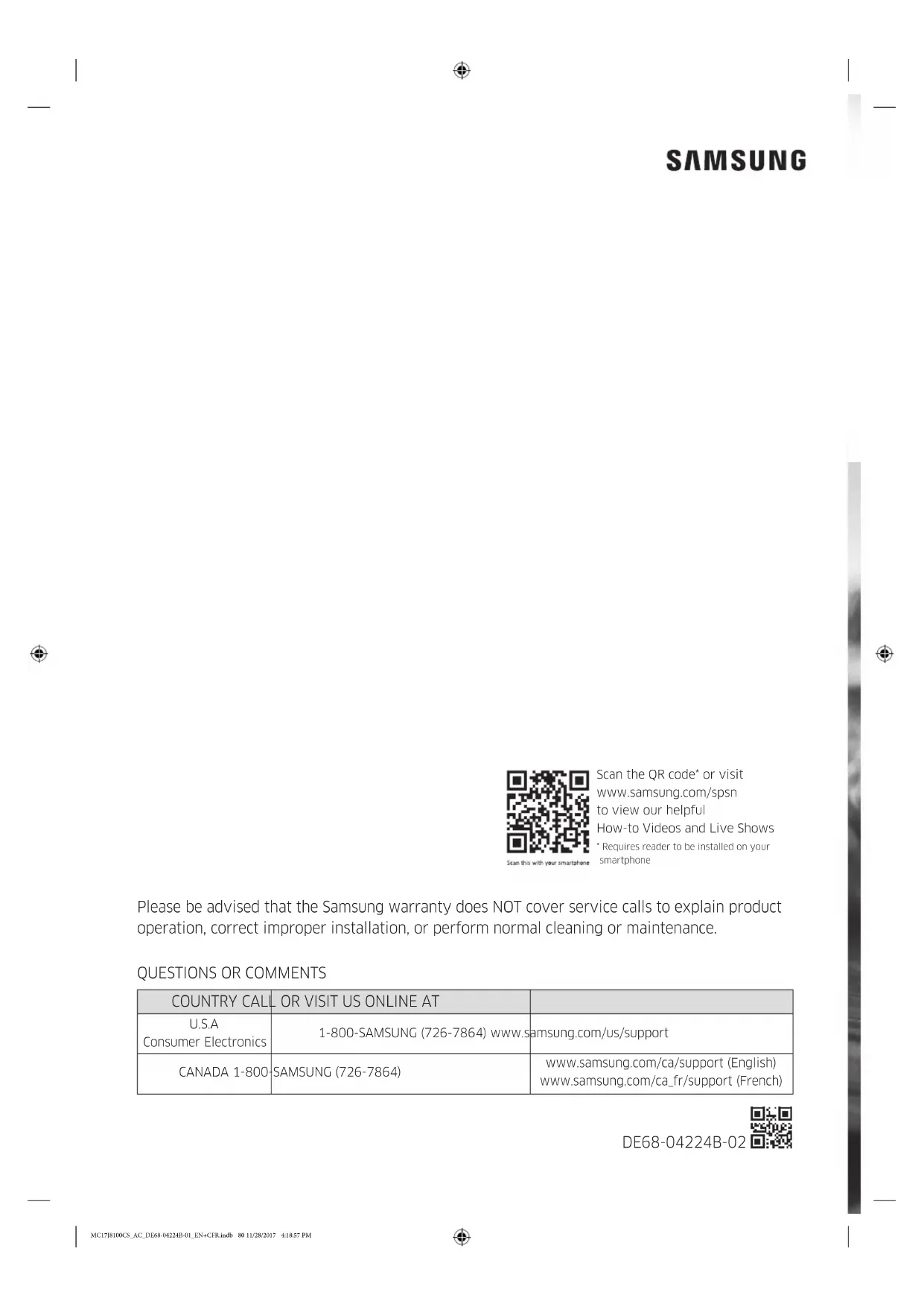 Garantie Four micro-ondes à hotte intégrée de Samsung Garantie limitée à l'acquéreur d'origine Ce produit de la marque SAMSUNG, fourni et distribué par Samsung Electronics Canada, Inc. (SAMSUNG), livré en état neuf dans son carton d'origine et acheté par le consommateur et acquéreur d'origine, s'accompagne d'une garantie de SAMSUNG contre tout vice de fabrication au niveau des pièces et de la main d'œuvre pendant une période limitée de: UN (1) AN POUR LES PIÈCES ET LA MAIN D'ŒUVRE, CINQ (5) ANS POUR LES PIÈCES DU MAGNÉTRON Samsung facturera les travaux de réparation lorsqu'un accessoire doit être réparé ou un défaut esthétique corrigé, si l'endommagement de l'appareil et/ou l'endommagement ou la perte de l'accessoire a été occasionné(e) par le client. Les éléments concernés par cette stipulation sont : - une porte, une poignée, un panneau extérieur ou le tableau de commandes bosselé(e), rayé(e) ou brisé(e) - un plateau, un guide de plateau roulant, un coupleur, un ltre ou une grille métallique brisé(e) ou manquant(e) Les pièces remplacées par l'utilisateur peuvent être envoyées au client pour réparation. Si nécessaire, un ingénieur du service d'assistance pourra être envoyé pour effectuer les réparations. Cette limite de garantie s'applique à compter de la date d'acquisition et couvre uniquement les produits achetés et utilisés aux États-Unis. Pour se prévaloir du service de garantie, l'acheteur doit contacter SAMSUNG an d'établir les procédures relatives au diagnostic et à l'intervention nécessaire. Pour être couverte par la garantie, la maintenance ne peut être effectuée que par un service technique agréé SAMSUNG. Lors de la remise d'un produit défectueux à SAMSUNG ou à un centre de service SAMSUNG agréé, l'acquéreur est tenu de présenter le coupon d'achat d'origine à la demande des intéressés à titre de preuve d'achat. Garantie MC17J8100CS_AC_DE68-04224B-01_EN+CFR.indb 77 11/28/2017 4:19:19 PM78 Français Garantie Garantie La société SAMSUNG prendra en charge, à sa convenance, la réparation ou le remplacement (si une réparation est impossible ) du produit à ses frais, tel que stipulé dans les présentes conditions et procèdera au remplacement ou au reconditionnement des pièces ou des produits si ces derniers s'avèrent défectueux dans la limite de la période de garantie mentionnée précédemment. Toute pièce ou tout produit remplacé devient la propriété de SAMSUNG et doit lui être restitué. Les pièces et produits de rechange sont protégés pour le reste de la période de garantie initiale ou pour quatre-vingt-dix (90) jours, selon l’éventualité la plus éloignée. En fonction des disponibilités sur le territoire des États-Unis contigus, un service à domicile est proposé dans la limite de la période de garantie. Le service à domicile n'est pas disponible pour toutes les zones. Pour bénécier du service à domicile, l’appareil doit être facilement accessible à notre personnel. Dans le cas où il serait impossible de réparer l’appareil au cours du service à domicile, il se peut que l’appareil doive être emporté, réparé et retourné. En cas d’indisponibilité du service à domicile, SAMSUNG pourra choisir le moyen de transport de son choix pour acheminer ou renvoyer l’appareil vers et depuis un centre de service agréé de SAMSUNG. Dans le cas contraire, la responsabilité du transport vers et depuis le centre de service agréé de SAMSUNG incombera à l’acquéreur. Cette garantie limitée couvre les défauts de fabrication relatifs aux matériaux ou à la main d’œuvre survenant dans le cadre d’un usage normal et non commercial de ce produit et ne s’applique pas aux situations suivantes, sans pour autant s'y limiter: tout dommage survenant au cours de l'expédition, la livraison et l'installation; toute utilisation de l'appareil contraire au but auquel il était destiné; tout numéro de produit ou de série effacé; tout dommage du revêtement extérieur ou de l'aspect du produit; tout dommage causé par accident, abus, négligence, incendie, inondation, foudre ou autre catastrophe naturelle; toute utilisation de produits, équipements, systèmes, appareils, services, pièces, fournitures, accessoires, applications, installations, réparations, câblages externes ou connecteurs non fournis ou autorisés par SAMSUNG et susceptibles d’endommager ledit appareil ou de nuire à son fonctionnement; toute surtension, uctuation ou tension de ligne électrique incorrecte; tout réglage effectué par l'acquéreur et non-respect des instructions de fonctionnement, de nettoyage, d'entretien et de respect de l'environnement couvertes et prescrites dans le carnet d'instructions; tout problème résultant d'une prolifération d'insectes nuisibles, d'une surchauffe ou d'un plat trop cuit par l'utilisateur; les problèmes relatif au plateau en verre ou au plateau tournant ou à une puissance réduite du magnétron en raison d'une usure normale. SAMSUNG ne garantit pas un fonctionnement continu ou sans erreur de ce produit. MC17J8100CS_AC_DE68-04224B-01_EN+CFR.indb 78 11/28/2017 4:19:19 PMFrançais