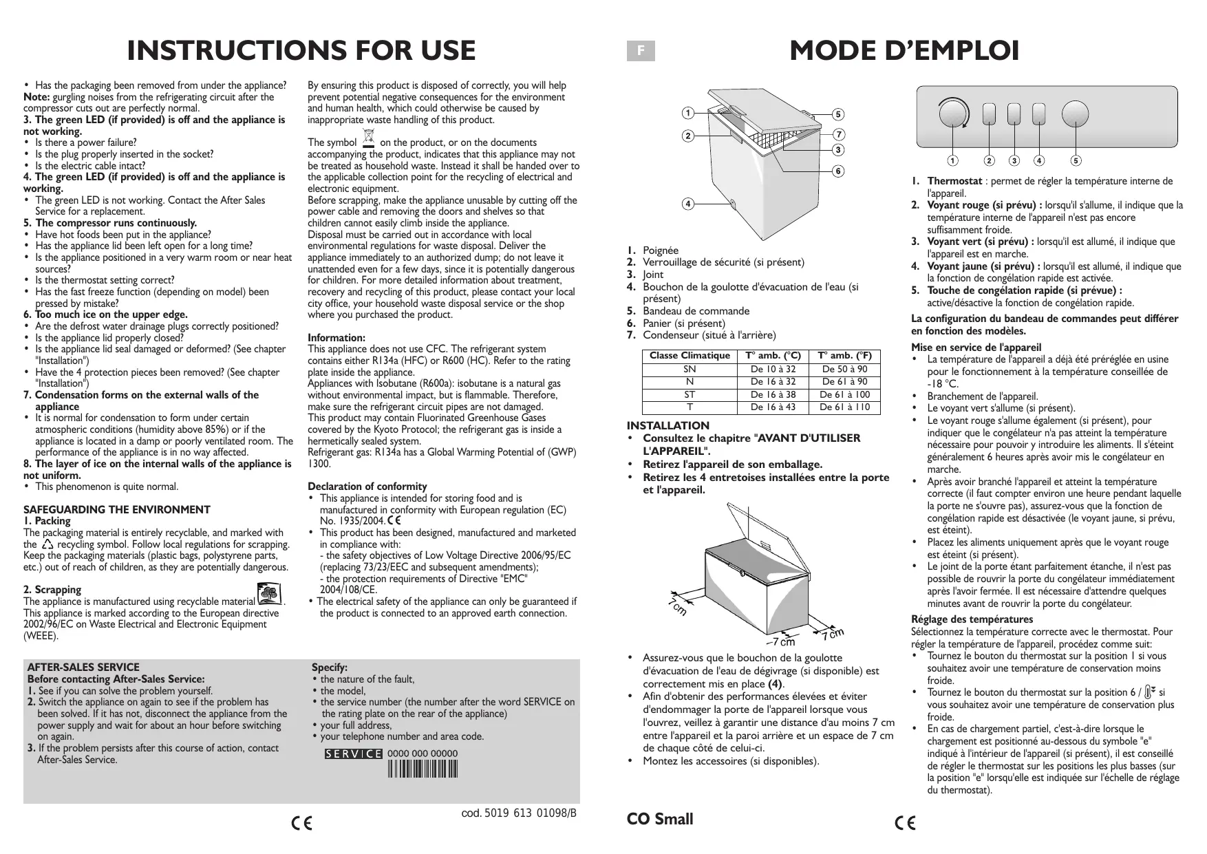 MODE D’EMPLOI AVANT D'UTILISER L'APPAREIL L'appareil que vous venez d'acheter est réservé exclusivement à des fins domestiques et sert à conserver les aliments surgelés, à congeler des aliments frais et à fabriquer des glaçons.