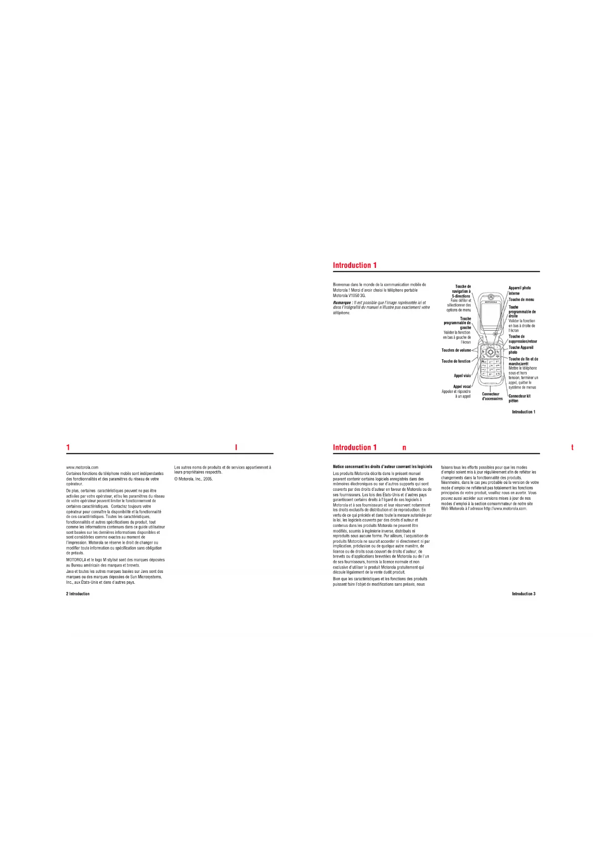 - Introduction 1 Introduction 1 1Introduction Bienvenue dans le monde de la communication mobile de Motorola ! Merci d'avoir choisi le téléphone portable Motorola V1050 3G. Remarque : Il est possible que l'image représentée ici et dans l'intégralité du manuel n'illustre pas exactement votre téléphone. Touche de menu Touche programmable de droite Valider la fonction en bas à droite de l'écran Touche de suppression/retour Touche Appareil photo Touche de fin et de marche/arrêt Mettre le téléphone sous et hors tension, terminer un appel, quitter le système de menus Connecteur kit piéton Connecteur d'accessoires Touche de navigation à 5-directions Faire défiler et sélectionner des options de menu Touche programmable de gauche Valider la fonction en bas à gauche de l'écran Touches de volume Touche de fonction Appel visio Appel vocal Appeler et répondre à un appel Appareil photo interne 1Introduction 2 Introduction www.motorola.com Certaines fonctions du téléphone mobile sont indépendantes des fonctionnalités et des paramètres du réseau de votre opérateur. De plus, certaines caractéristiques peuvent ne pas être activées par votre opérateur, et/ou les paramètres du réseau de votre opérateur peuvent limiter le fonctionnement de certaines caractéristiques. Contactez toujours votre opérateur pour connaître la disponibilité et la fonctionnalité de ces caractéristiques. Toutes les caractéristiques, fonctionnalités et autres spécifications du produit, tout comme les informations contenues dans ce guide utilisateur sont basées sur les dernières informations disponibles et sont considérées comme exactes au moment de l’impression. Motorola se réserve le droit de changer ou modifier toute information ou spécification sans obligation de préavis. MOTOROLA et le logo M stylisé sont des marques déposées au Bureau américain des marques et brevets. Java et toutes les autres marques basées sur Java sont des marques ou des marques déposées de Sun Microsystems, Inc., aux États-Unis et dans d'autres pays. Les autres noms de produits et de services appartiennent à leurs propriétaires respectifs. © Motorola, Inc., 2005. Introduction 1 Introduction 3 Notice concernant les droits d'auteur couvrant les logiciels Les produits Motorola décrits dans le présent manuel peuvent contenir certains logiciels enregistrés dans des mémoires électroniques ou sur d'autres supports qui sont couverts par des droits d'auteur en faveur de Motorola ou de ses fournisseurs. Les lois des États-Unis et d'autres pays garantissent certains droits à l'égard de ces logiciels à Motorola et à ses fournisseurs et leur réservent notamment les droits exclusifs de distribution et de reproduction. En vertu de ce qui précède et dans toute la mesure autorisée par la loi, les logiciels couverts par des droits d'auteur et contenus dans les produits Motorola ne peuvent être modifiés, soumis à ingénierie inverse, distribués ni reproduits sous aucune forme. Par ailleurs, l'acquisition de produits Motorola ne saurait accorder ni directement ni par implication, préclusion ou de quelque autre manière, de licence ou de droits sous couvert de droits d'auteur, de brevets ou d'applications brevetées de Motorola ou de l'un de ses fournisseurs, hormis la licence normale et non exclusive d'utiliser le produit Motorola gratuitement qui découle légalement de la vente dudit produit. Bien que les caractéristiques et les fonctions des produits puissent faire l'objet de modifications sans préavis, nous faisons tous les efforts possibles pour que les modes d'emploi soient mis à jour régulièrement afin de refléter les changements dans la fonctionnalité des produits. Néanmoins, dans le cas peu probable où la version de votre mode d'emploi ne reflèterait pas totalement les fonctions principales de votre produit, veuillez nous en avertir. Vous pouvez aussi accéder aux versions mises à jour de nos modes d'emploi à la section consommateur de notre site Web Motorola à l'adresse http://www.motorola.com.2Sommaire 4 Sommaire Introduction p. 1