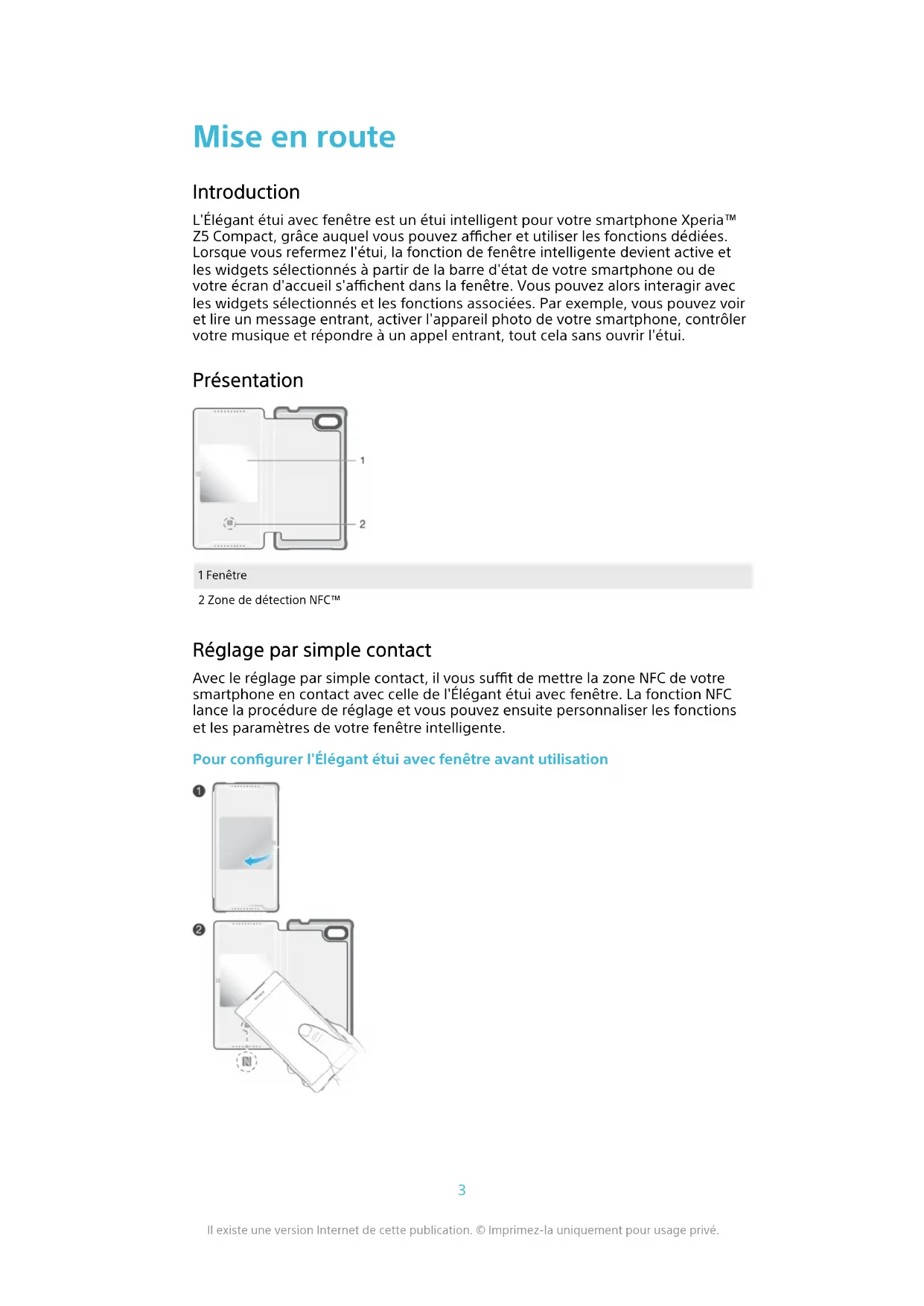 - Declaration of Conformity 2Mise en route Introduction L'Élégant étui avec fenêtre est un étui intelligent pour votre smartphone Xperia™ Z5 Compact, grâce auquel vous pouvez acher et utiliser les fonctions dédiées. Lorsque vous refermez l'étui, la fonction de fenêtre intelligente devient active et les widgets sélectionnés à partir de la barre d'état de votre smartphone ou de votre écran d'accueil s'achent dans la fenêtre. Vous pouvez alors interagir avec les widgets sélectionnés et les fonctions associées. Par exemple, vous pouvez voir et lire un message entrant, activer l'appareil photo de votre smartphone, contrôler votre musique et répondre à un appel entrant, tout cela sans ouvrir l'étui. Présentation 1 Fenêtre 2 Zone de détection NFC™ Réglage par simple contact Avec le réglage par simple contact, il vous sut de mettre la zone NFC de votre smartphone en contact avec celle de l'Élégant étui avec fenêtre. La fonction NFC lance la procédure de réglage et vous pouvez ensuite personnaliser les fonctions et les paramètres de votre fenêtre intelligente. Pour configurer l'Élégant étui avec fenêtre avant utilisation p. 12