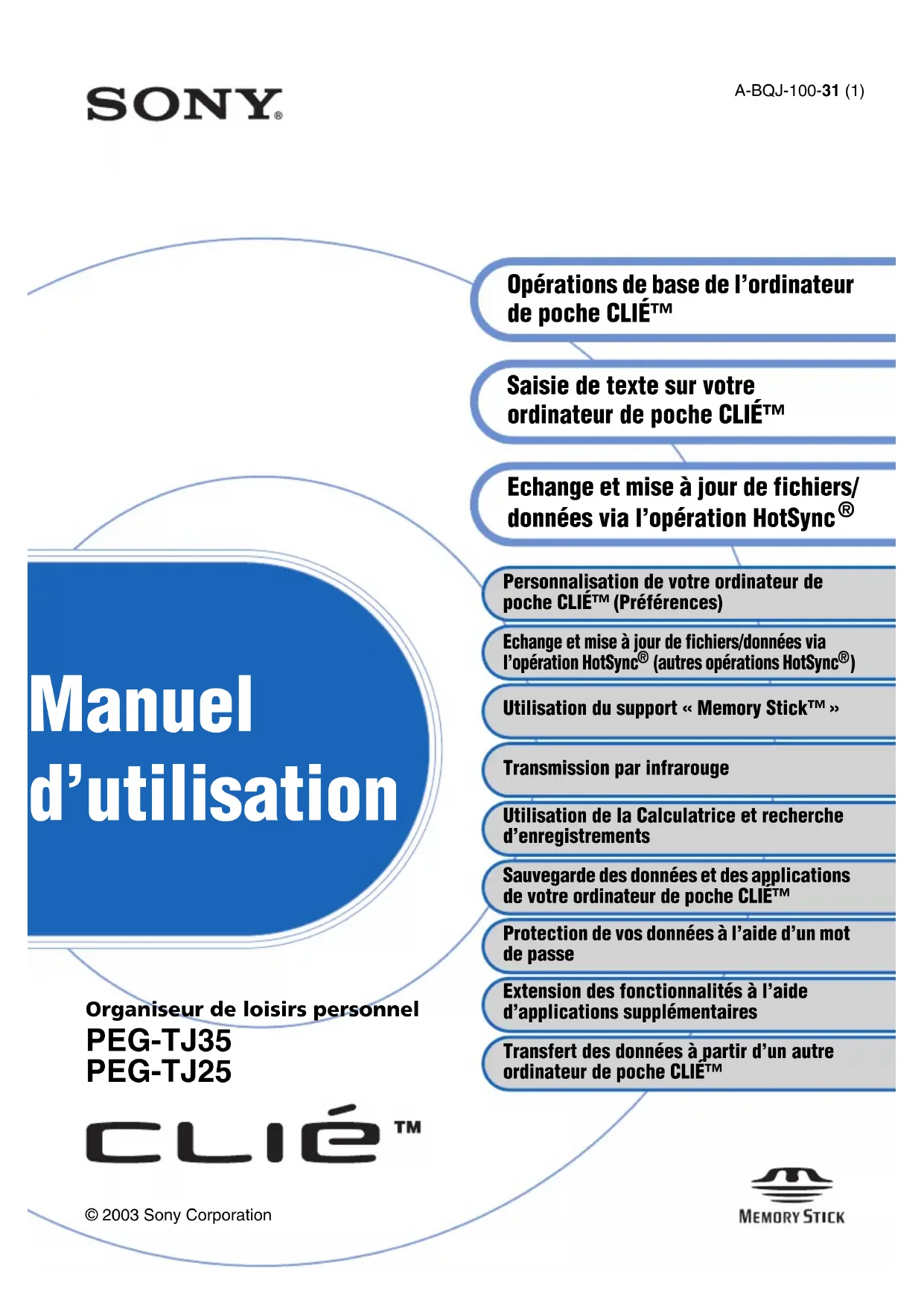 Verrouillage . . . . . . . . . . . . . . . . . . . . .181 01FR01COV.book Page 203 Thursday, September 25, 2003 10:48 AMOrganiseur de loisirs personnel Sony PEG-TJ35/TJ25 (FR) A-BQJ-100-31 (1) Pour obtenir les toutes dernières informations à propos du support et des produits et accessoires CLIÉ, consultez notre site Web officiel CLIÉ Sony Pour les utilisateurs résidant aux Etats-Unis et au Canada http ://www.sony.com/clie/ Pour les utilisateurs résidant en Australie, à Hong Kong, en Malaisie, au Mexique, en Nouvelle-Zélande, à Singapour, à Taiwan, en Thaïlande et aux Emirats arabes unis http ://www.sony.net/clie-online/ Pour les utilisateurs résidant en Europe http ://www.clieplaza.com 01FR01COV.book Page 204 Thursday, September 25, 2003 10:48 AM
