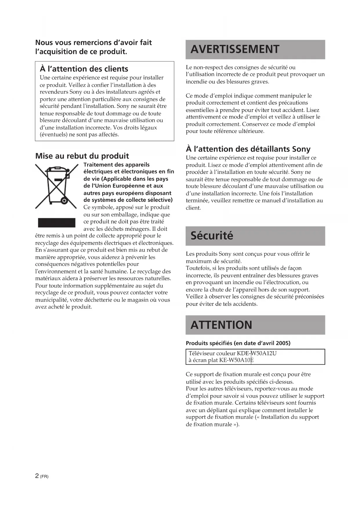 *Veggen som TV-apparatet skal monteres på må kunne bære en vekt som er minst fire ganger vekten til TV-apparatet. FORSIKTIG Denne veggmonteringskonsollen er konstruert for bruk sammen med produktene spesifisert ovenfor. For andre TV-apparater, se i disse apparatenes instruksjonsbøker for å se om denne konsollen kan benyttes. Noen TV-apparater levers med et hefte som inneholder målskisse for montering av TV-apparatet ("Montere veggmonteringskonsollen"). TV-mål Enhet: mm (tommer) Lengde på hver monteringsvinkel Enhet: mm (tommer) Vekt TV-modellABCDE Monteringsvinkel FGHVekt (× 4)* (αº)0º 185 (7 5/16) 340 (13 13/32) 56 (2 7/32)KDE-W50A12U 1336 789 89 343 565º 245 (9 21/32) 327 (12 7/8) 66 (2 5/8)52 kg 208 kg10º 303 (11 15/16) 310 (12 7/32) 74 (2 15/16) KE-W50A10E (52 5/8) (31 1/16) (3 1/2) (13 1/2) (2 7/32) 15º 359 (14 5/32) 291 (11 15/32) 80 (3 5/32)114lb 11oz 458lb 9oz20º 412 (16 1/4) 268 (10 9/16) 83 (3 9/32)393 ± 0,5(15 15/32 ± 5/256)Skjermens senterlinje17 (NO) Måldiagram for veggbehandling Hull for trekking av kabel Hull med spor Enhet: mm (tommer) 670 (26 3/8) 610 (24) 455 (17 15/16) 406 (16) 420 (16 17/32) 65,5 (2 37/64) ø 75 (3) 20 – 9 × 20 (23/64 × 5/6) 13,5 (17/32) 393 ± 0,5 (15 15/32 ± 5/256) 131 (5 5/32) 131 (5 5/32)2 (FR) Nous vous remercions d’avoir fait l’acquisition de ce produit. À l’attention des clients Une certaine expérience est requise pour installer ce produit. Veillez à confier l’installation à des revendeurs Sony ou à des installateurs agréés et portez une attention particulière aux consignes de sécurité pendant l'installation. Sony ne saurait être tenue responsable de tout dommage ou de toute blessure découlant d’une mauvaise utilisation ou d’une installation incorrecte. Vos droits légaux (éventuels) ne sont pas affectés. Mise au rebut du produit Traitement des appareils électriques et électroniques en fin de vie (Applicable dans les pays de l'Union Européenne et aux autres pays européens disposant de systèmes de collecte sélective) Ce symbole, apposé sur le produit ou sur son emballage, indique que ce produit ne doit pas être traité avec les déchets ménagers. Il doit être remis à un point de collecte approprié pour le recyclage des équipements électriques et électroniques. En s'assurant que ce produit est bien mis au rebut de manière appropriée, vous aiderez à prévenir les conséquences négatives potentielles pour l'environnement et la santé humaine. Le recyclage des matériaux aidera à préserver les ressources naturelles. Pour toute information supplémentaire au sujet du recyclage de ce produit, vous pouvez contacter votre municipalité, votre déchetterie ou le magasin où vous avez acheté le produit. AVERTISSEMENT Le non-respect des consignes de sécurité ou l’utilisation incorrecte de ce produit peut provoquer un incendie ou des blessures graves. Ce mode d’emploi indique comment manipuler le produit correctement et contient des précautions essentielles à prendre pour éviter tout accident. Lisez attentivement ce mode d’emploi et veillez à utiliser le produit correctement. Conservez ce mode d’emploi pour toute référence ultérieure. À l’attention des détaillants Sony Une certaine expérience est requise pour installer ce produit. Lisez ce mode d’emploi attentivement afin de procéder à l’installation en toute sécurité. Sony ne saurait être tenue responsable de tout dommage ou de toute blessure découlant d’une mauvaise utilisation ou d’une installation incorrecte. Une fois l’installation terminée, veuillez remettre ce manuel d’installation au client. Sécurité Les produits Sony sont conçus pour vous offrir le maximum de sécurité. Toutefois, si les produits sont utilisés de façon incorrecte, ils peuvent entraîner des blessures graves en provoquant un incendie ou l’électrocution, ou encore la chute de l’appareil hors de son support. Veillez à observer les consignes de sécurité préconisées pour éviter de tels accidents. ATTENTION Produits spécifiés (en date d’avril 2005) Téléviseur couleur KDE-W50A12U à écran plat KE-W50A10E Ce support de fixation murale est conçu pour être utilisé avec les produits spécifiés ci-dessus. Pour les autres téléviseurs, reportez-vous au mode d’emploi pour savoir si vous pouvez utiliser le support de fixation murale. Certains téléviseurs sont fournis avec un dépliant qui explique comment installer le support de fixation murale (« Installation du support de fixation murale »).3 (FR) À l’attention des clients AVERTISSEMENT Le non-respect des consignes suivantes peutêtre fatal ou entraîner des blessures graves enprovoquant un incendie ou l’électrocution, ouencore la chute de l’appareil hors de sonsupport. Veillez à confier l’installation à des installateurs agréés en tenant les petits enfants à l’écart pendant l’installation. Si le support de fixation murale ou le téléviseur n’estpas installé correctement, les accidents suivantspeuvent se produire. Veillez à confier l’installation àdes installateurs agréés.• Le téléviseur peut tomber et causer des blessuresgraves comme des hématomes ou des fractures.• Si le mur sur lequel le support de fixation murale estfixé est instable, inégal ou non perpendiculaire ausol, l’appareil risque de tomber et de provoquer desblessures ou des dommages matériels. Le mur doitpouvoir supporter un poids équivalent à au moinsquatre fois le poids du téléviseur. (Reportez-vous autableau des dimensions d’installation du téléviseur àla page 16 pour obtenir le poids de chaquetéléviseur.)• Si l’installation du support de fixation murale n’estpas assez solide, l’appareil risque de tomber et deprovoquer des blessures ou des dommagesmatériels. Veillez à confier le déplacement ou le démontage du téléviseur à des installateurs agréés. Si des personnes autres que des installateurs agrééstransportent 