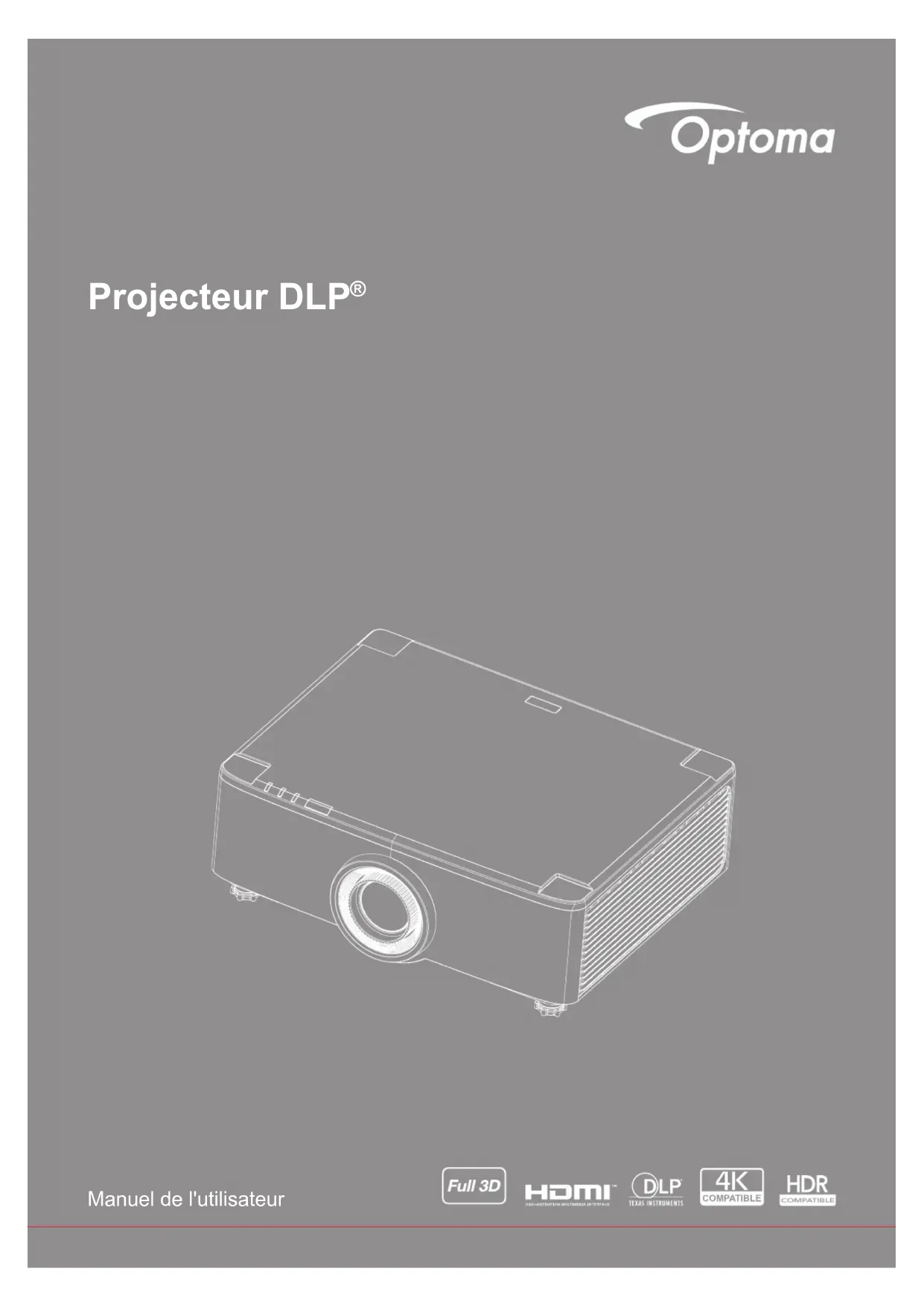 Informations relatives à la sécurité du laser Conforme aux 21 CFR 1040.10 et 1040.11 à l'exception de la conformité en tant que LIP du groupe de risque 2, tel que déni dans la CEI 62471- 5: Ed. 1,0. Pour plus d'informations, consultez l'avis relatif au laser n° 57 du 8 mai 2019. CEI 60825-1:2014: PRODUIT LASER DE CLASSE 1 - GROUPE DE RISQUE 2 Ce projecteur possède un module laser intégré de classe 4. Tout démontage ou modication est très dangereux et ne doit jamais être tenté. Toute opération ou réglage non spéciquement indiqué dans le manuel d'utilisation constitue un risque d'exposition dangereuse au rayonnement laser. Ne pas ouvrir ou démonter le projecteur car cela pourrait provoquer des dégâts par exposition au rayonnement laser. Ne pas xer le faisceau lorsque le projecteur est allumé. La lumière brillante peut causer des dommages permanents aux yeux. Lorsque vous allumez le projecteur, assurez-vous que personne dans la plage de projection ne regarde l'objectif. À défaut de suivre la procédure de contrôle, de réglage ou d’utilisation, il y a risque de provoquer des dégâts par exposition au rayonnement laser. Instructions adéquates pour le montage, l'utilisation et la maintenance, y compris des avertissements clairs concernant les précautions à prendre pour éviter toute exposition éventuelle au laser et aux rayonnements collatéraux dépassant les limites d'émission acceptables en classe 2. L’appareil numérique de Classe A est conforme à toutes les exigences de la réglementation canadienne concernant les appareils provoquant des interférences. Réglementation concernant les appareils provoquant des interférences. Cet appareil numérique de la class A respecte toutes les exigences du Règlement sur le matériel brouilleur du Canada. Il est conseillé de surveiller les enfants et de ne jamais les laisser regarder le faisceau du projecteur quelle que soit la distance du projecteur. Il est conseillé de faire preuve de prudence lorsque vous utilisez la télécommande pour démarrer le projecteur face à l’objectif de projection. Il est conseillé à l’utilisateur d'éviter d'utiliser des aides optiques telles que des jumelles ou des télescopes dans le faisceauFrançais 7 Consignes de sécurité pour la 3D Veuillez suivre les avertissements et précautions indiqués avant que vous ou votre enfant utilisiez la fonction 3D. Avertissement Les enfants et les adolescents peuvent être plus sensibles aux problèmes de santé liés aux contenus 3D et doivent être étroitement surveillés lors de la visualisation de ces images. Attention à l’épilepsie photosensible et aux autres risques de santé Certains spectateurs peuvent subir une crise d’épilepsie ou un accident vasculaire cérébral lorsqu’ils sont exposés à certaines images ou lumières clignotantes dans les images de certains projecteurs ou jeux vidéo. Si vous souffrez d’épilepsie ou d’un accident vasculaire cérébral , ou si avez des antécédents familiaux, veuillez consulter un médecin spécialiste avant d’utiliser la fonction 3D. Même ceux qui n’ont pas d’antécédents personnels ou familiaux d’épilepsie ou d’AVC peuvent présenter un état non diagnostiqué susceptible de provoquer des crises d’épilepsie photosensible. Les femmes enceintes, les personnes âgées, les personnes souffrant de troubles médicaux graves, qui sont privées de sommeil ou sous l’inuence d’alcool doivent éviter l’utilisation des fonctionnalités 3D de l’appareil. Si vous ressentez un des symptômes suivants, cessez immédiatement de visionner des images 3D et consultez un médecin spécialiste : (1) troubles de la vision; (2) tête légère; (3) étourdissements; (4) mouvements involontaires tels que convulsions, contractions oculaires ou musculaires, (5) confusion; (6) nausées; (7) perte de conscience; (8) convulsions; (9) crampes, et / ou (10) désorientation. Les enfants et les adolescents sont plus susceptibles que les adultes de ressentir ces symptômes. Les parents doivent surveiller leurs enfants et leur demander s’ils ressentent ces symptômes. Une projection 3D peut également provoquer le mal des transports, des effets résiduels perceptifs, une désorientation, une fatigue oculaire et une diminution de la stabilité posturale. Il est recommandé aux utilisateurs de prendre des pauses fréquentes pour réduire le risque de ces effets. Si vos yeux montrent des signes de fatigue ou de sécheresse ou si vous avez un des symptômes ci-dessus, cessez immédiatement d’utiliser cet appareil et ne reprenez pas avant au moins 30 minutes après la disparition des symptômes. Le fait de regarder la projection 3D tout en restant assis trop près de l’écran pendant une longue période de temps peut endommager votre vue. La distance de visualisation idéale doit être d’au moins trois fois la hauteur de l’écran. Il est recommandé que les yeux du spectateur soient au niveau de l’écran. Le fait de regarder une projection 3D avec des lunettes 3D pendant une période de temps prolongée peut causer un mal de tête ou de la fatigue. Si vous ressentez un mal de tête, de la fatigue ou des étourdissements, cessez de visionner la projection 3D et reposez-vous. N’utilisez pas les lunettes 3D à des ns autres que la visualisation d’une projection 3D. Le fait de porter les lunettes 3D à d’autres ns (comme lunettes de vue, lunettes de soleil, lunettes de protection, etc.) peut être physiquement dangereux pour vous et peut affaiblir votre vue. Certains téléspectateurs peuvent se sentir désorientés lorsqu’ils regardent une projection 3D. En conséquence, ne placez pas votre PROJECTEUR 3D près d’escaliers à découvert, de câbles, de balcons, ou d’autres objets qui peuvent faire trébucher ou tomber, être heurtés, renversés, ou brisés. Avis sur le droit d'auteur Ce documentation, y compris toutes les photos, les illustrations et le logiciel est