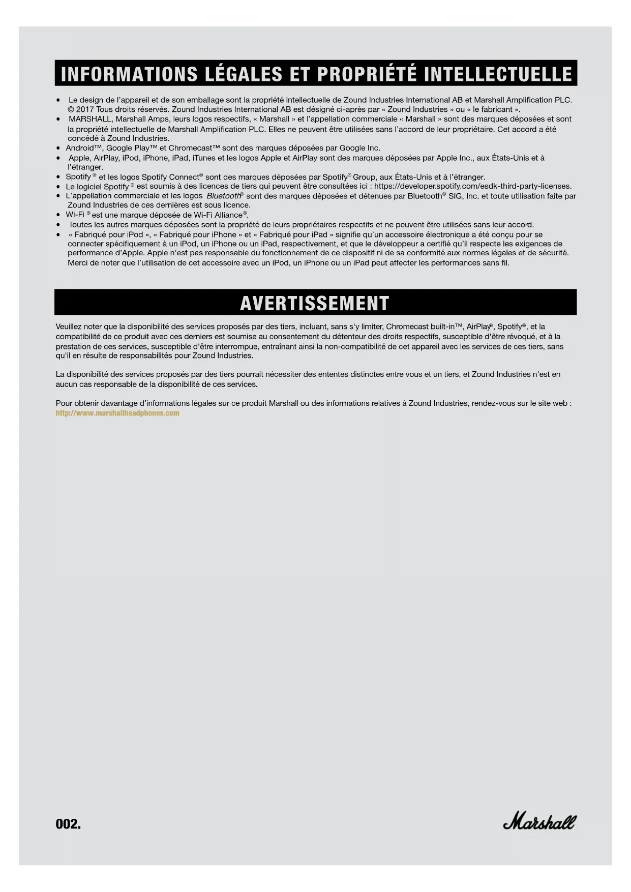 , Spotify , et la compatibilité de ce produit avec ces derniers est soumise au consentement du détenteur des droits respectifs, susceptible d'être révoqué, et à la prestation de ces services, susceptible d'être interrompue, entraînant ainsi la non-compatibilité de cet appareil avec les services de ces tiers, sans qu'il en résulte de responsabilités pour Zound Industries. La disponibilité des services proposés par des tiers pourrait nécessiter des ententes distinctes entre vous et un tiers, et Zound Industries n'est en aucun cas responsable de la disponibilité de ces services. Pour obtenir davantage d’informations légales sur ce produit Marshall ou des informations relatives à Zound Industries, rendez-vous sur le site web: http://www.marshallheadphones.comCONSIGNES DE SÉCURITÉ IMPORTANTES