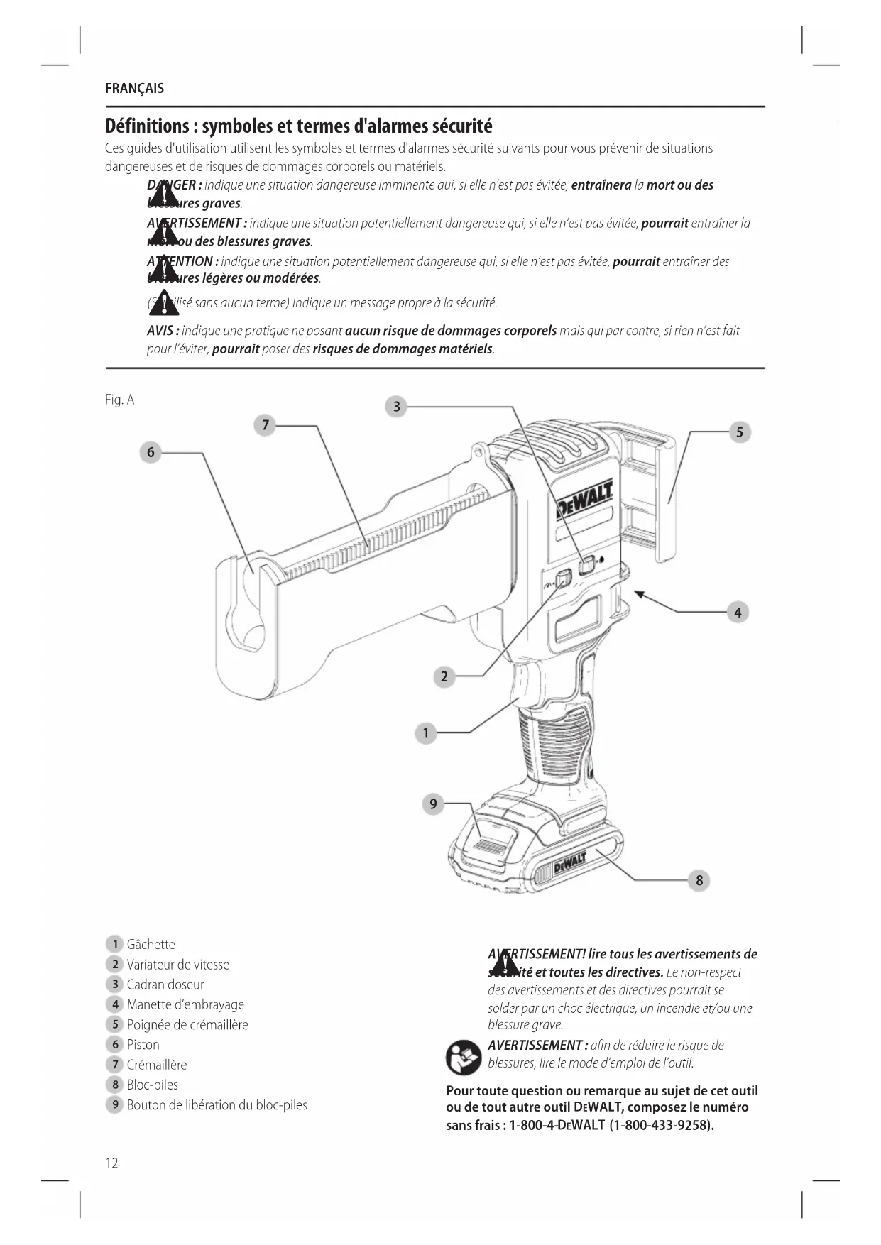 D'AVERTISSEMENT: si les étiquettes d'avertissement deviennent illisibles ou sont manquantes, composer le 1 800 433-9258 (1 800 4-DEWALT) pour en obtenir le remplacement gratuit.