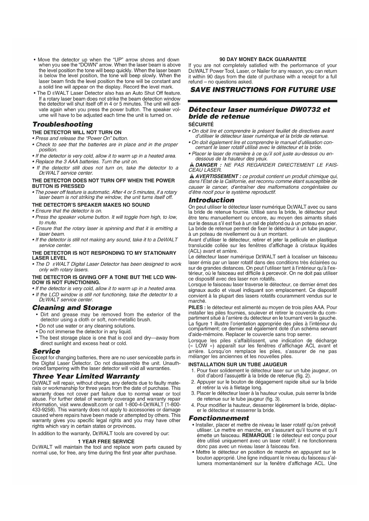- Ranger le détecteur dans un endroit frais et sec, en s’assurant de le protéger des rayons directs du soleil et des températures excessives. Entretien À l’exception des piles qu’on doit remplacer, le détecteur laser numérique ne comprend aucune autre pièce interne destinée à être entretenue par l’utilisateur. Ne pas démonter le détecteur. Le fait de le modifier annulera toute garantie appuyant ce produit. Garantie limitée de trois ans DEWALT réparera, sans frais, tout produit défectueux causé par un défaut de matériel ou de fabrication pour une période de trois ans à compter de la date d’achat. La présente garantie ne couvre pas les pièces dont la défectuosité a été causée par une usure normale ou l’usage abusif de l’outil. Pour obtenir de plus amples renseigne- ments sur les pièces ou les réparations couvertes par la présente garantie, visiter le site www.dewalt.com ou composer le 1 800 433- 9258 (1 800 4-D EWALT). Cette garantie ne s’applique pas aux accessoires et ne vise pas les dommages causés par des répara- tions effectuées par un tiers. Cette garantie confère des droits légaux particuliers à l’acheteur, mais celui-ci pourrait aussi bénéfici- er d’autres droits variant d’un état ou d’une province à l’autre. En plus de la présente garantie, les outils D EWALT sont couverts par notre : CONTRAT D’ENTRETIEN GRATUIT D’UN AN