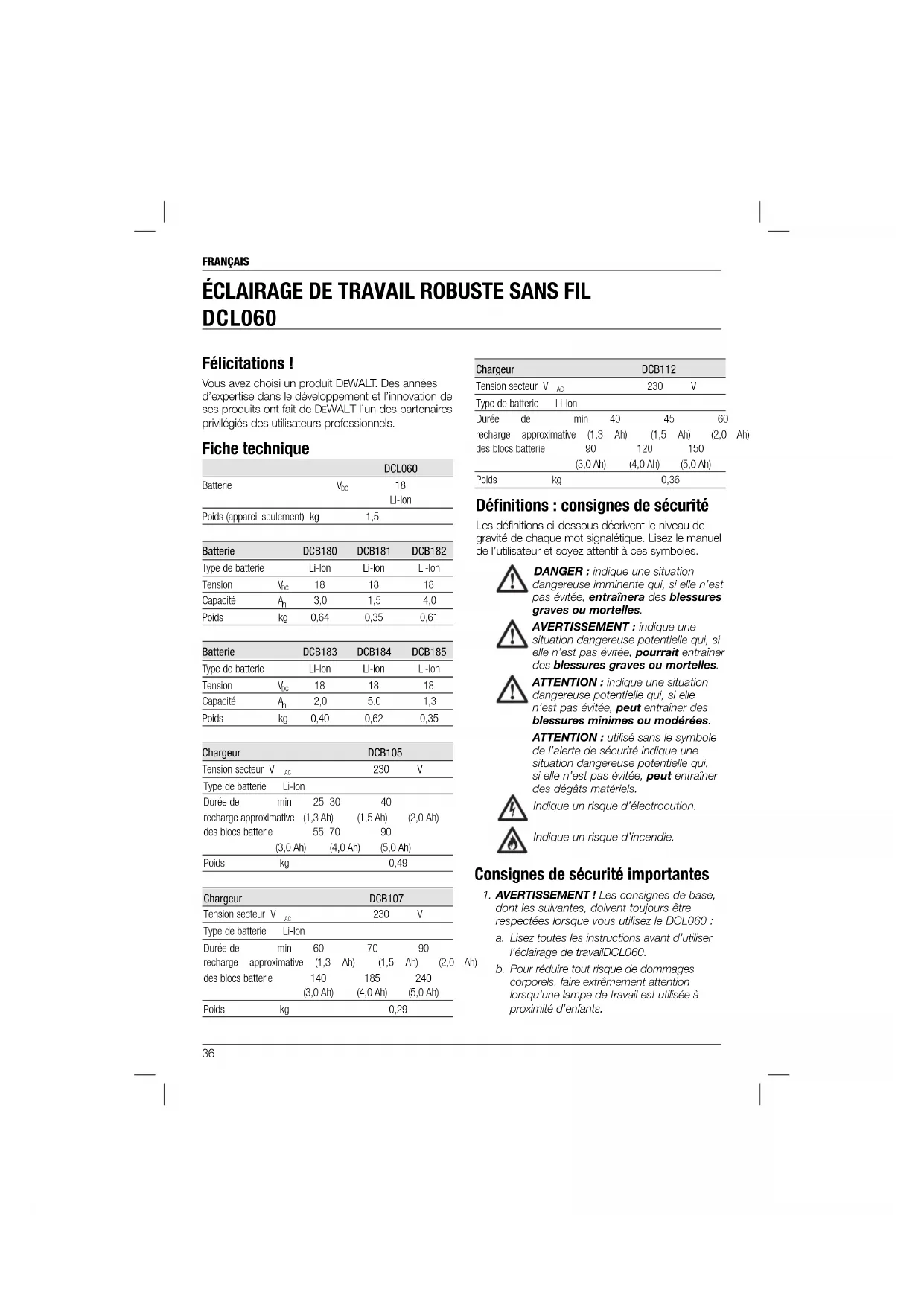 dont les suivantes, doivent toujours être respectées lorsque vous utilisez le DCL060 : a. Lisez toutes les instructions avant d’utiliser l’éclairage de travailDCL060. b. Pour réduire tout risque de dommages corporels, faire extrêmement attention lorsqu’une lampe de travail est utilisée à proximité d’enfants. Félicitations! Vous avez choisi un produit DEWALT. Des années d’expertise dans le développement et l’innovation de ses produits ont fait de D EWALT l’un des partenaires privilégiés des utilisateurs professionnels. Fiche technique DCL060 Batterie V