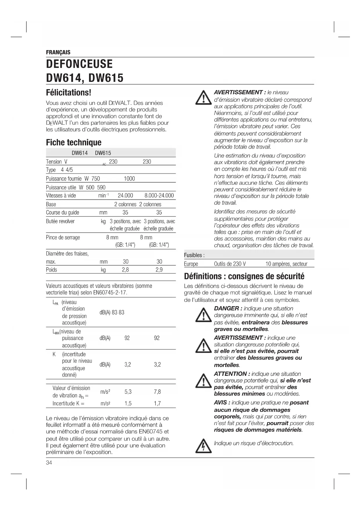 a) La fiche électrique de l’outil doit correspondre à la prise murale. Ne modifier la fiche en aucune façon. Ne pas utiliser de fiche d’adaptation avec un outil électrique mis à la terre (masse). L’utilisation de fiches d’origine et de prises appropriées réduira tout risque de décharges électriques. b) Éviter tout contact corporel avec des éléments mis à la terre comme: tuyaux, radiateurs, cuisinières ou réfrigérateurs. Les risques de décharges électriques augmentent lorsque le corps est mis à la terre. c) Ne pas exposer les outils électriques à la pluie ou à l’humidité. Tout contact d’un outil électrique avec un liquide augmente les risques de décharges électriques. d) Ne pas utiliser le cordon de façon abusive. Ne jamais utiliser le cordon pour transporter, tirer ou débrancher un outil électrique. Protéger le cordon de toute source de chaleur, de l’huile, et de tout bord tranchant ou pièce mobile. Les cordons endommagés ou emmêlés augmentent les risques de décharges électriques. e) En cas d’utilisation d’un outil électrique à l’extérieur, utiliser systématiquement une rallonge conçue à cet effet. Cela diminuera tout risque de décharges électriques. f) Si on ne peut éviter d’utiliser un outil électrique en milieu humide, utiliser un circuit protégé par un dispositif de courant résiduel (RCD). Cela réduira tout risque de décharges électriques. Indique un risque d’incendie. Déclaration de conformité CE DIRECTIVES MACHINES DEFONCEUSE DW614, DW615 DeWALT certifie que les produits décrits dans le paragraphe Fiche technique sont conformes aux normes: 2006/42/CE, EN60745-1:2009+A11:2010, EN60745-2-17:2010. Ces produits sont également compatibles avec les Directives 2004/108/CE (jusqu’au 19/04/2016), 2014/30/UE (à partir du 20/04/2016) et 2011/65/UE. Pour plus d’informations, veuillez contacter DeWALT à l’adresse suivante ou vous reporter au dos de cette notice d’instructions. Le soussigné est responsable de la compilation du fichier technique et fait cette déclaration au nom de DeWALT