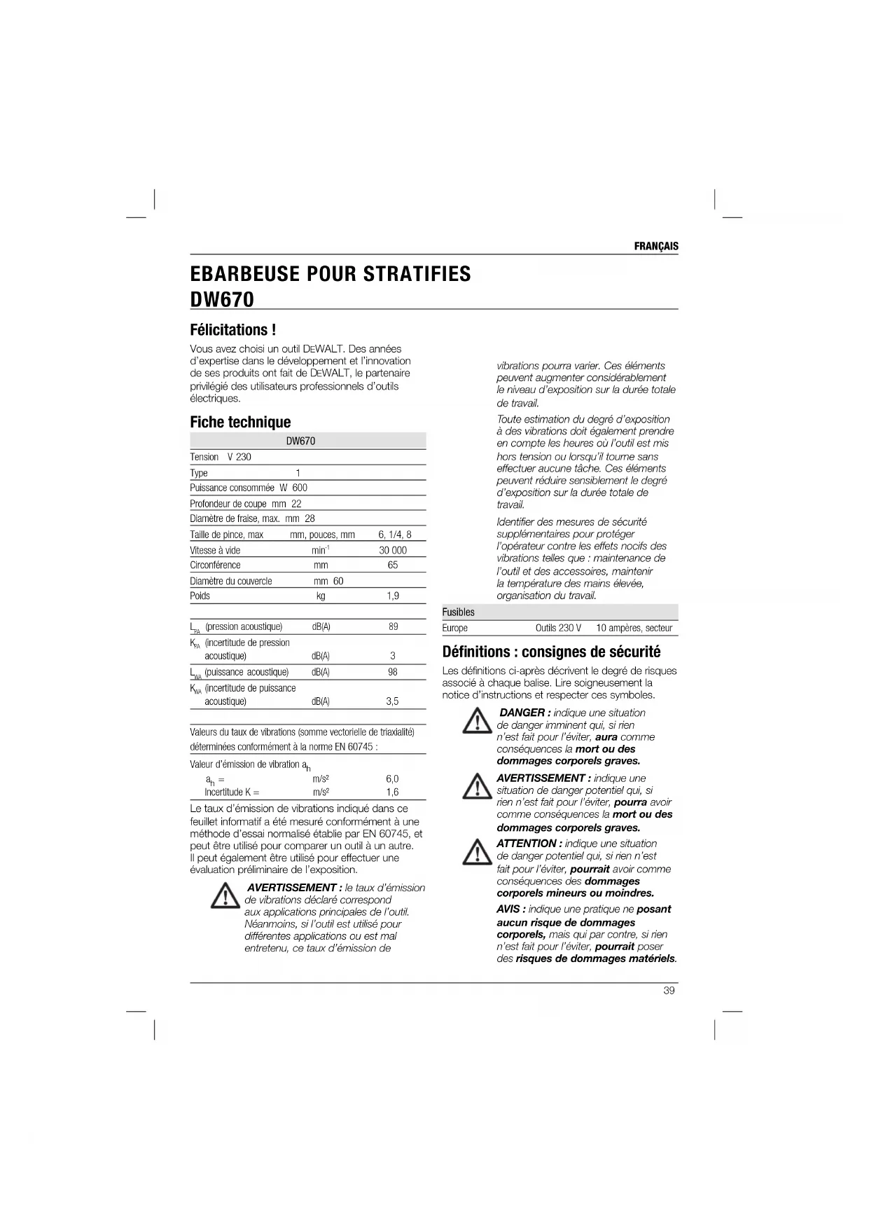 DW670 Félicitations ! Vous avez choisi un outil DEWALT. Des années d’expertise dans le développement et l’innovation de ses produits ont fait de D EWALT, le partenaire privilégié des utilisateurs professionnels d’outils électriques. Fiche technique DW670 Tension V 230 Type 1 Puissance consommée W 600 Profondeur de coupe mm 22 Diamètre de fraise, max. mm 28 Taille de pince, max mm, pouces, mm 6, 1/4, 8 Vitesse à vide min