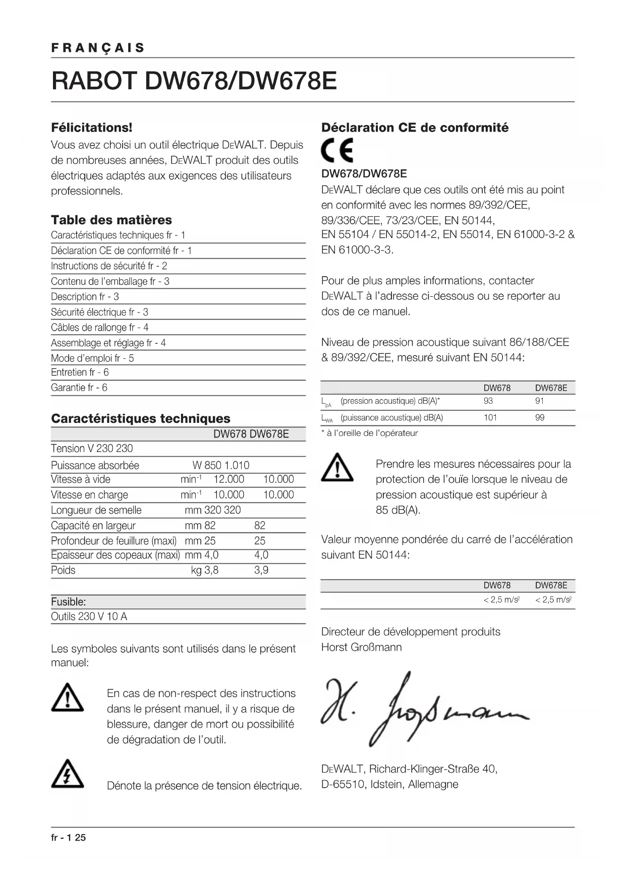 Longueur de semelle mm 320 320 Capacité en largeur mm 82 82 Profondeur de feuillure (maxi) mm 25 25 Epaisseur des copeaux (maxi) mm 4,0 4,0 Poids kg 3,8 3,9 Fusible: Outils 230 V 10 A Les symboles suivants sont utilisés dans le présent manuel: En cas de non-respect des instructions dans le présent manuel, il y a risque de blessure, danger de mort ou possibilité de dégradation de l’outil. Dénote la présence de tension électrique. Déclaration CE de conformité DW678/DW678E DEWALT déclare que ces outils ont été mis au point en conformité avec les normes 89/392/CEE, 89/336/CEE, 73/23/CEE, EN 50144, EN 55104 / EN 55014-2, EN 55014, EN 61000-3-2 & EN 61000-3-3. Pour de plus amples informations, contacter DEWALT à l’adresse ci-dessous ou se reporter au dos de ce manuel. Niveau de pression acoustique suivant 86/188/CEE & 89/392/CEE, mesuré suivant EN 50144: DW678 DW678E