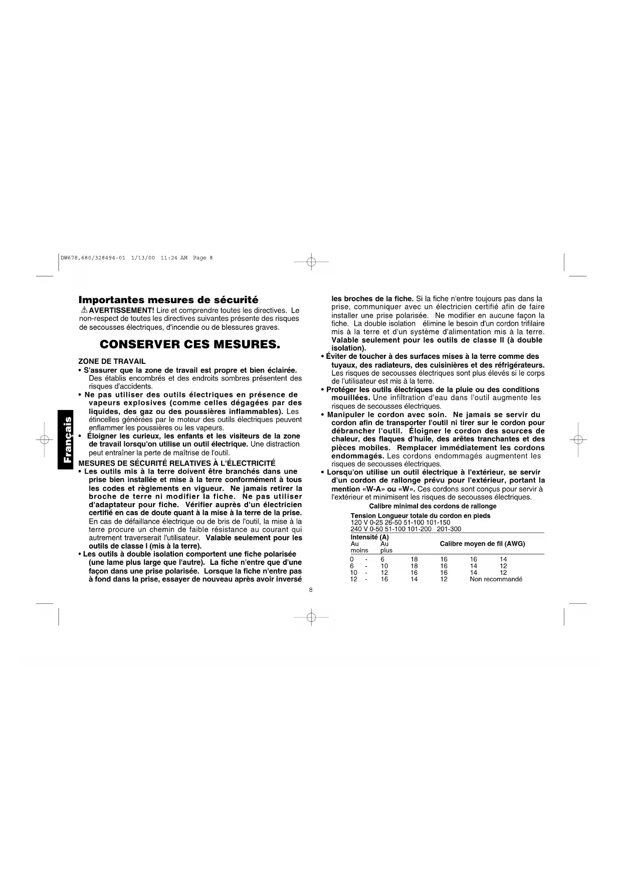 See ‘Tools-Electric’ – Yellow Pages – for Service & Sales DW678,680/328494-01 1/13/00 11:24 AM Page 78 Français Importantes mesures de sécurité AVERTISSEMENT! Lire et comprendre toutes les directives. Le non-respect de toutes les directives suivantes présente des risques de secousses électriques, d'incendie ou de blessures graves. CONSERVER CES MESURES.
