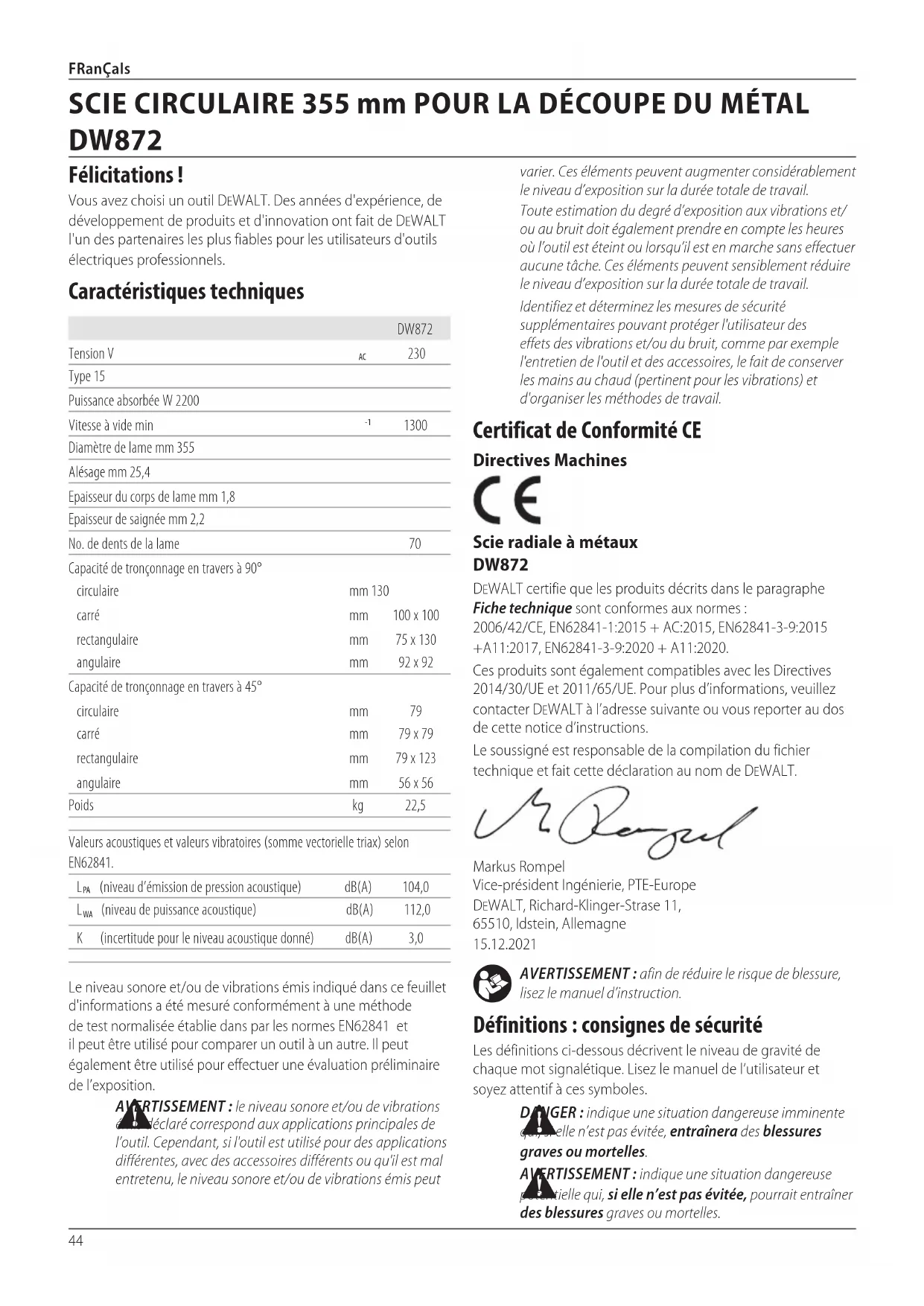Définitions : consignes de sécurité Les définitions ci-dessous décrivent le niveau de gravité de chaque mot signalétique. Lisez le manuel de l’utilisateur et soyez attentif à cessymboles. DANGER : indique une situation dangereuse imminente qui, si elle n’est pas évitée, entraînera des blessures graves oumortelles. AVERTISSEMENT : indique une situation dangereuse potentielle qui, si elle n’est pas évitée, pourrait entraîner des blessures graves oumortelles. Certificat de Conformité CE Directives Machines Scie radiale à métaux DW872 DeWALT certifie que les produits décrits dans le paragraphe Fiche technique sont conformes aux normes: 2006/42/CE, EN62841-1:2015 + AC:2015, EN62841-3-9:2015 +A11:2017, EN62841-3-9:2020 + A11:2020.Ces produits sont également compatibles avec les Directives 2014/30/UE et 2011/65/UE. Pour plus d’informations, veuillez contacter DeWALT à l’adresse suivante ou vous reporter au dos de cette notice d’instructions.Le soussigné est responsable de la compilation du fichier technique et fait cette déclaration au nom deDeWALT.Markus Rompel Vice-président Ingénierie, PTE-Europe DeWALT, Richard-Klinger-Strase 11, 65510, Idstein, Allemagne 15.12.2021Le niveau sonore et/ou de vibrations émis indiqué dans ce feuillet d'informations a été mesuré conformément à une méthode de test normalisée établie dans par les normes EN62841