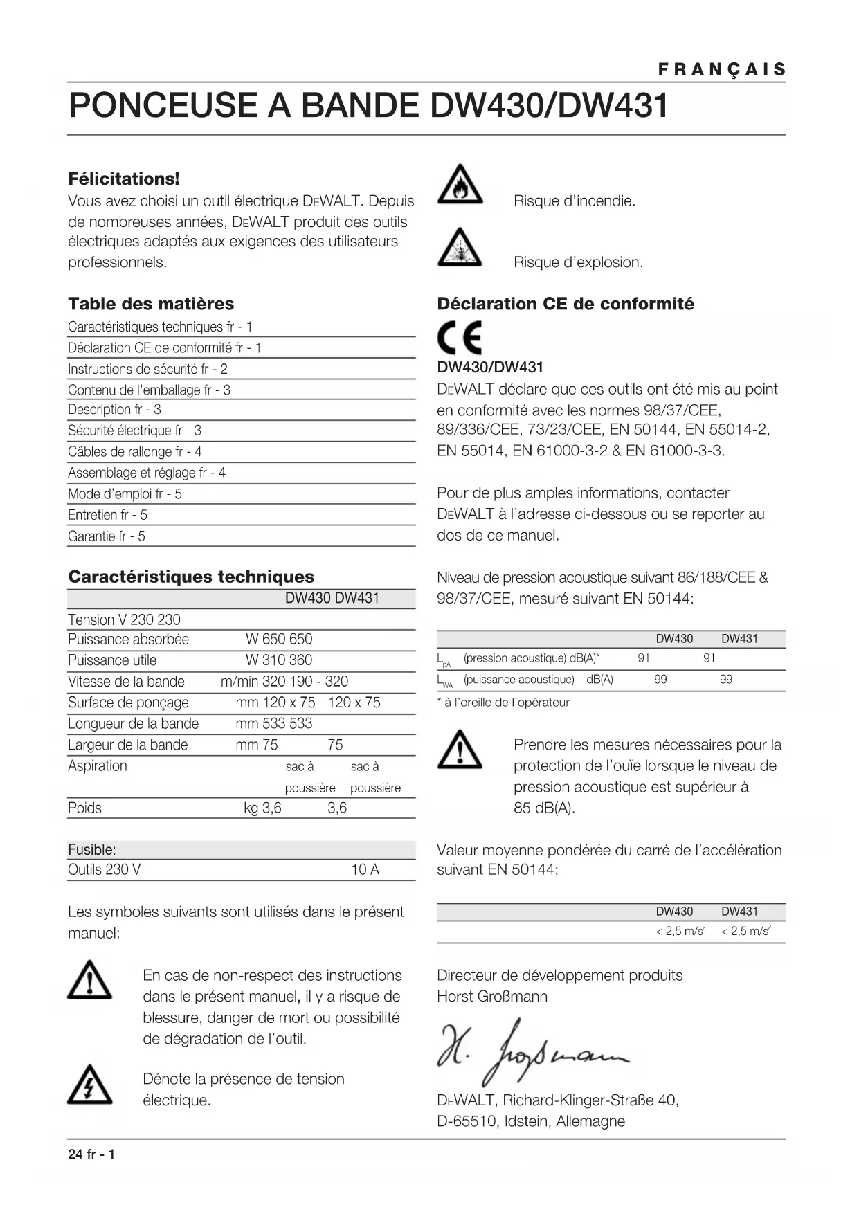 Félicitations! Vous avez choisi un outil électrique DEWALT. Depuis de nombreuses années, DEWALT produit des outils électriques adaptés aux exigences des utilisateurs professionnels. Table des matières Caractéristiques techniques fr - 1 Déclaration CE de conformité fr - 1 Instructions de sécurité fr - 2 Contenu de l’emballage fr - 3 Description fr - 3 Sécurité électrique fr - 3 Câbles de rallonge fr - 4 Assemblage et réglage fr - 4 Mode d’emploi fr - 5 Entretien fr - 5 Garantie fr - 5 Caractéristiques techniques DW430 DW431 Tension V 230 230 Puissance absorbée W 650 650 Puissance utile W 310 360 Vitesse de la bande m/min 320 190 - 320 Surface de ponçage mm 120 x 75 120 x 75 Longueur de la bande mm 533 533 Largeur de la bande mm 75 75 Aspiration sac à sac à poussière poussière Poids kg 3,6 3,6 Fusible: Outils 230 V 10 A Les symboles suivants sont utilisés dans le présent manuel: En cas de non-respect des instructions dans le présent manuel, il y a risque de blessure, danger de mort ou possibilité de dégradation de l’outil. Dénote la présence de tension électrique. Risque d’incendie. Risque d’explosion. Déclaration CE de conformité DW430/DW431 DEWALT déclare que ces outils ont été mis au point en conformité avec les normes 98/37/CEE, 89/336/CEE, 73/23/CEE, EN 50144, EN 55014-2, EN 55014, EN 61000-3-2 & EN 61000-3-3. Pour de plus amples informations, contacter DEWALT à l’adresse ci-dessous ou se reporter au dos de ce manuel. Niveau de pression acoustique suivant 86/188/CEE & 98/37/CEE, mesuré suivant EN 50144: DW430 DW431