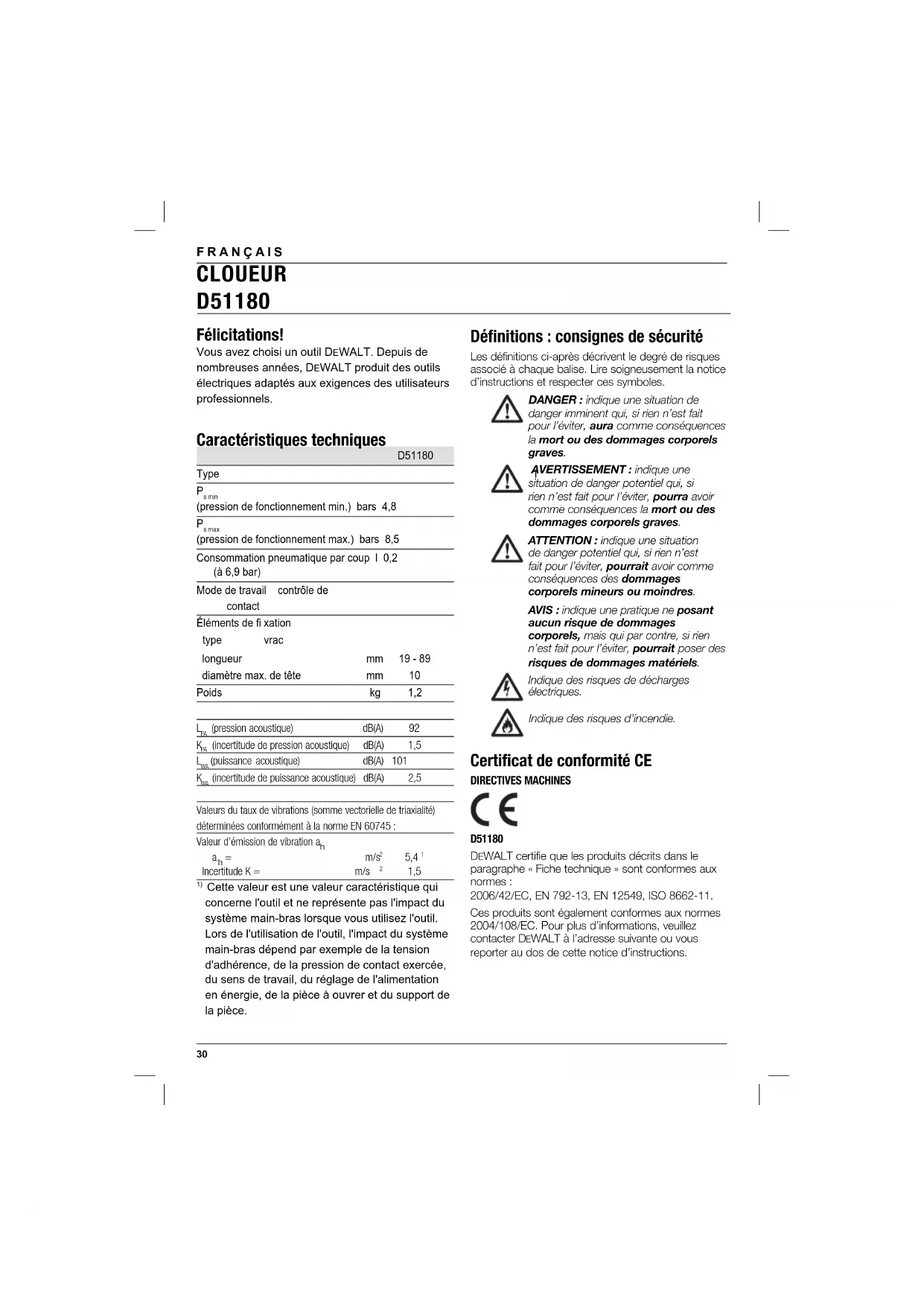 situation de danger potentiel qui, si rien n’est fait pour l’éviter, pourra avoir comme conséquences la mort ou des dommages corporels graves. ATTENTION: indique une situation de danger potentiel qui, si rien n’est fait pour l’éviter, pourrait avoir comme conséquences des dommages corporels mineurs ou moindres. AVIS: indique une pratique ne posant aucun risque de dommages corporels, mais qui par contre, si rien n’est fait pour l’éviter, pourrait poser des risques de dommages matériels. Indique des risques de décharges électriques. Indique des risques d’incendie. Certifi cat de conformité CE DIRECTIVES MACHINES D51180 DEWALT certifie que les produits décrits dans le paragraphe «Fiche technique» sont conformes aux normes: 2006/42/EC, EN 792-13, EN 12549, ISO 8662-11. Ces produits sont également conformes aux normes 2004/108/EC. Pour plus d’informations, veuillez contacter D EWALT à l’adresse suivante ou vous reporter au dos de cette notice d’instructions.31 FRANÇAIS Le soussigné est responsable de la compilation du fichier technique et fait cette déclaration au nom de DEWALT. Horst Grossmann Vice Président de l’Ingénierie et du développement produit DEWALT, Richard-Klinger-Straße 11, D-65510, Idstein, Allemagne