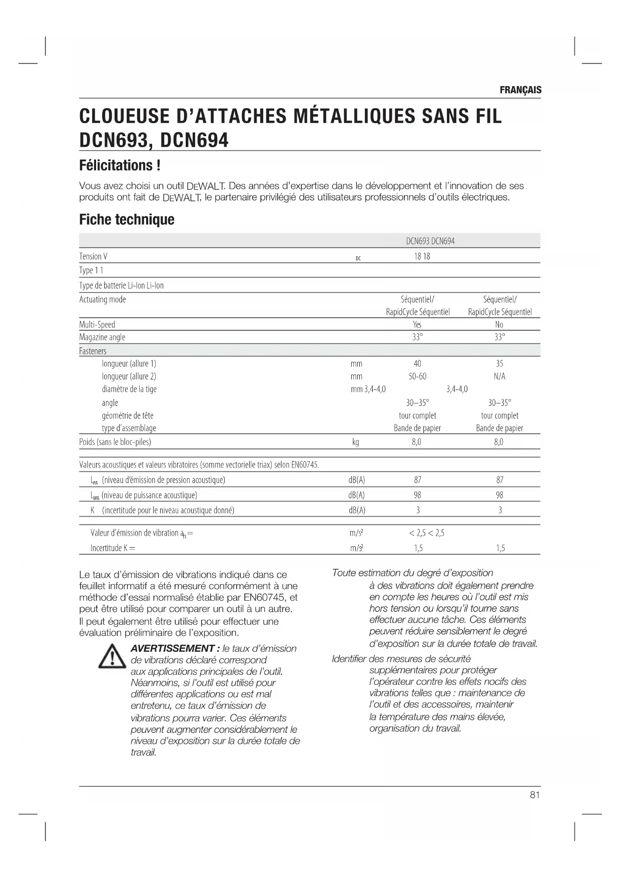 de vibrations déclaré correspond aux applications principales de l’outil. Néanmoins, si l’outil est utilisé pour différentes applications ou est mal entretenu, ce taux d’émission de vibrations pourra varier. Ces éléments peuvent augmenter considérablement le niveau d’exposition sur la durée totale de travail. Vous avez choisi un outil DeWALT . Des années d’expertise dans le développement et l’innovation de ses produits ont fait de DeWALT , le partenaire privilégié des utilisateurs professionnels d’outils électriques. Fiche technique DCN693 DCN694 Tension V