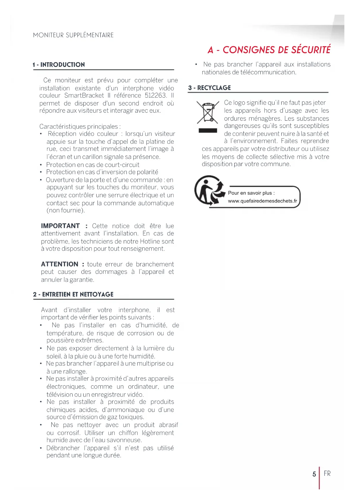 Pour installer et utiliser votre moniteur supplémentaire, reportez-vous à la notice de l'interphone vidéo couleur SmartBracket ll référence 512263 pour lequel le produit est prévu.9