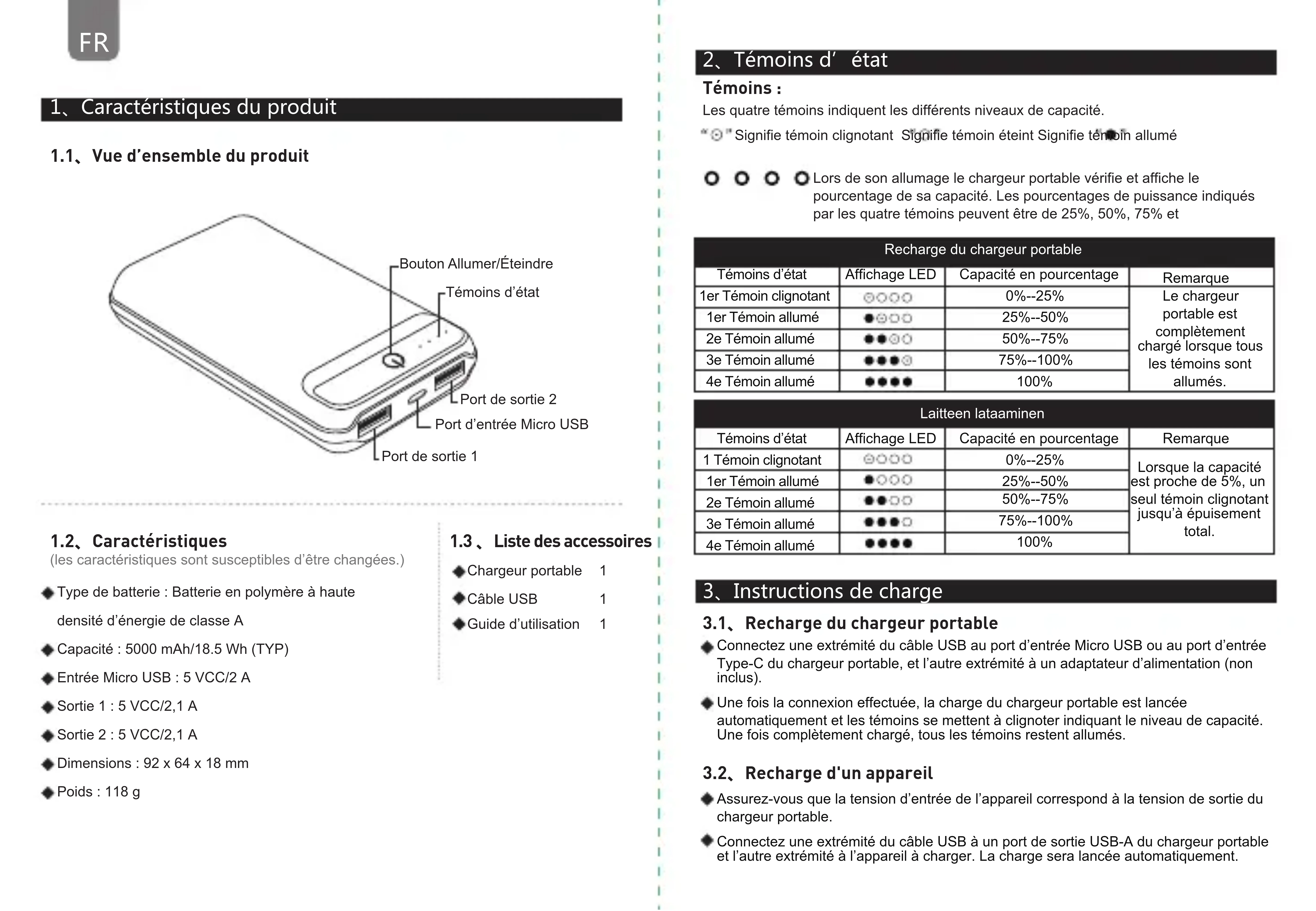 1、Caractéristiques du produit 1.1、Vue d’ensemble du produit 1.2、Caractéristiques Chargeur portable Câble USB Guide d’utilisation