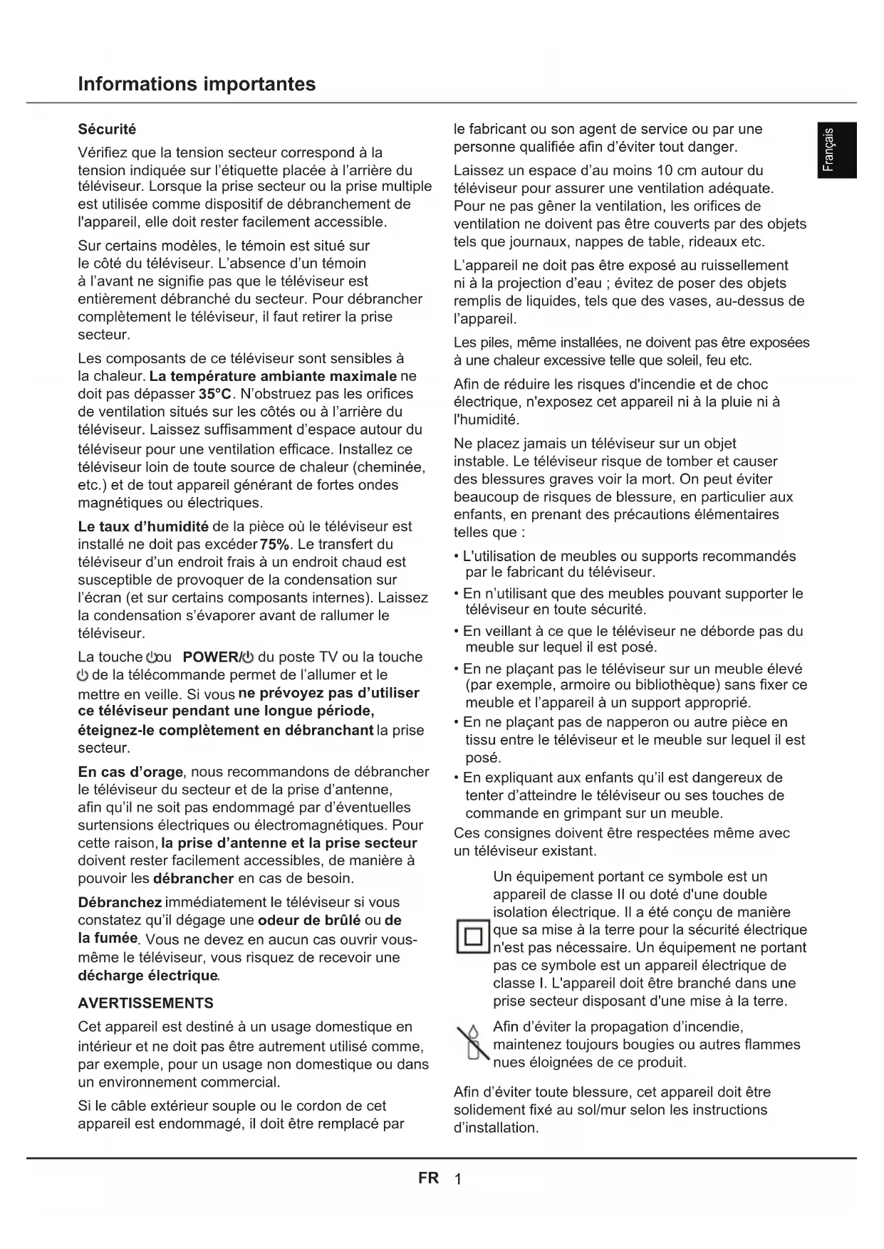 - En expliquant aux enfants qu’il est dangereux de tenter d’atteindre le téléviseur ou ses touches de commande en grimpant sur un meuble. Ces consignes doivent être respectées même avec un téléviseur existant. Un équipement portant ce symbole est un appareil de classe II ou doté d'une double isolation électrique. Il a été conçu de manière que sa mise à la terre pour la sécurité électrique n'est pas nécessaire. Un équipement ne portant pas ce symbole est un appareil électrique de classe I. L'appareil doit être branché dans une prise secteur disposant d'une mise à la terre. An d’éviter la propagation d’incendie, maintenez toujours bougies ou autres ammes nues éloignées de ce produit. An d’éviter toute blessure, cet appareil doit être solidement xé au sol/mur selon les instructions d’installation. Informations importantesFR
