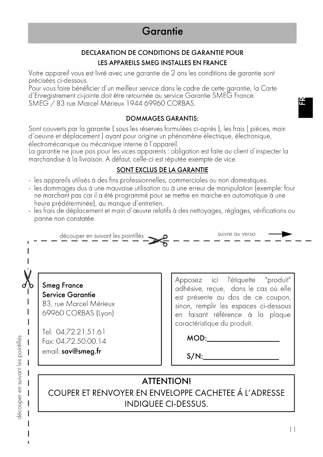 découper en suivant les pointillésdécouper en suivant les pointilléssuivre au verso FRFR DECLARATION DE CONDITIONS DE GARANTIE POURLES APPAREILS SMEG INSTALLES EN FRANCEVotre appareil vous est livré avec une garantie de 2 ans les conditions de garantie sont précisées ci-dessous.Pour vous faire bénéficier d’un meilleur service dans le cadre de cette garantie, la Carte d’Enregistrement ci-jointe doit être retournée au service Garantie SMEG France. SMEG / 83 rue Marcel Mérieux 1944 69960 CORBAS.DOMMAGES GARANTIS: Sont couverts par la garantie ( sous les réserves formulées ci-après ), les frais ( pièces, main d’oeuvre et déplacement ) ayant pour origine un phénomène électrique, électronique, électromécanique ou mécanique interne à l’appareil.La garantie ne joue pas pour les vices apparents : obligation est faite au client d’inspecter la marchandise à la livraison. A défaut, celle-ci est réputée exempte de vice.SONT EXCLUS DE LA GARANTIE- les appareils utilisés à des fins professionnelles, commerciales ou non domestiques. - les dommages dus à une mauvaise utilisation ou à une erreur de manipulation (exemple: four ne marchant pas car il a été programmé pour se mettre en marche en automatique à une heure prédéterminée), au manque d’entretien. - les frais de déplacement et main d’œuvre relatifs à des nettoyages, réglages, vérifications ou panne non constatée. Smeg France Service Garantie 83, rue Marcel Mérieux 69960 CORBAS (Lyon) Tel: 04.72.21.51.61 Fax: 04.72.50.00.14 email: sav@smeg.fr Apposez ici l'étiquette "produit" adhésive, reçue, dans le cas où elle est présente au dos de ce coupon, sinon, remplir les espaces ci-dessous en faisant référence à la plaque caractéristique du produit. MOD:_______________________ S/N:________________________ ATTENTION! COUPER ET RENVOYER EN ENVELOPPE CACHETEE Á L’ADRESSE INDIQUEE CI-DESSUS.Garantie