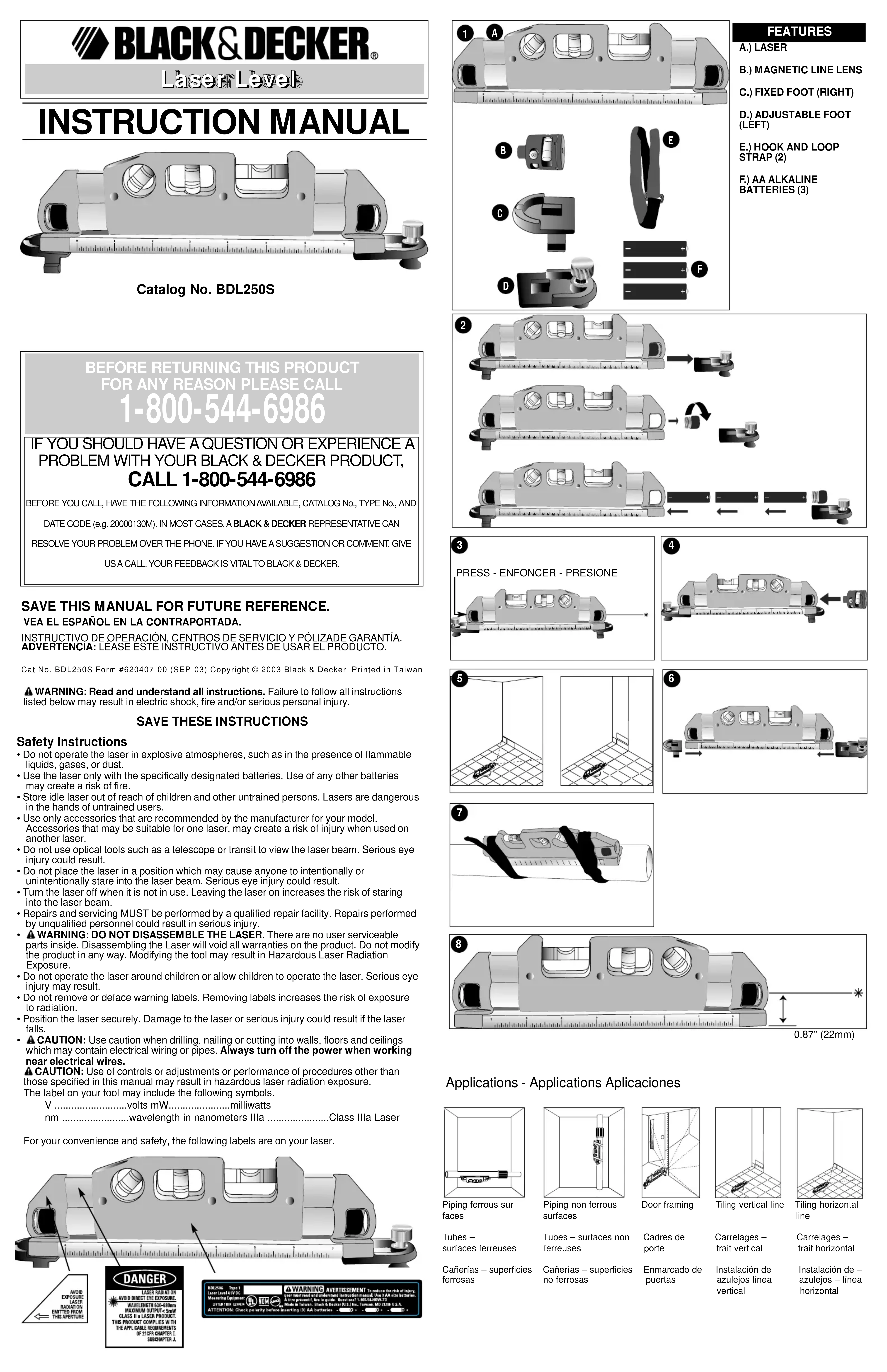 Retrouvez gratuitement la notice de l'appareil BDL250S BLACK & DECKER au format PDF.