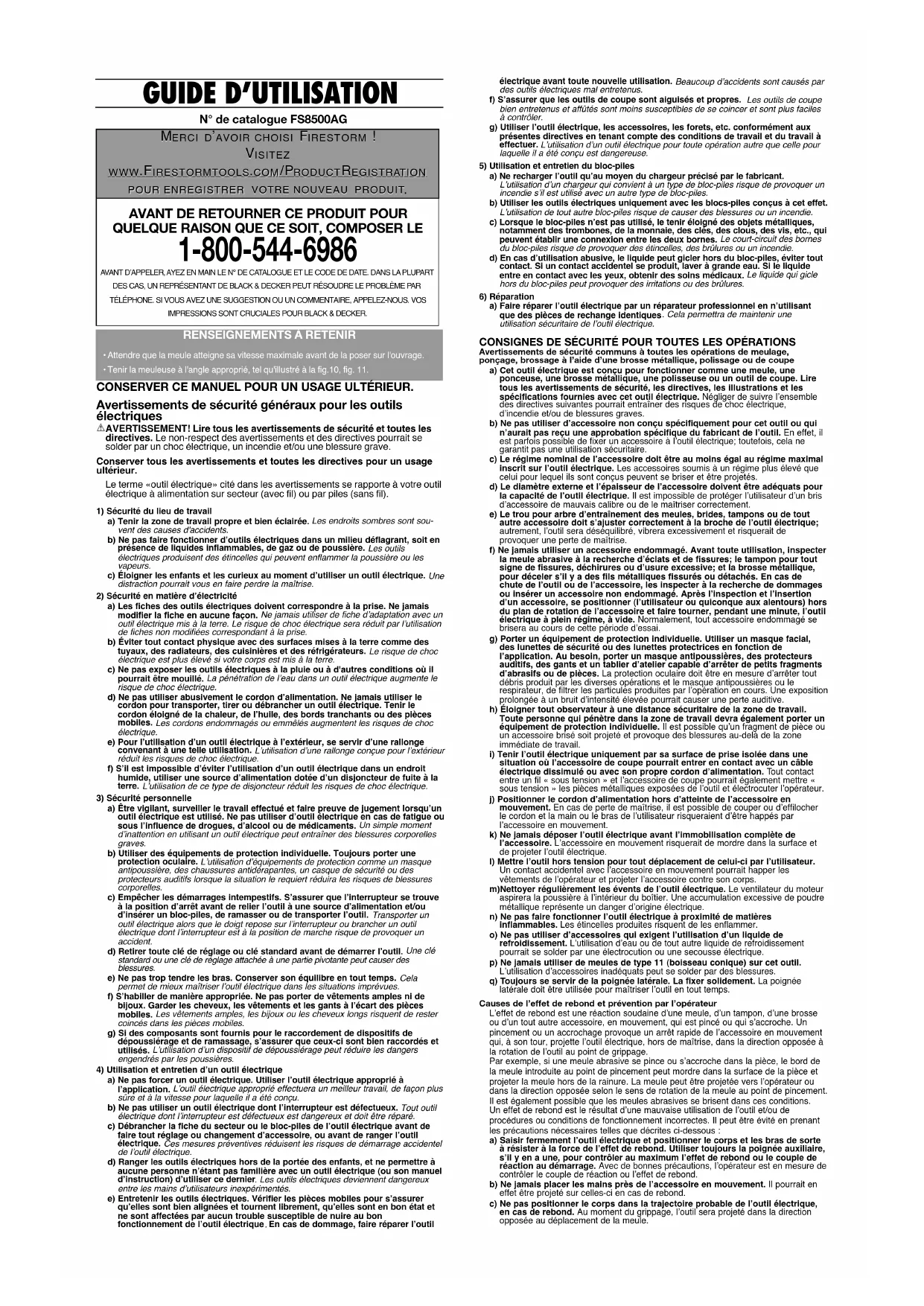 danger. Renseignements relatifs au service Black & Decker offre un réseau complet de centres de service autorisés ou lui appartenant d'un bout à l'autre de l'Amérique du Nord. Tous les centres de service Black & Decker emploient du personnel formé pour assurer un service fiable et efficace aux utilisateurs d'outils électriques. Qu'on ait besoin de conseils techniques, de réparations ou de pièces de rechange sorties tout droit de l'usine, il suffit de communiquer avec le centre Black & Decker le plus proche. Pour le trouver, consulter les pages jaunes sous la rubrique « Outils » ou composer le 1-800-544-6986. Garantie complète de deux ans pour usage residentiel Black & Decker (U.S.) Inc. garantit ce produit pour une période de deux ans contre tout défaut de matériel ou de fabrication. Le produit défectueux sera réparé sans frais, suivant l’un des deux modes suivants. Le premier mode consiste en un échange seulement. On doit retourner le produit au détaillant qui l’a vendu (pourvu qu’il s’agisse d’un détaillant participant), en respectant les délais stipulés dans sa politique d'échange (normalement de 30 à 90 jours après la vente). Une preuve d’achat peut être requise. On doit vérifier la politique de retour du détaillant pour tout produit retourné après le délai prescrit pour les échanges. Le deuxième mode consiste à emporter ou à envoyer le produit (prépayé) à un centre Black & Decker ou à un centre de service autorisé, pour réparation ou remplacement, selon notre choix. Une preuve d’achat peut être requise. Les centres Black & Decker et les centres de service autorisés figurent dans les pages jaunes sous la rubrique « Outils ». Cette garantie ne s’applique pas aux accessoires. Elle confère des droits légaux particuliers à l’acheteur, en sus des autres droits provinciaux dont il pourrait bénéficier. Pour tout renseignement, s'adresser au gérant du centre Black & Decker le plus proche. Ce produit n’est pas destiné à un usage commercial. REMPLACEMENT GRATUIT DE L’ÉTIQUETTE D’AVERTISSEMENT : En cas de perte ou d’endommagement des étiquettes d’avertissement, composer le 1 800 544-6986 afin d’en obtenir de nouvelles sans frais. Remarque à l’intention des entrepreneurs concernant la garantie spéciale Les produits de marque FIRESTORM