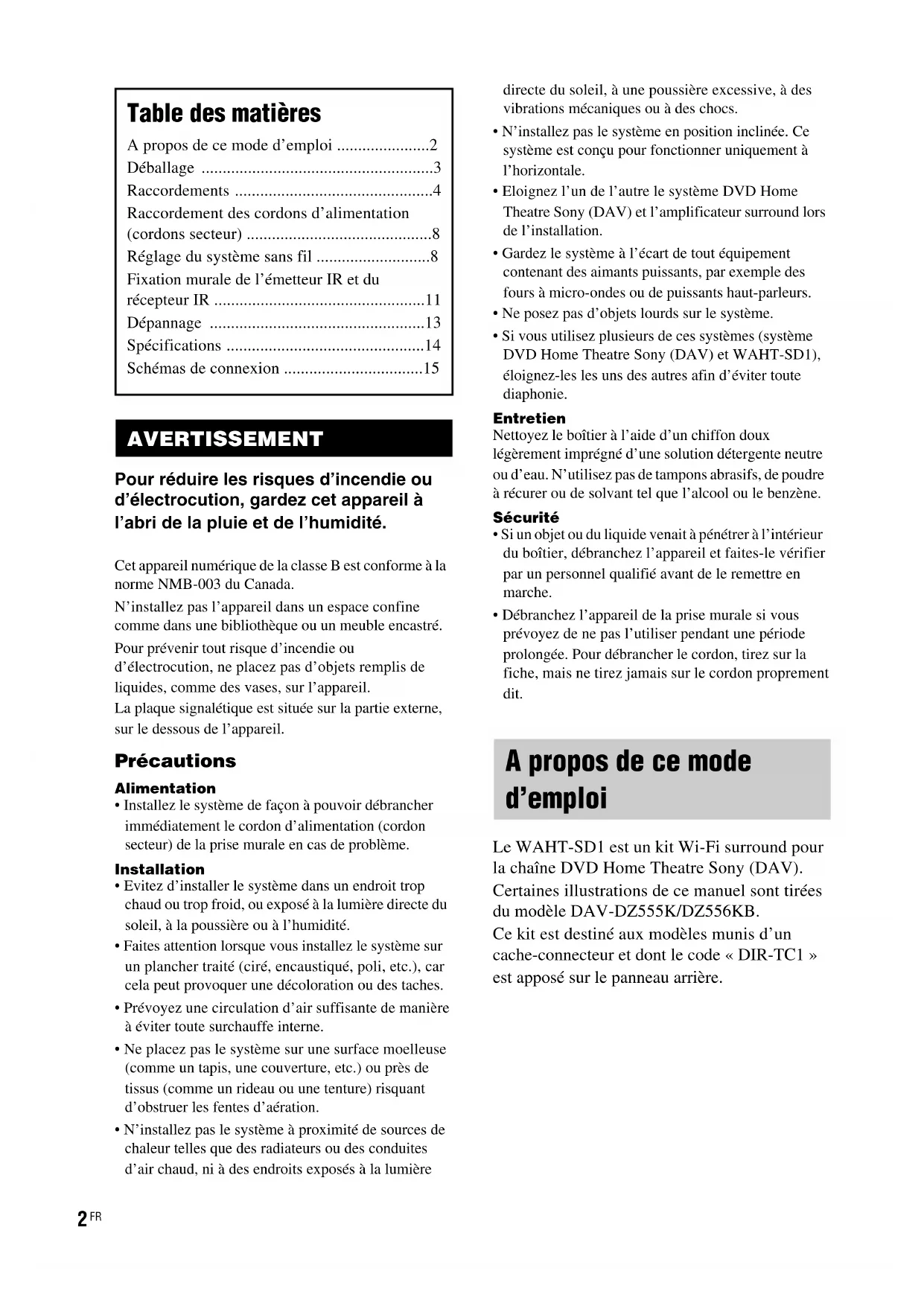 Le WAHT-SD1 est un kit Wi-Fi surround pour la chaîne DVD Home Theatre Sony (DAV). Certaines illustrations de ce manuel sont tirées du modèle DAV-DZ555K/DZ556KB.