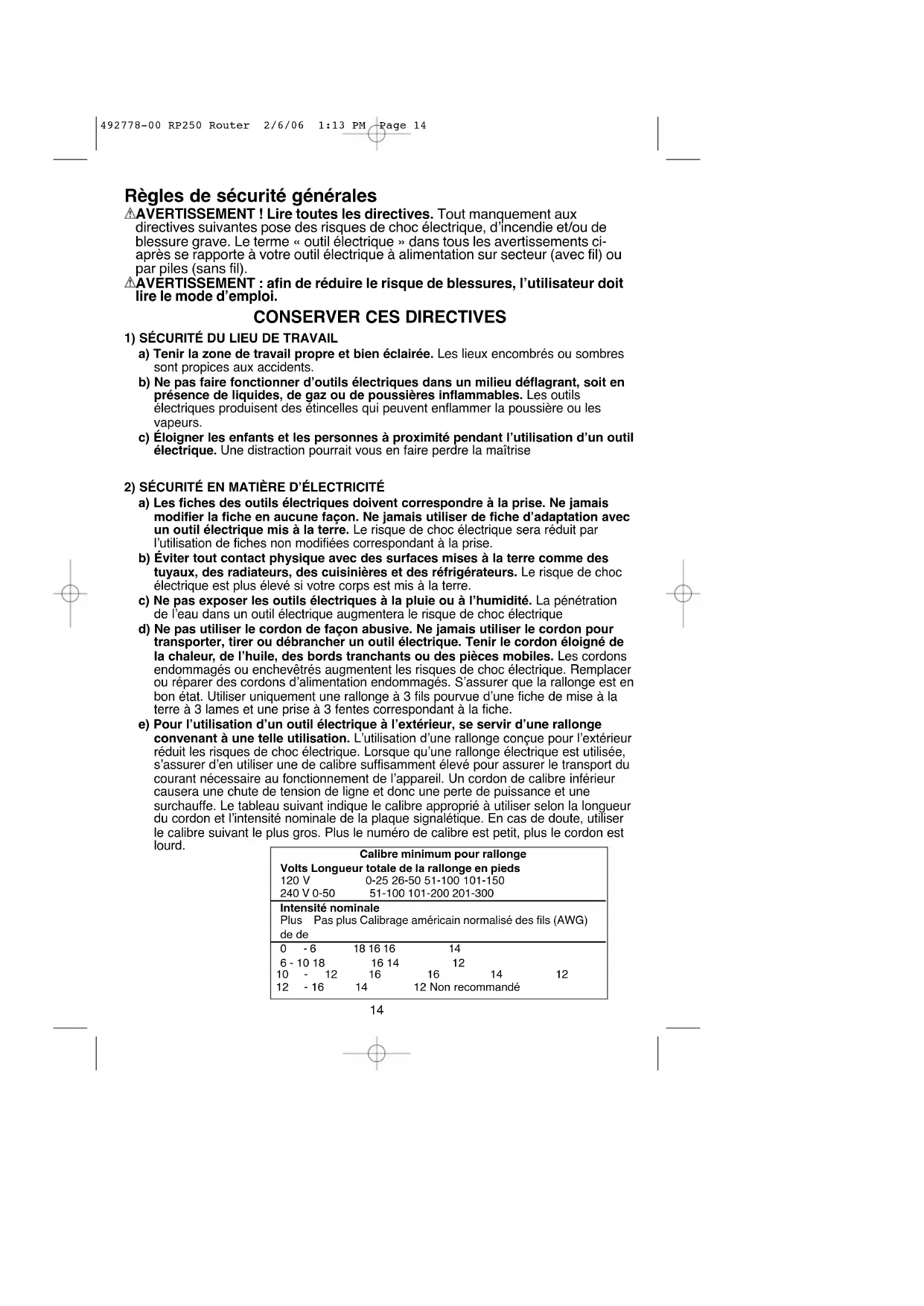a) Ne pas forcer un outil électrique. Utiliser l’outil électrique approprié à l’application. L’outil électrique approprié effectuera un meilleur travail, de façon plus sûre et à la vitesse pour laquelle il a été conçu. b) Ne pas utiliser un outil électrique dont l’interrupteur est défectueux. Tout outil électrique dont l’interrupteur est défectueux est dangereux et doit être réparé. c) Débrancher la fiche du secteur et/ou du bloc-piles de l’outil électrique avant de faire tout réglage ou changement d’accessoire, ou avant de ranger ce dernier. Ces mesures préventives réduisent les risques de démarrage accidentel de l’outil électrique. d) Ranger les outils électriques hors de la portée des enfants, et ne permettre à aucune personne n’étant pas familière avec un outil électrique ou son mode d’emploi d’utiliser ce dernier. Les outils électriques deviennent dangereux entre les mains d’utilisateurs inexpérimentés. e) Entretenir les outils électriques. Vérifier si les pièces mobiles sont mal alignées ou coincées, si des pièces sont brisées ou présentent toute autre condition susceptible de nuire au bon fonctionnement de l’outil électrique. En cas de dommage, faire réparer l’outil électrique avant toute nouvelle utilisation. Beaucoup d’accidents sont causés par des outils électriques mal entretenus. f) S’assurer que les outils de coupe sont aiguisés et propres. Les outils de coupe bien entretenus et affûtés sont moins susceptibles de se coincer et sont plus faciles à contrôler. g) Utiliser l’outil électrique, les accessoires, les mèches, etc., conformément aux présentes directives et suivant la manière prévue pour ce type particulier d’outil électrique, en tenant compte des conditions de travail et du travail à effectuer. L’utilisation d’un outil électrique pour toute opération autre que celle pour laquelle il a été conçu est dangereuse. 492778-00 RP250 Router 2/6/06 1:13 PM Page 155) RÉPARATION a) Faire réparer l’outil électrique par un réparateur professionnel en n’utilisant que des pièces de rechange identiques. Cela permettra de maintenir une utilisation sécuritaire de l’outil électrique. b) S’il faut remplacer le cordon d’alimentation, ceci doit être fait par le fabricant ou son agent pour éviter tout risque d’accident. RÈGLES DE SÉCURITÉ SPÉCIFIQUES AVERTISSEMENT ! Lire toutes les directives. Tout manquement aux directives suivantes pose des risques de choc électrique, d’incendie et/ou de blessure grave.