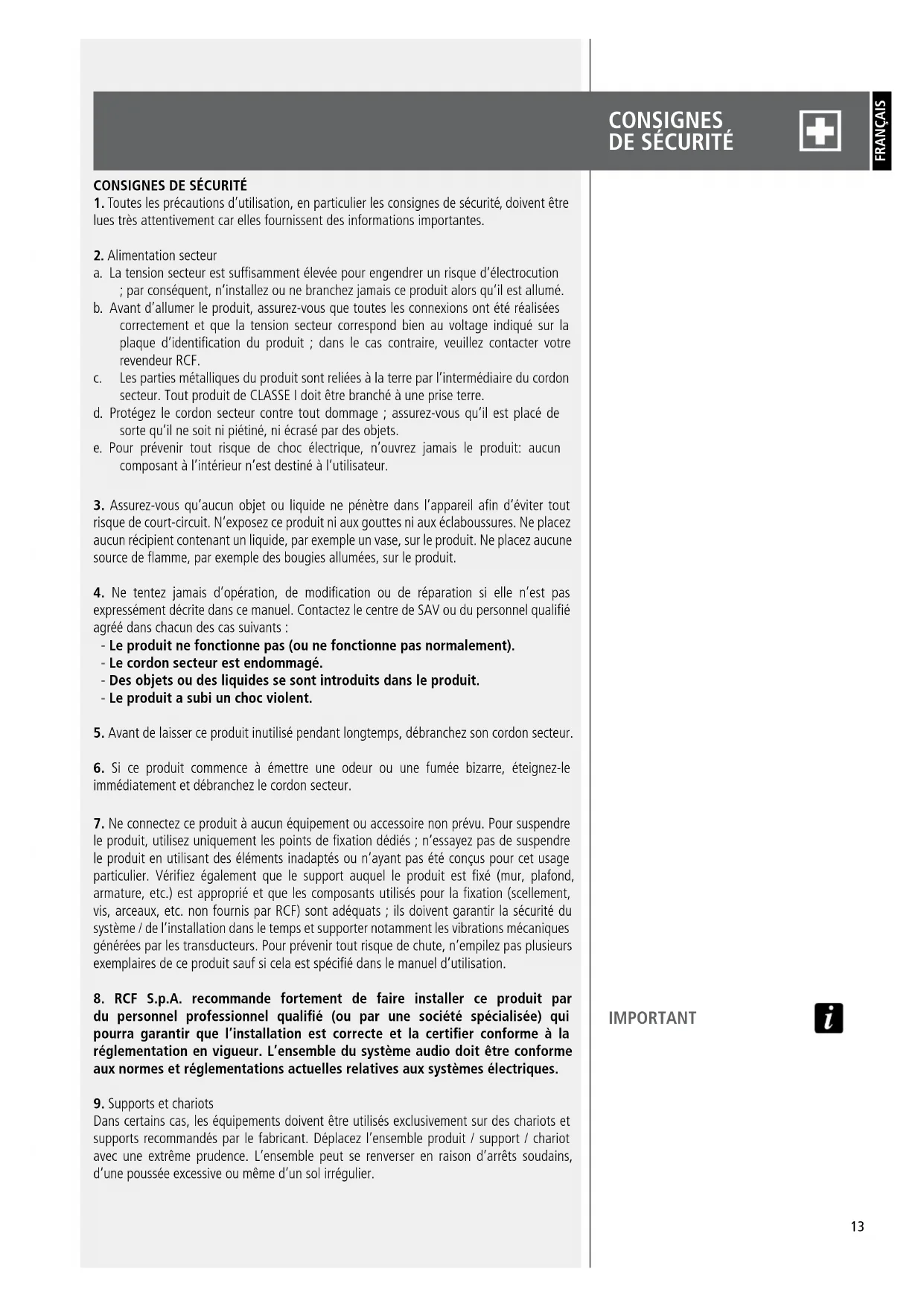 8. RCF S.p.A. recommande fortement de faire installer ce produit par