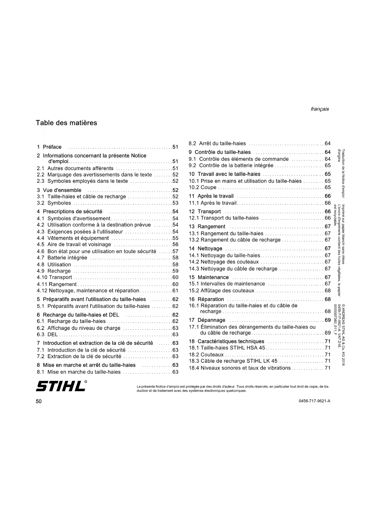 haies – Garder une distance de sécurité entre toute partie du corps et la barre de coupe. Lorsque le couteau est en marche, il ne faut pas essayer d'enlever des branches à la main ou de tenir des branches à couper. Avant d'enlever des branches coincées, il faut impérativement arrêter la machine. Une seconde d'inattention, à l'utilisation du taille-haies, peut occasionner des blessures graves. – Porter le taille-haies par la poignée, avec le couteau arrêté. Pour le transport ou le rangement du taille-haies, toujours monter le protège-couteaux. Utiliser la machine avec précaution afin d'écarter tout risque de blessure par le couteau. – Tenir l'outil électroportatif par les surfaces isolantes des poignées, car il est possible que le couteau entre en contact avec des câbles électriques dissimulés. Si le couteau entre en contact avec un câble sous tension, cela risque de mettre les éléments métalliques de la machine sous tension et de provoquer un choc électrique.Traduzione delle istruzioni per l'uso originaliStampato su carta candeggiata senza cloro.I colori di stampa contengono oli vegetali; la carta è riciclabile.© ANDREAS STIHL AG & Co. KG 20180458-717-9621-A. VA7.D18. 0000007360_011_I 0458-717-9621-A italiano