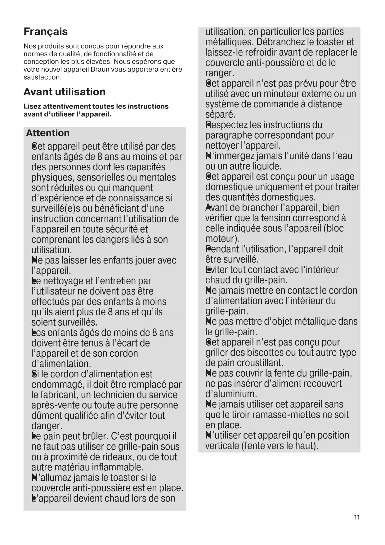 Register now at www.braunhousehold.co.uk By registering we may send you from time to time details on exclusive offers, promotions, recipes and inside tips. 10Français Nos produits sont conçus pour répondre aux normes de qualité, de fonctionnalité et de conception les plus élevées. Nous espérons que votre nouvel appareil Braun vous apportera entière satisfaction. Avant utilisation Lisez attentivement toutes les instructions avant d’utiliser l’appareil. Attention